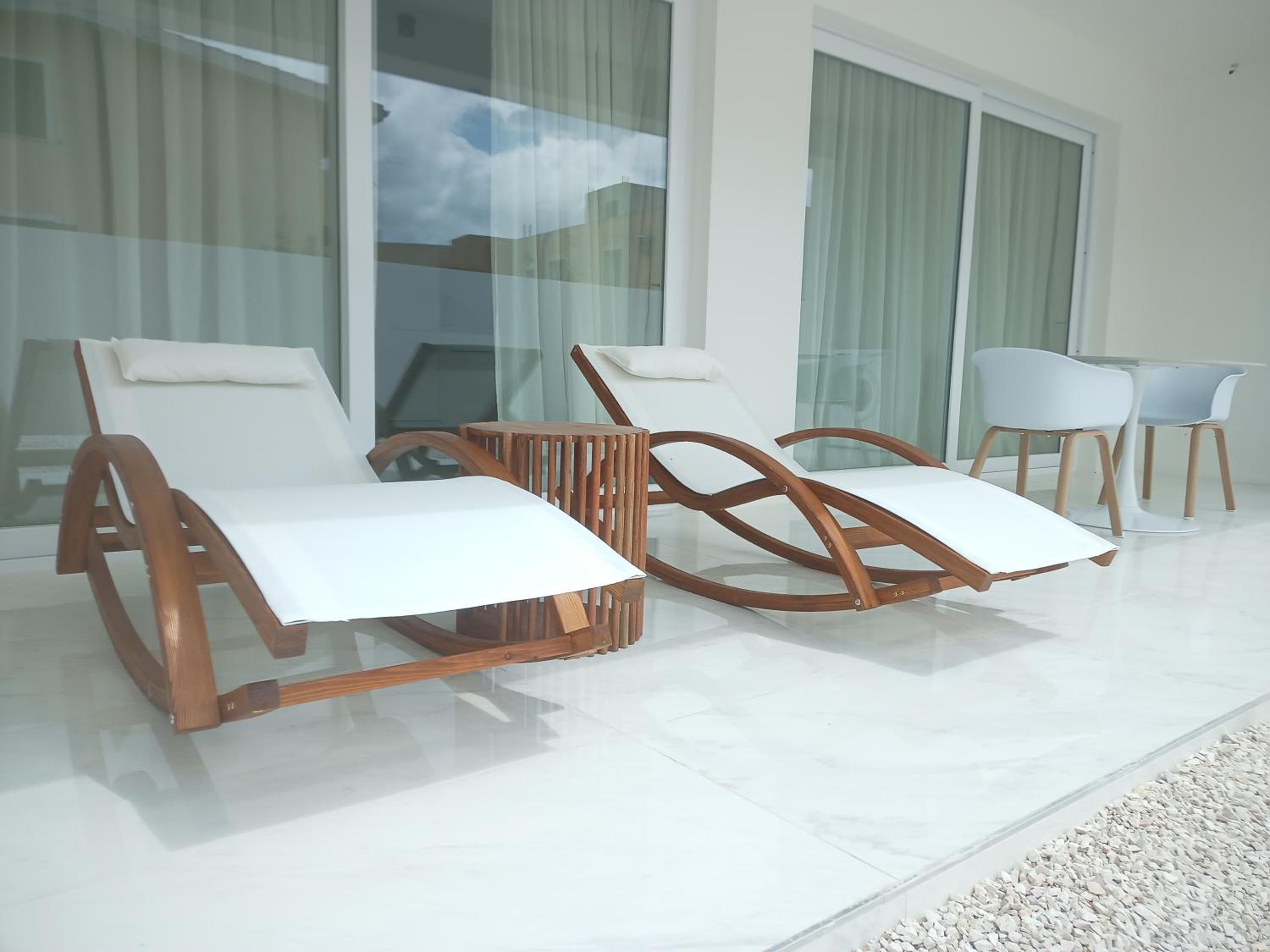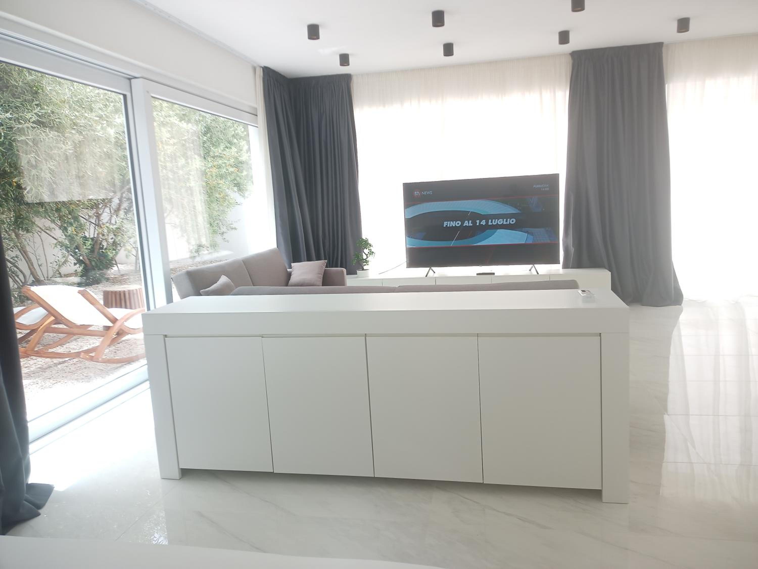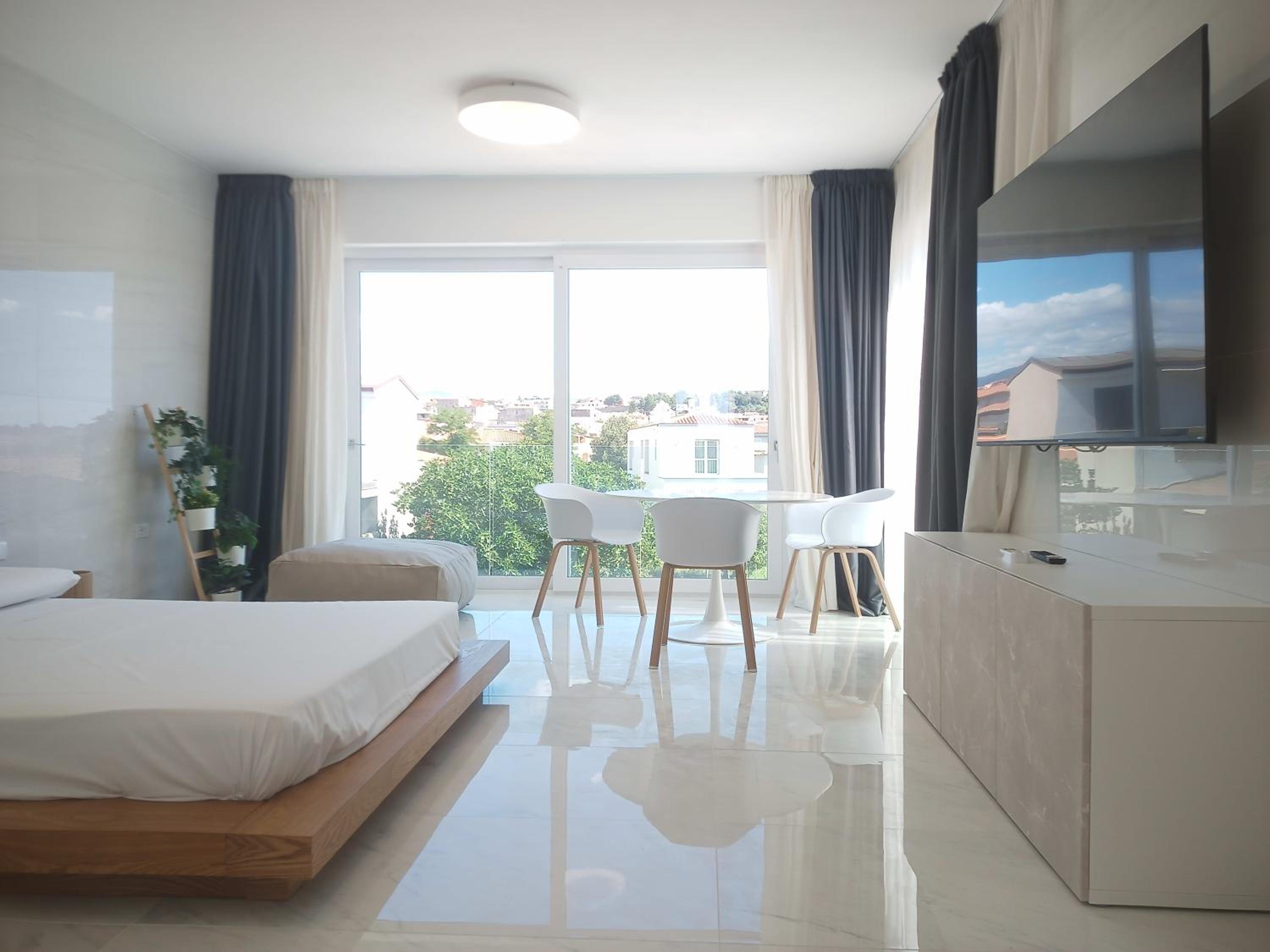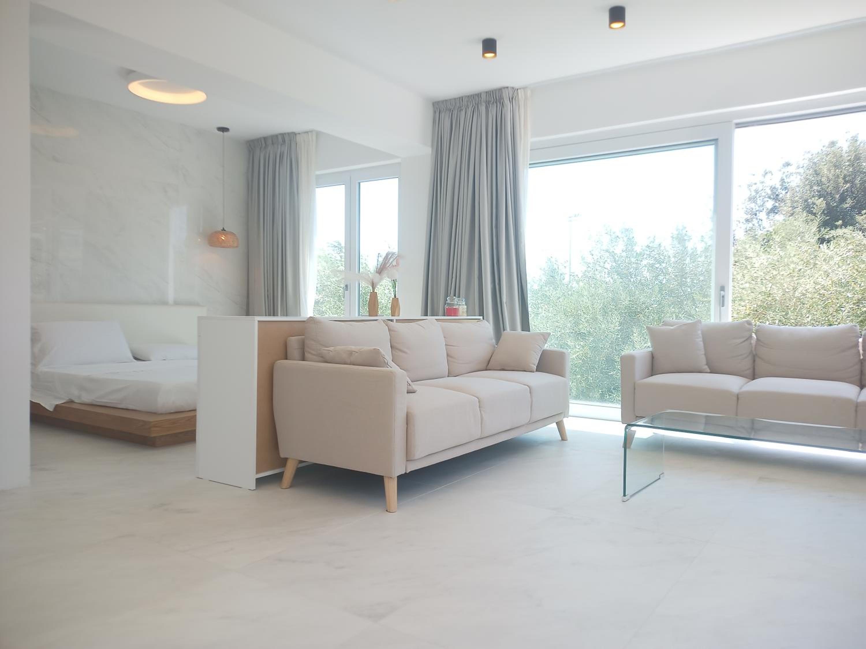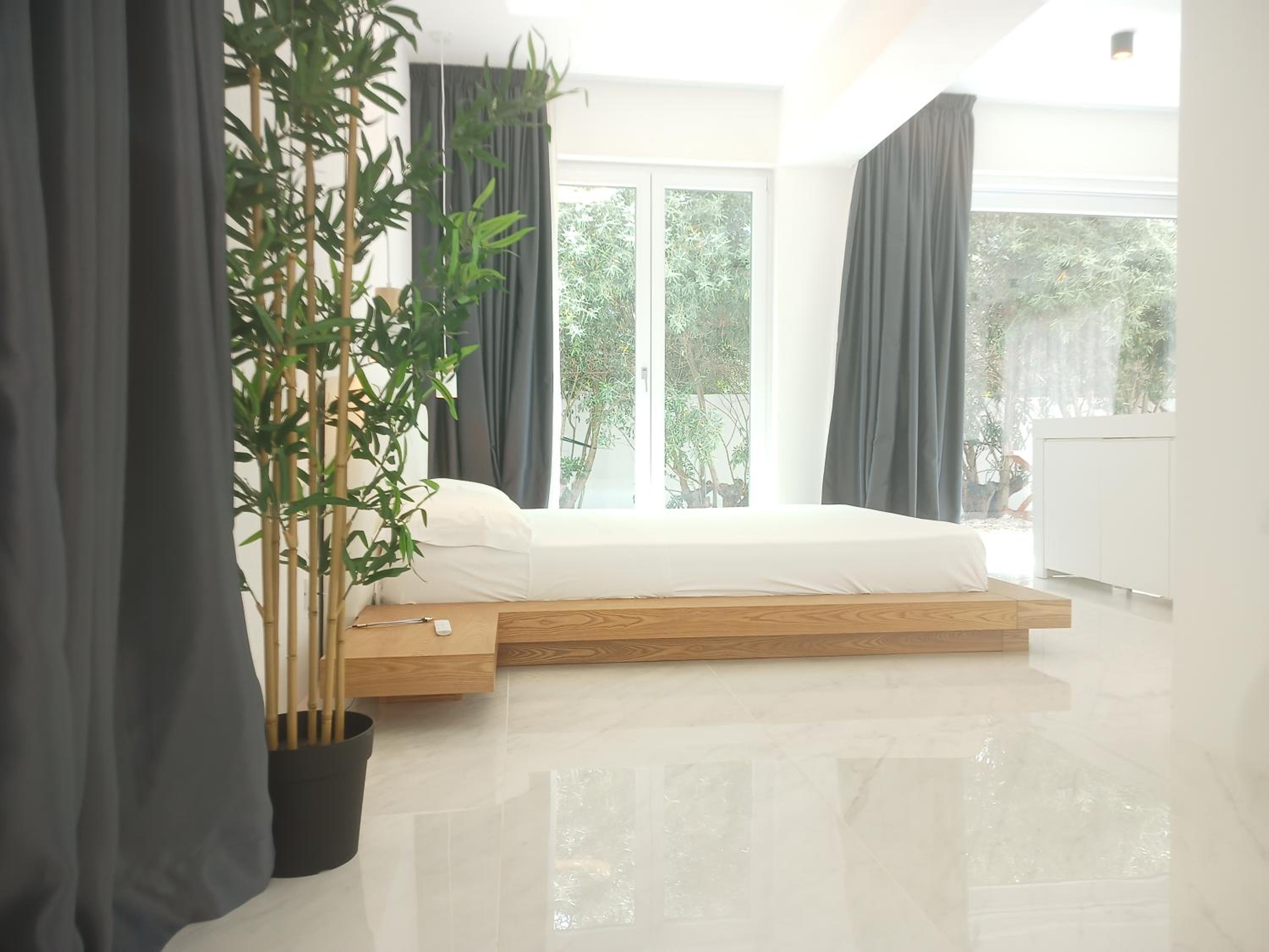 Prachtig ingerichte en ruime kamer met nieuwe materialen en veel wit marmer. Zeer ruime badkamer met rainshower. Alles ‘zorgvuldig gedesignd’. Klein terras met bank en twee ligstoelen. Centrum op 10 minuten lopen. Voor het strand heb je een auto nodig.