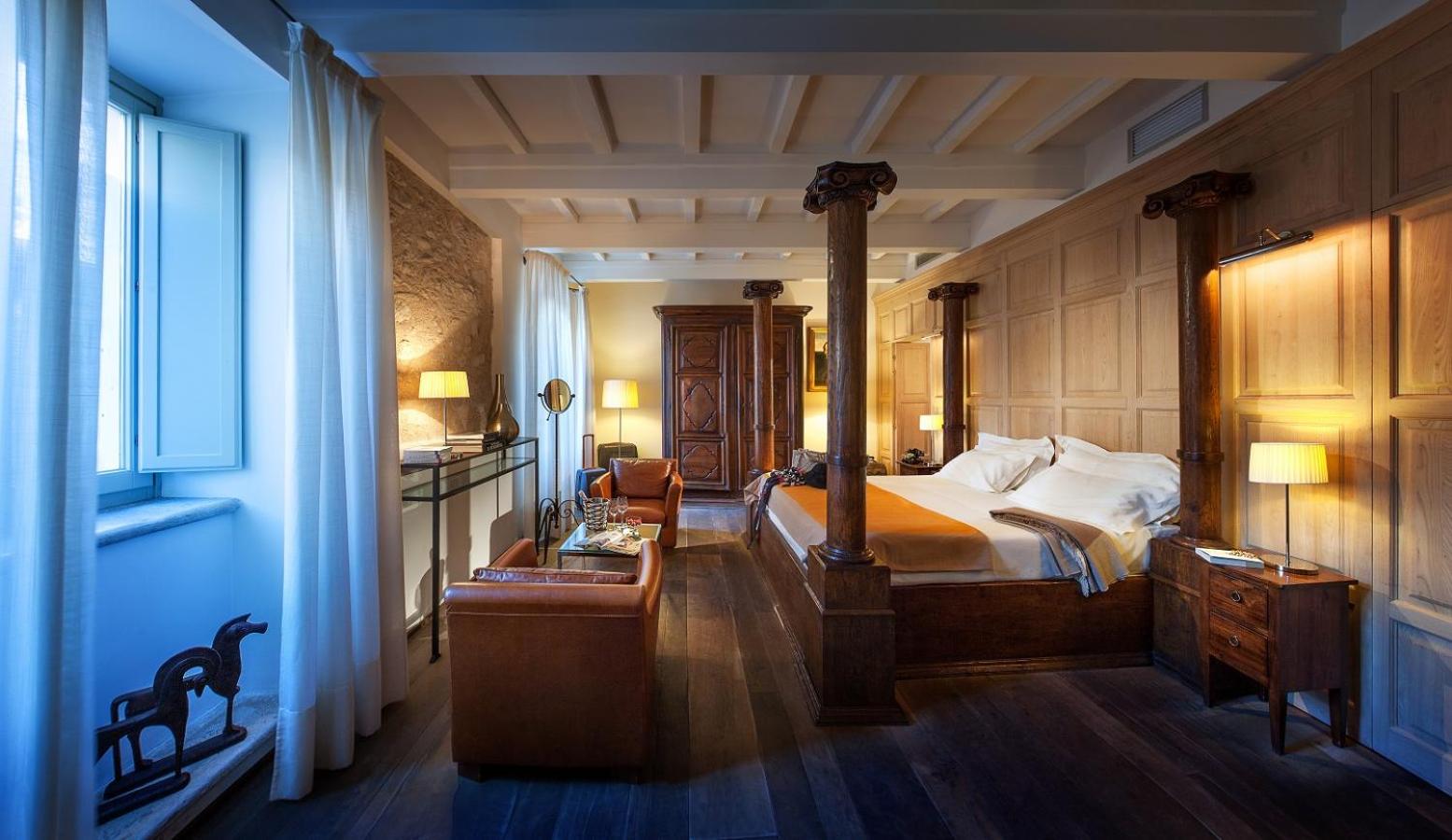 Palazzo Seneca offers elegant accommodation in a 16th-century palace, seamlessly blending modern amenities with historical charm. Each uniquely decorated room boasts romantic poster beds and designer bathrooms, creating a luxurious retreat.