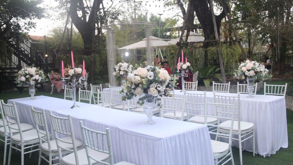 Convenient Amenities: Enjoy complimentary wireless internet, wedding services, and a communal living room. Dining Experience: Indulge in meals at the restaurant or coffee shop. Featured Amenities: Take advantage of coffee/tea, microwave, and refrigerator in common areas. Book now: Experience the comfort of home in one of our 12 guestrooms. Unwind with free Wi-Fi and private bathrooms with complimentary toiletries and hair dryers. Nearby Attractions: Explore Jesada Car Museum and Thai Human Imagery Museum just a short drive away.Plan your stay at Bananaleaf Wedding Cafe & Resort for a convenient and comfortable retreat.