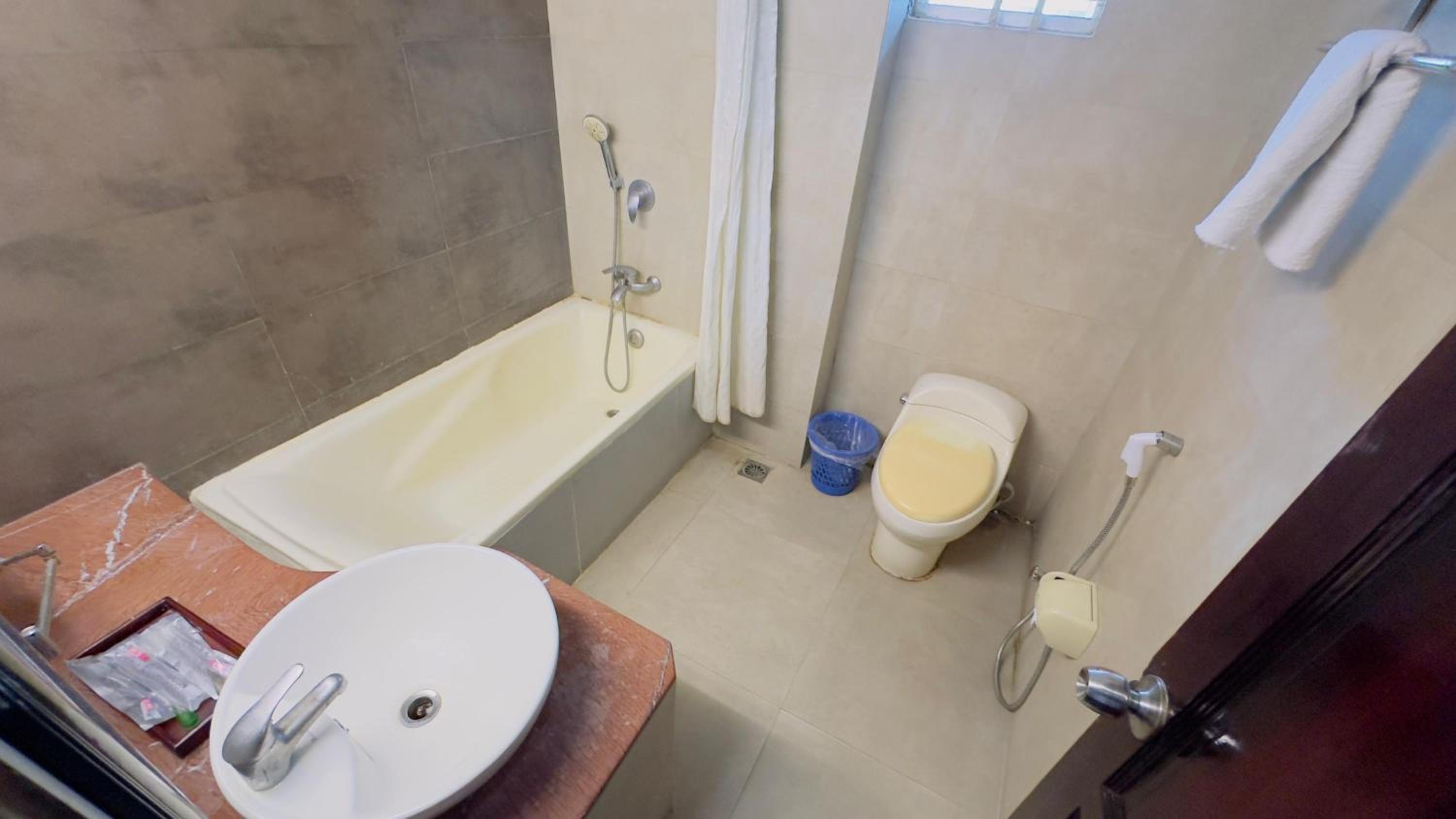 Definitely not a 4 star property. Unfortunately this was the dirtiest bathroom I’ve ever seen in my life. Bathtub was in such condition (almost black and full of hairs) that taking shower was out of question. I shortened my stay and had a hard time getting refund.