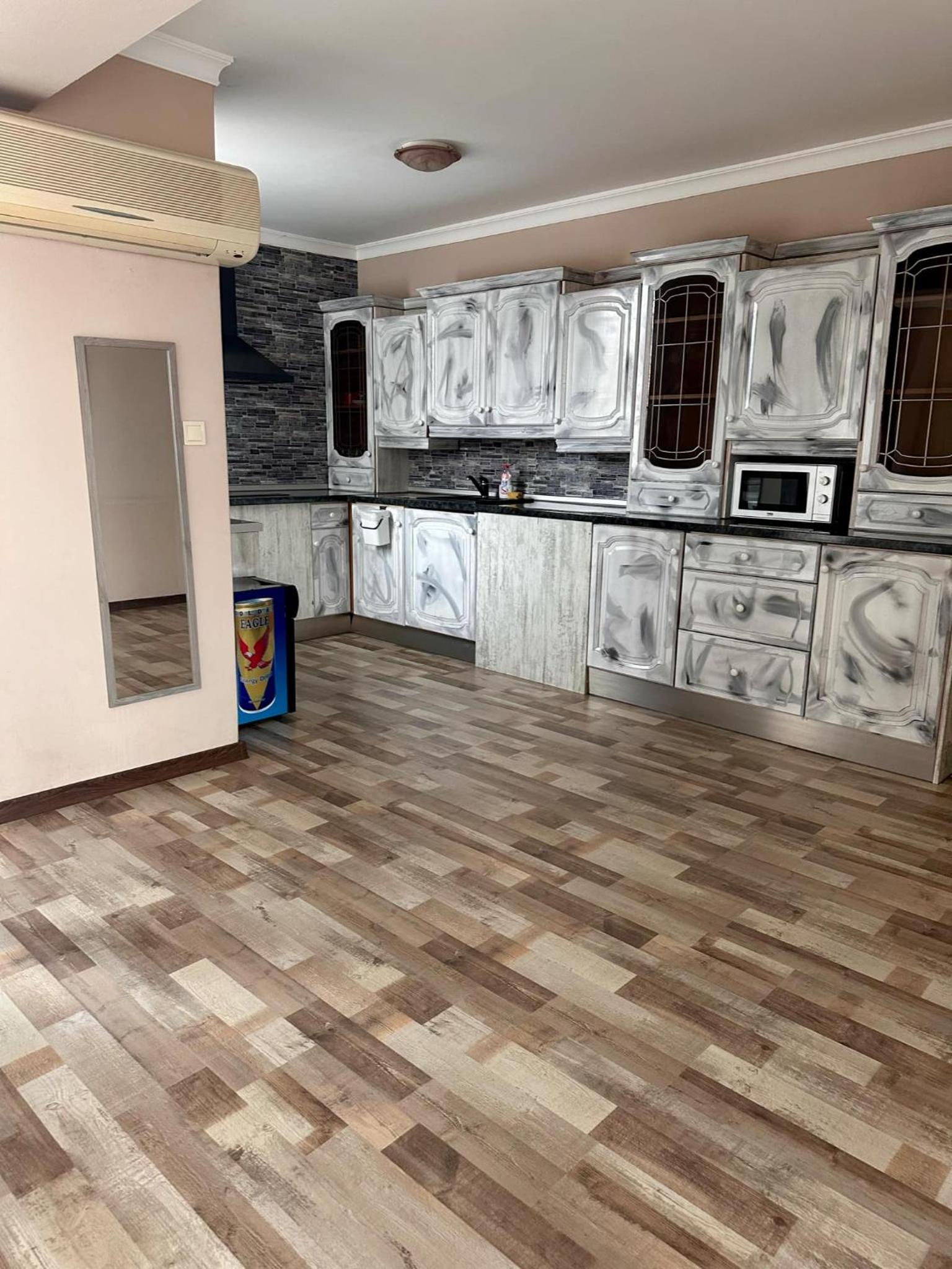 В одном из номеров кухонной мебели больше, чем нужно, а шкафа-купе куда повесить вещи нет. Полки в душе для полотенец плохо закреплены, откручивались и падали.