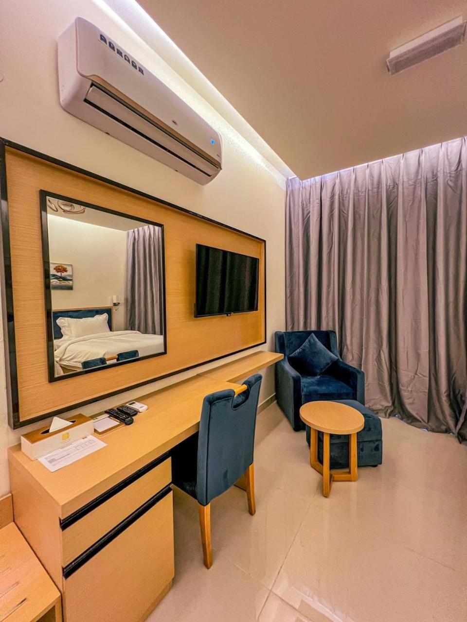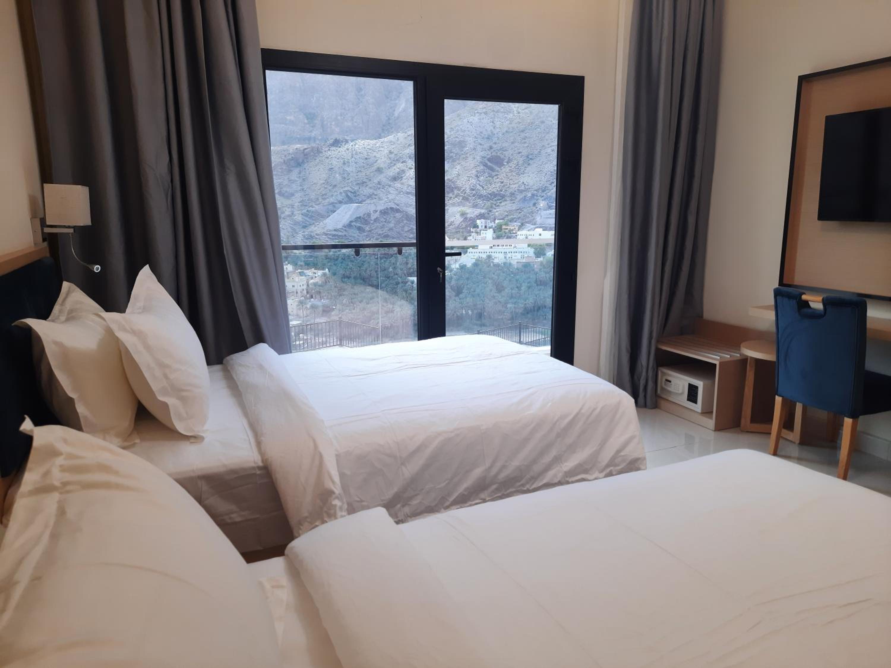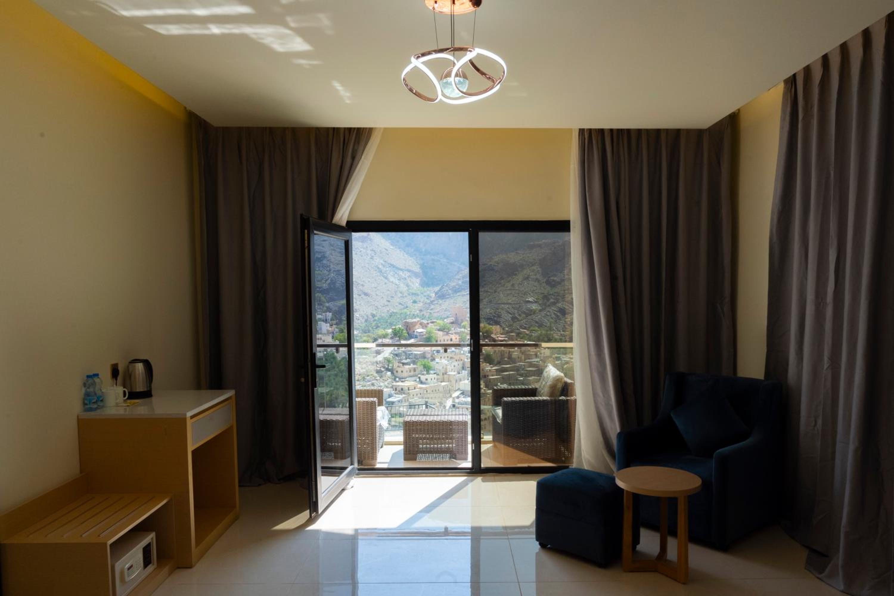 Experience comfort and style at Season Inn Hotel_Bald Sayt in Rustāq. Each room is equipped with modern amenities including air conditioning, flat-screen TV, and a private terrace with stunning mountain views.