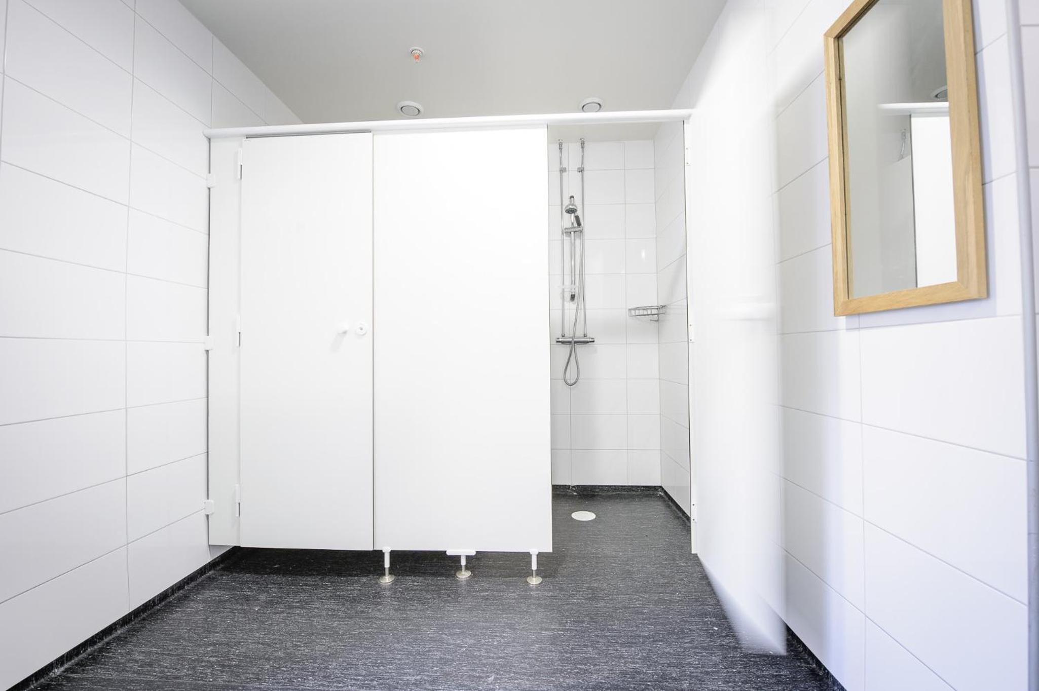 Gezamenlijke douches geen probleem, maar erg schoon waren ze niet.