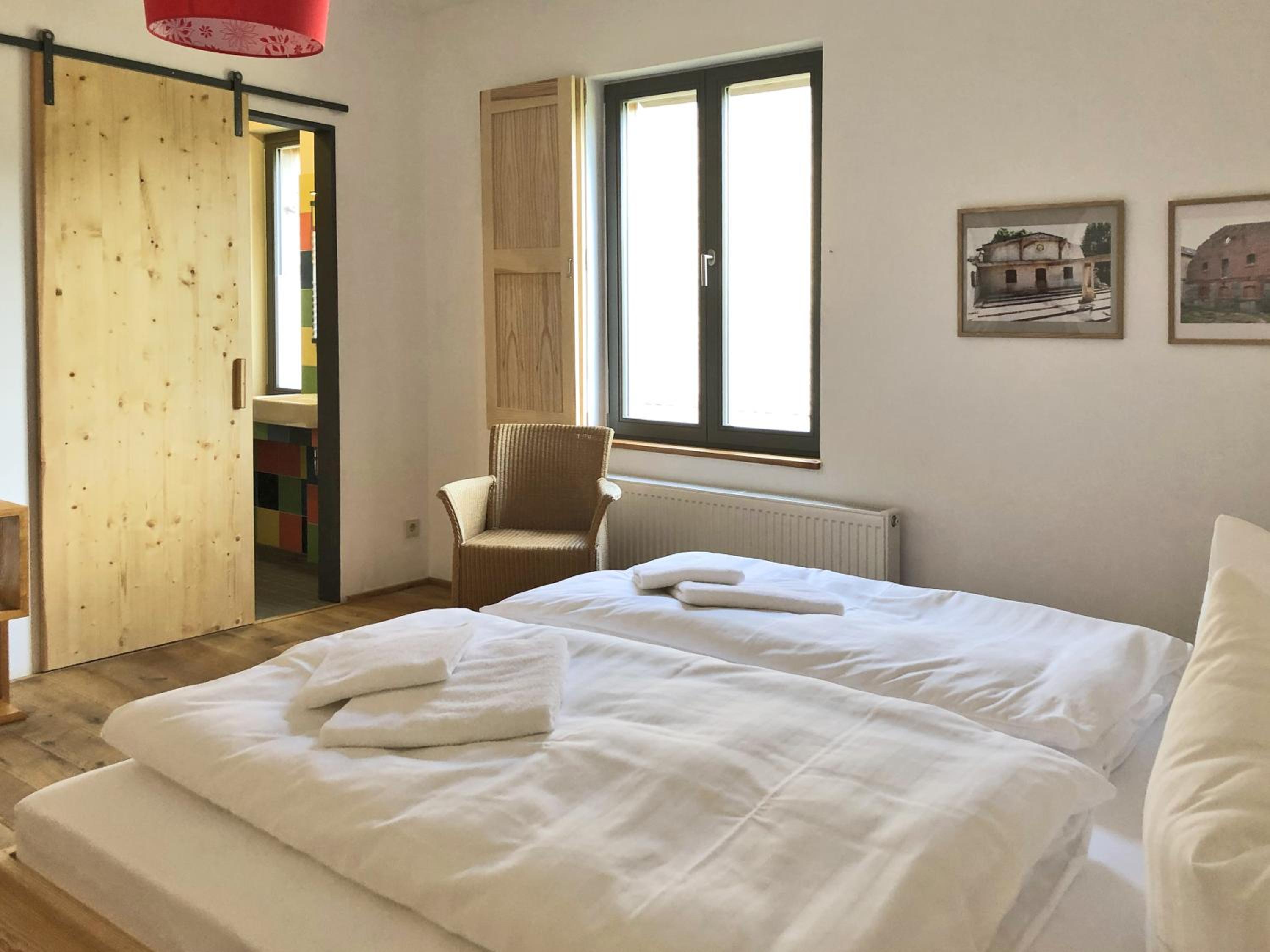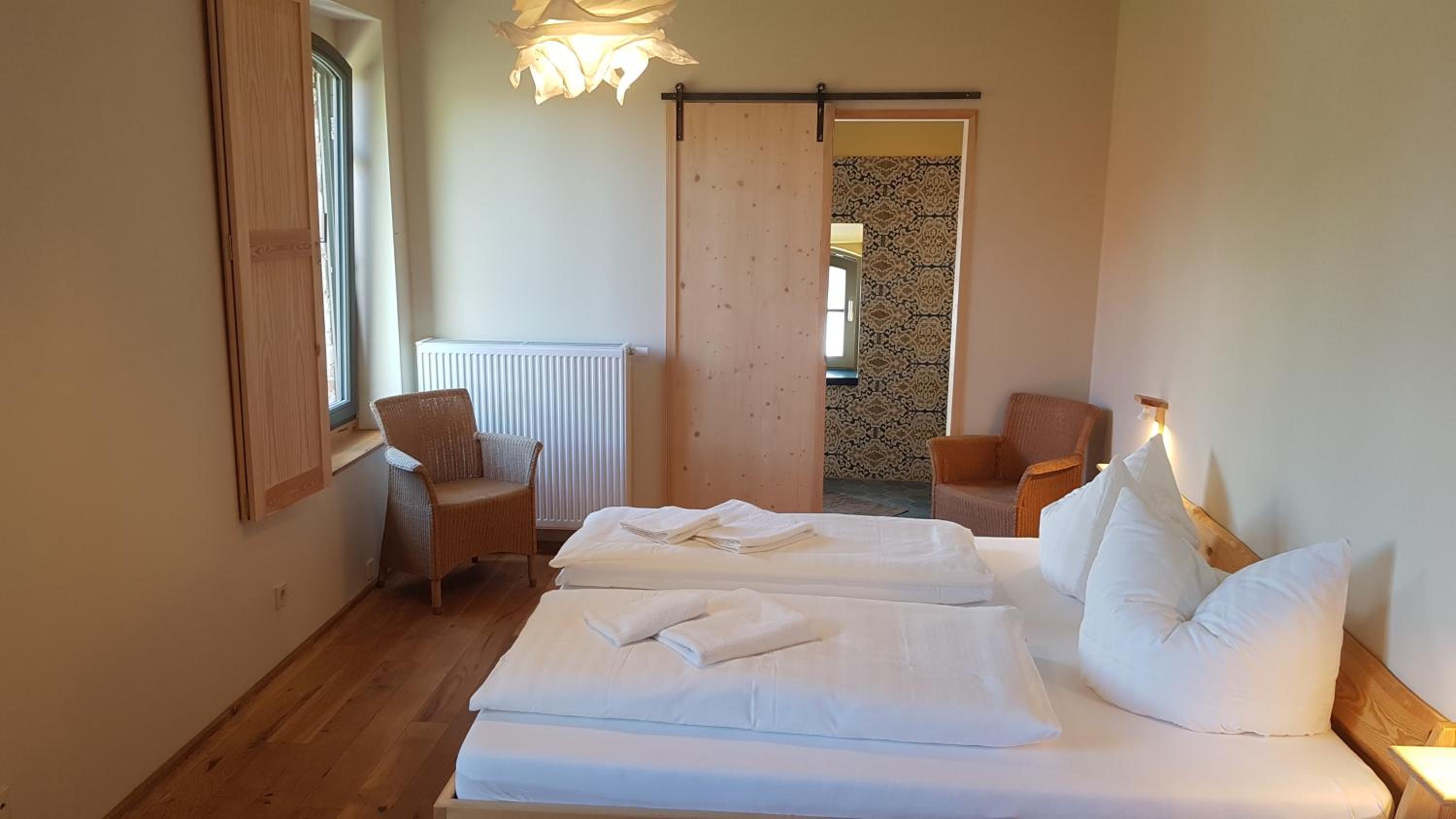 Un havre de paix en pleine nature, dans un village assez isolé. Superbe rénovation du bâtiment. Proche des chambres une grande salle avec terrasse pour le petit déjeuner. Nous avons pu nous y installer pour manger le soir. Très sympa.