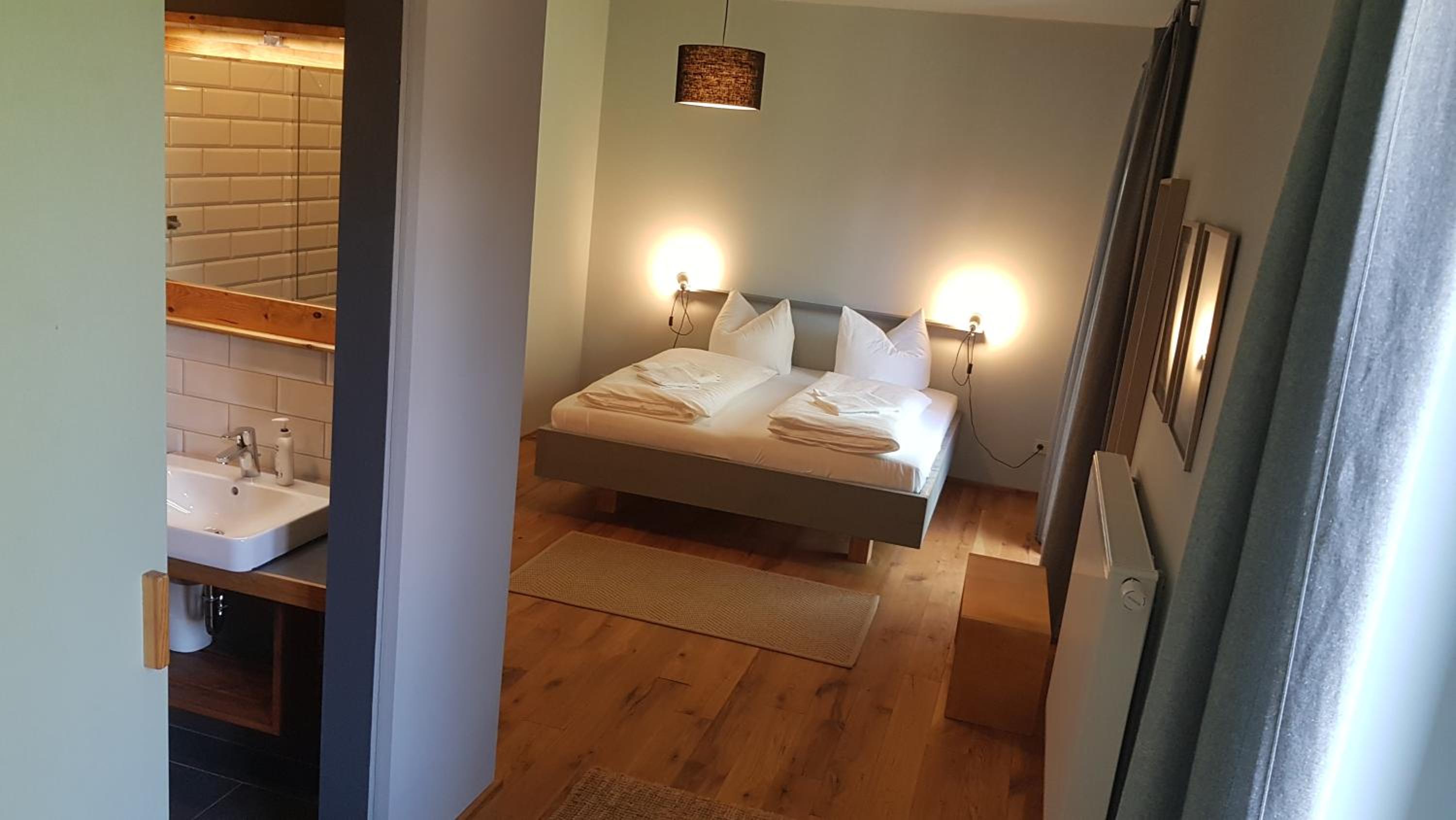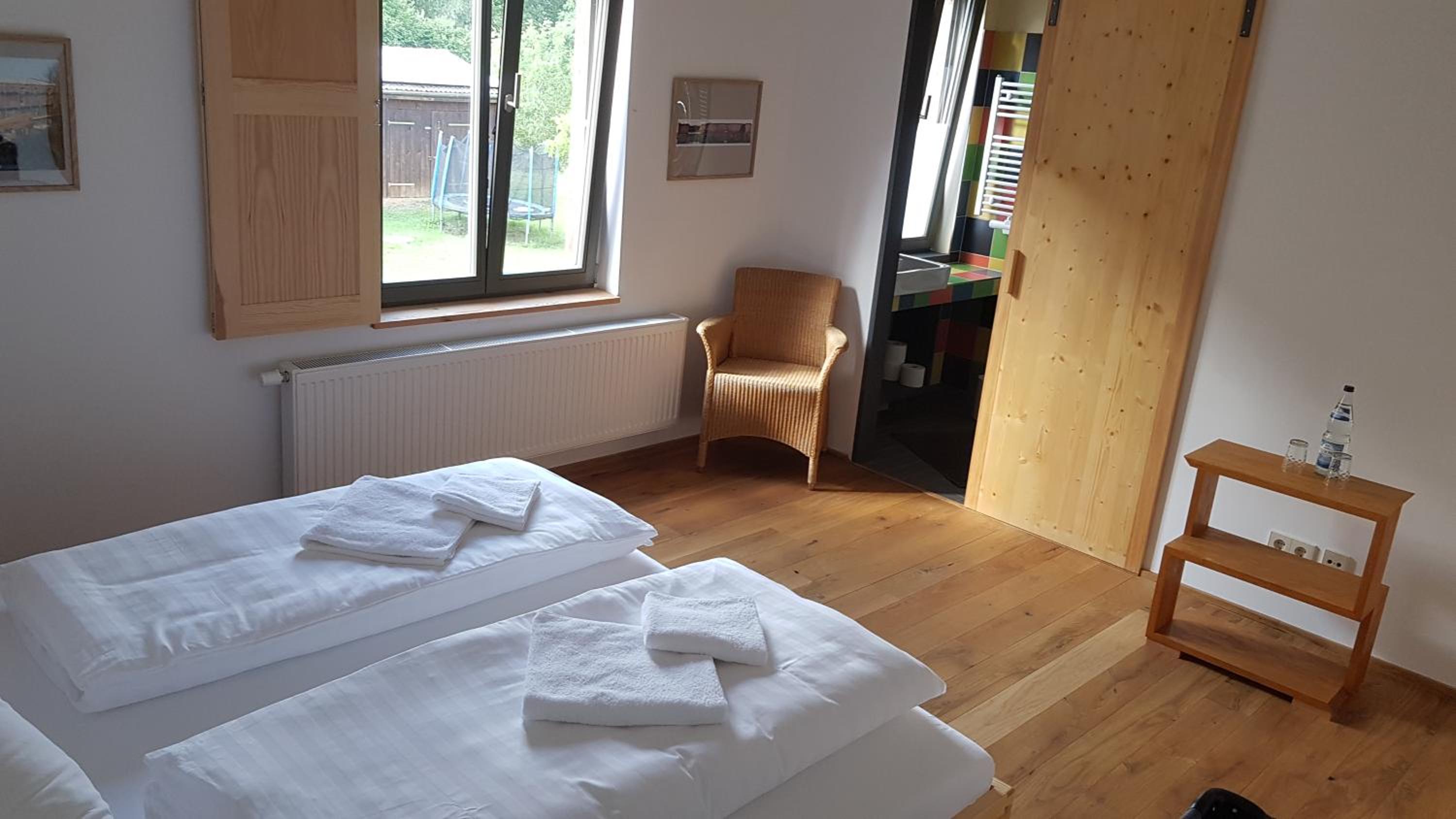 Die Lage mitten in der Natur ist super, die Betten bequem und die Menschen lieb. Zum Frühstück kann man sich in der Küche Tee und Kaffee machen, es gibt Bier und Softdrinks im Kühlschrank und eine Mikrowelle.
