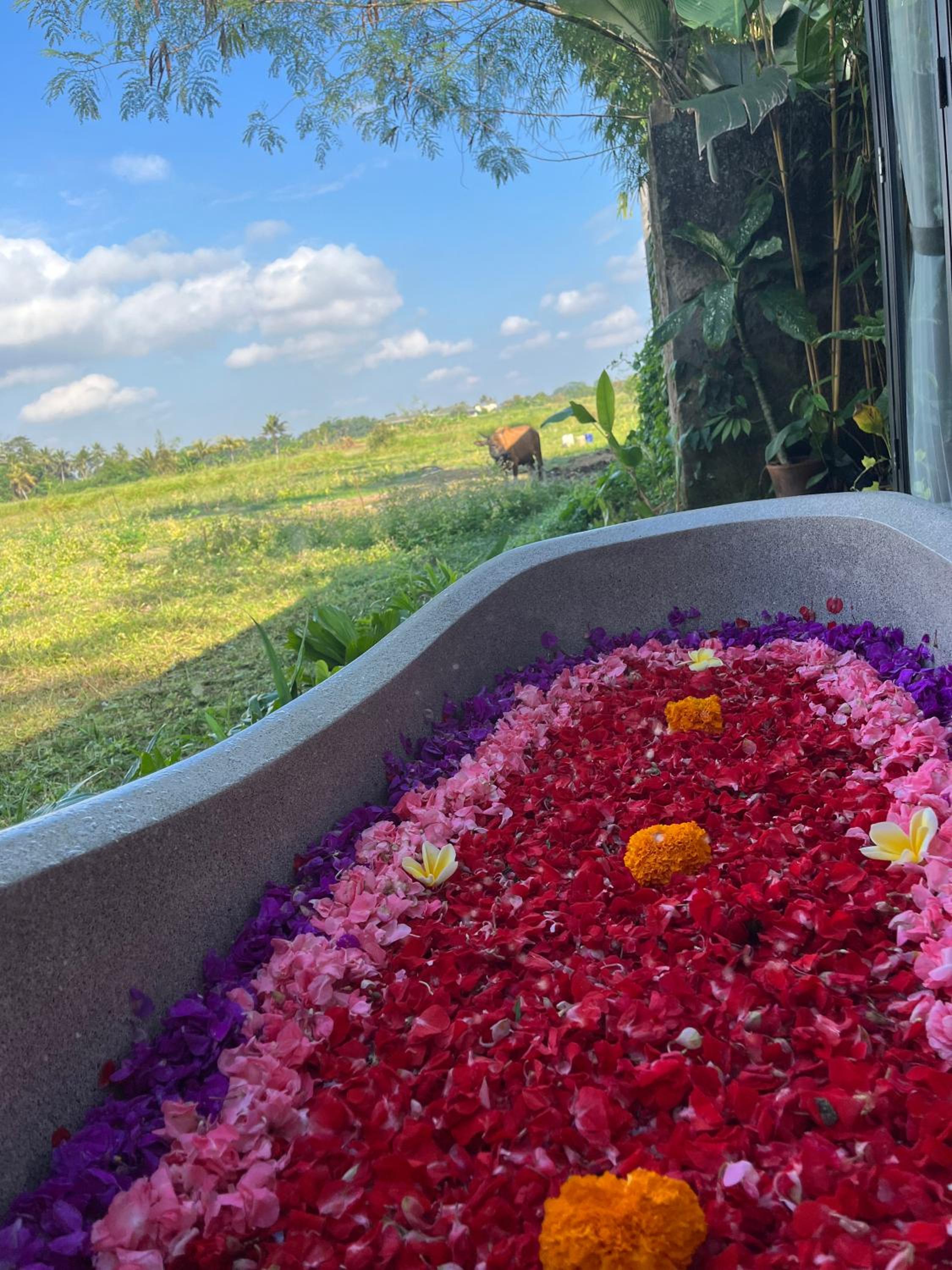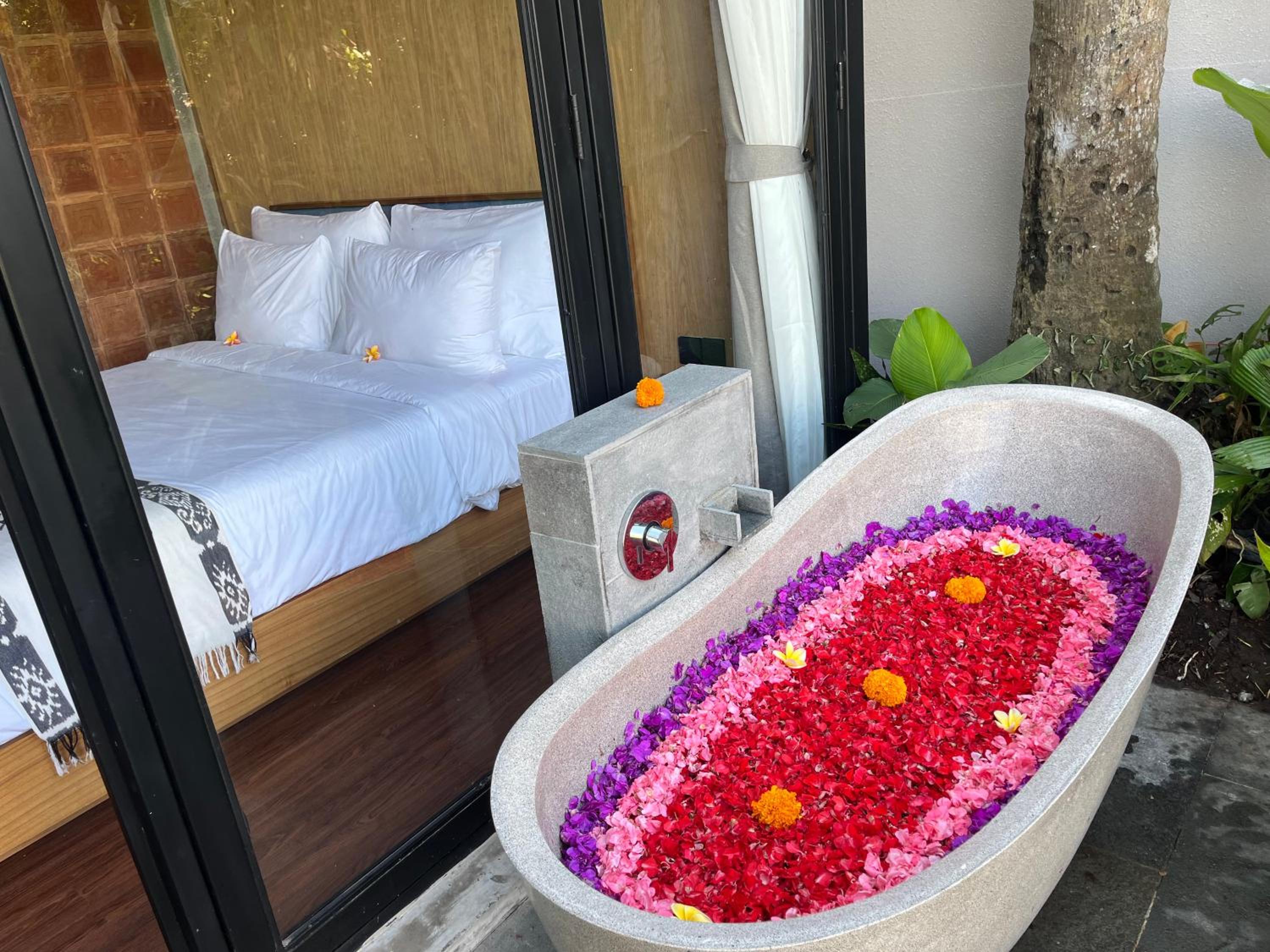 Great location, not really in the center of Ubud which is great, not so crowded and it helped us to relax more. At night we did see some fireflies! it was magical. We had breakfast while we swam in the pool and the staff provided us with floating tray, very fun. the bath tub was under the shade of this tree, lovely, and we can see the stars while soaking. recommended