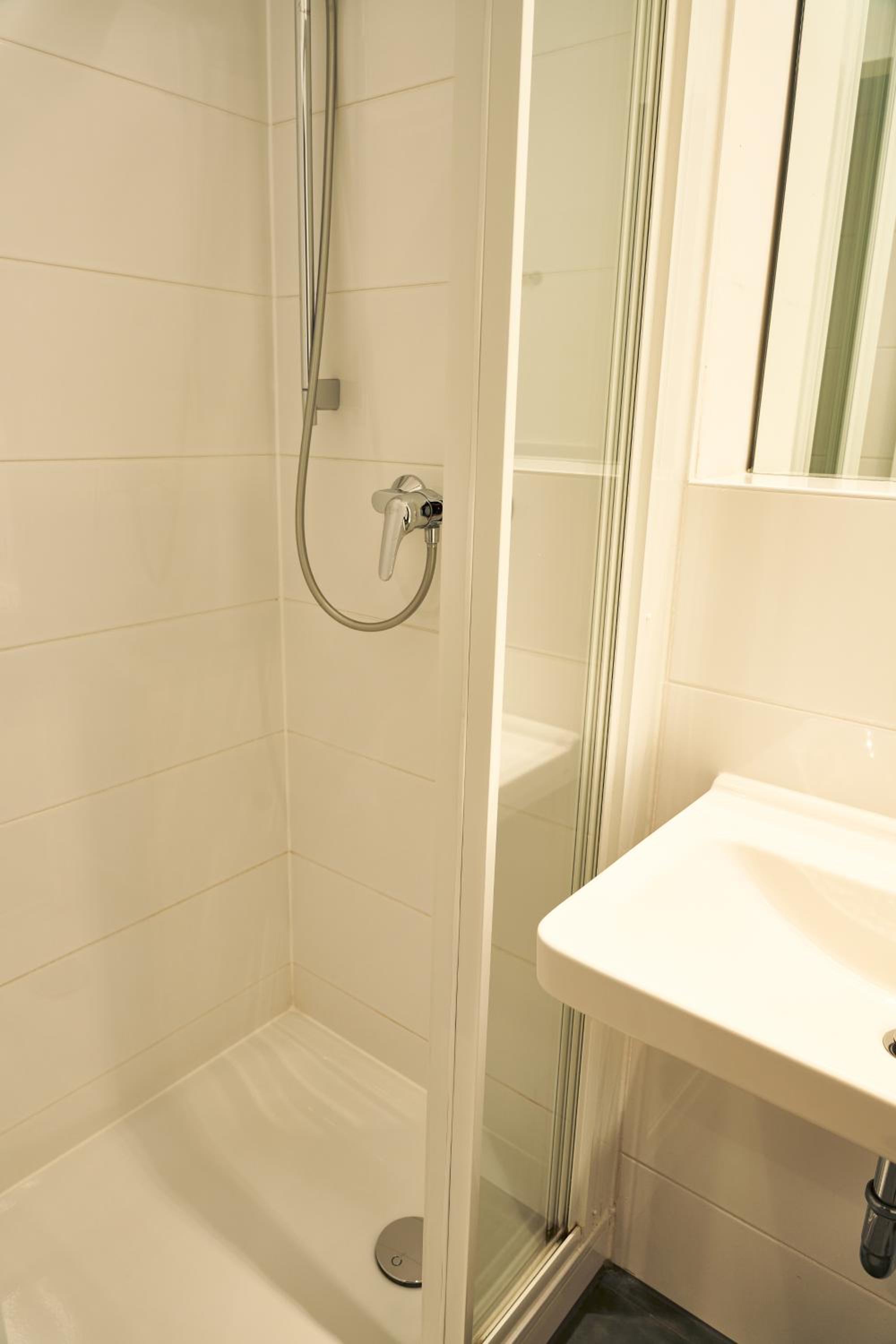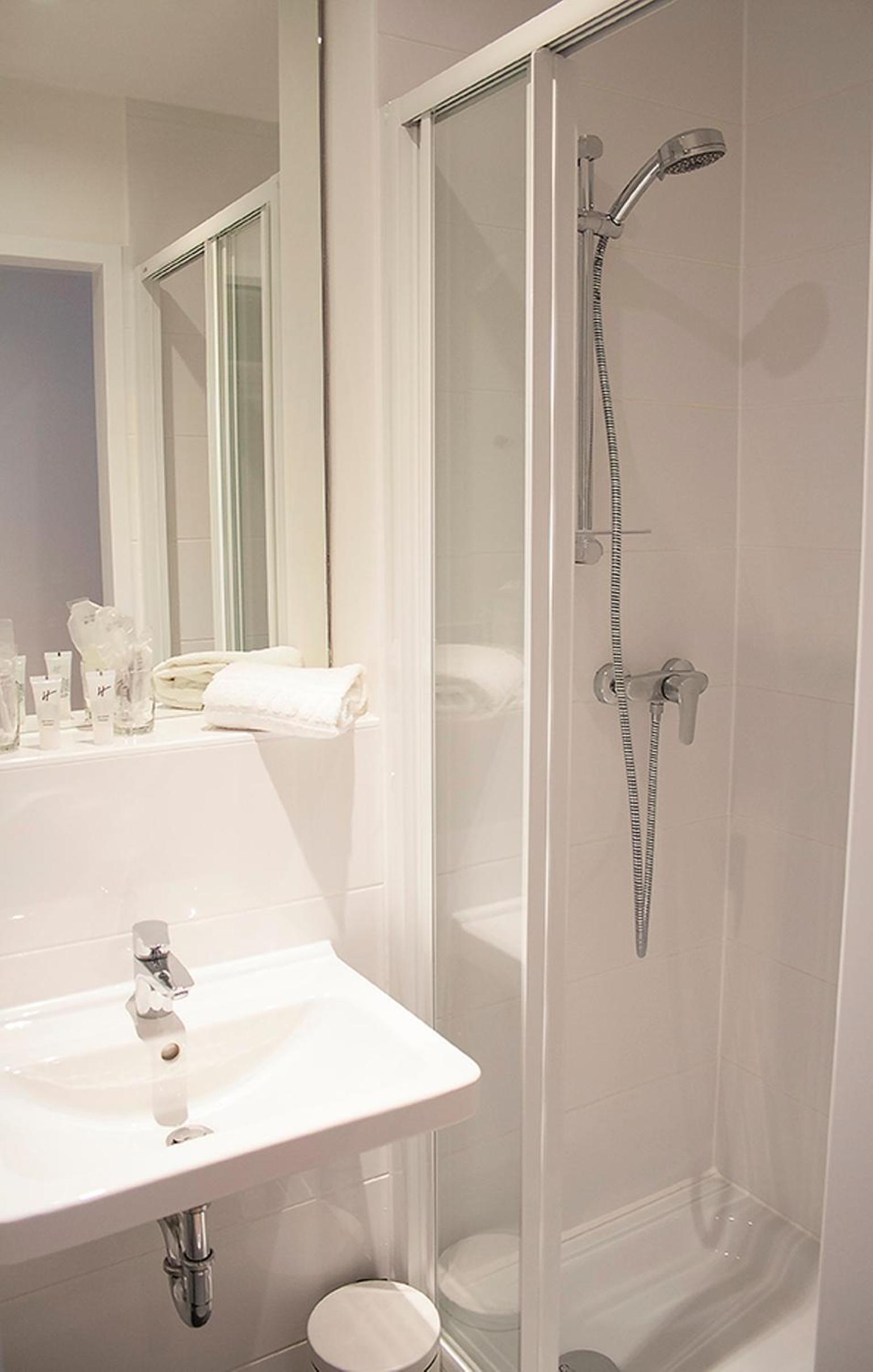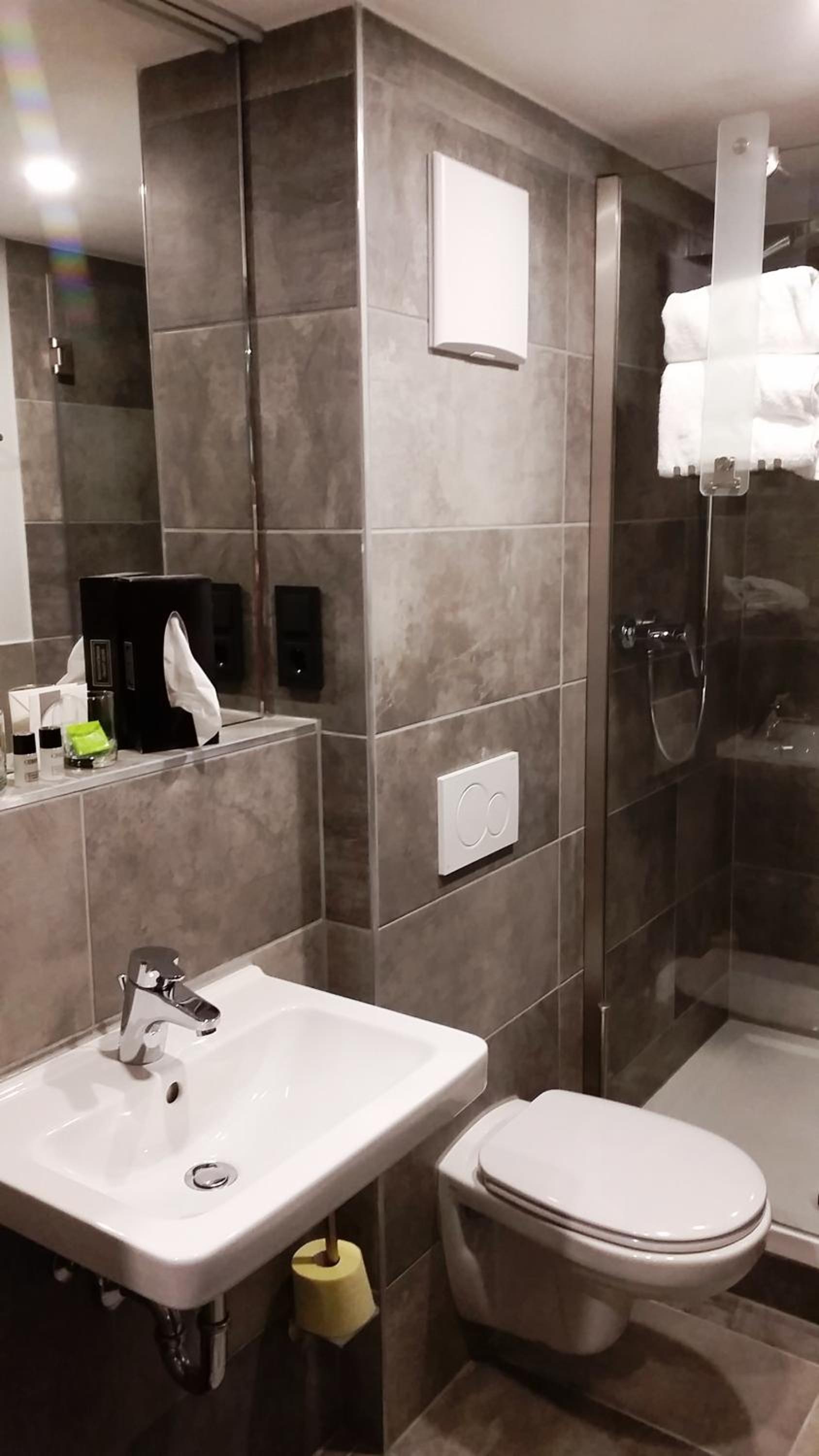 Badezimmer sehr schmal. Dusche angenehme, aber wenig Platz auf der Toilette.