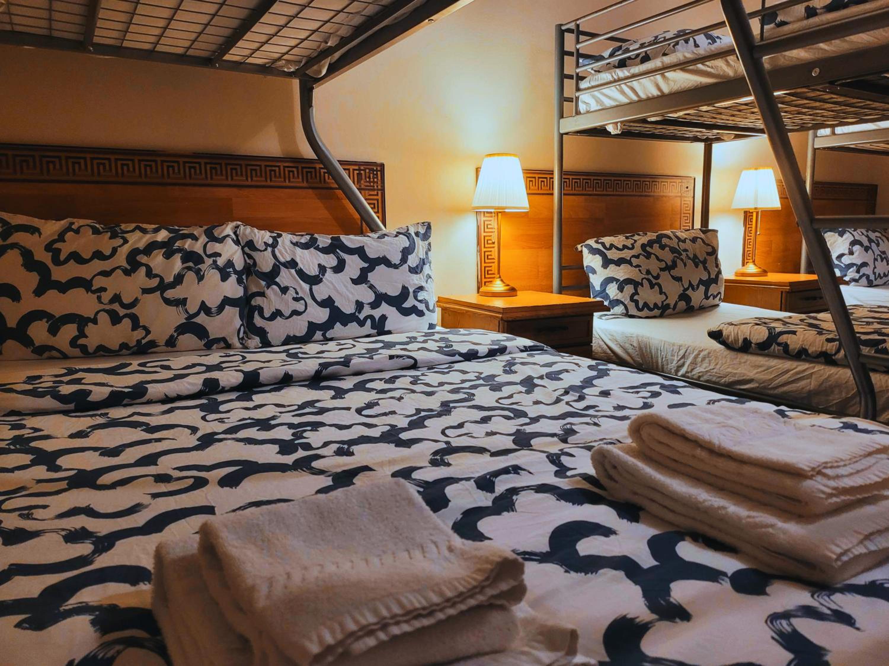 The bathroom was clean and there was plenty of soap and toilet paper. The beds were comfortable, pillows soft and the bedding was good quality and clean. The room was very warm, even when outside it was sub-zero. We had a very comfortable night.