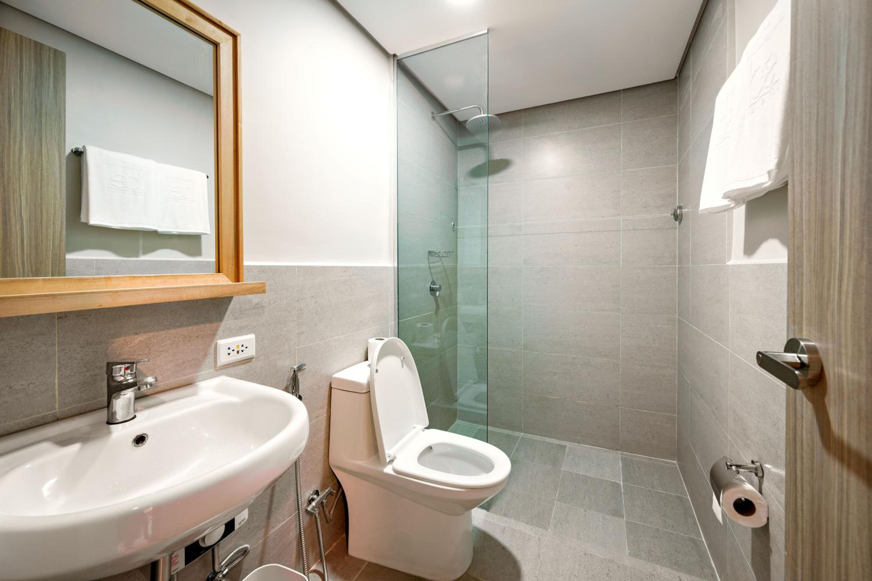 The bathroom was designed to flood towards the toilet. I wish there is a glass closure to avoid the bath water to come out and drain towards the toilet drainage.