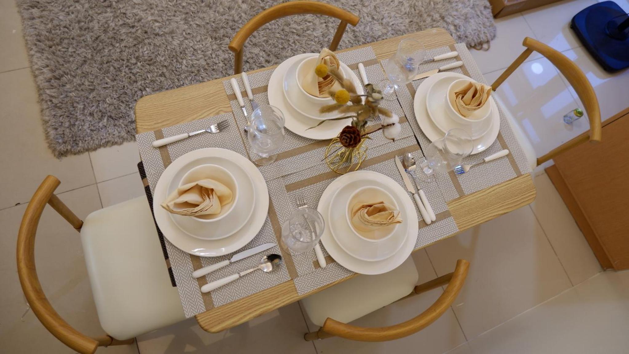Dining wares and toiletries are complete.