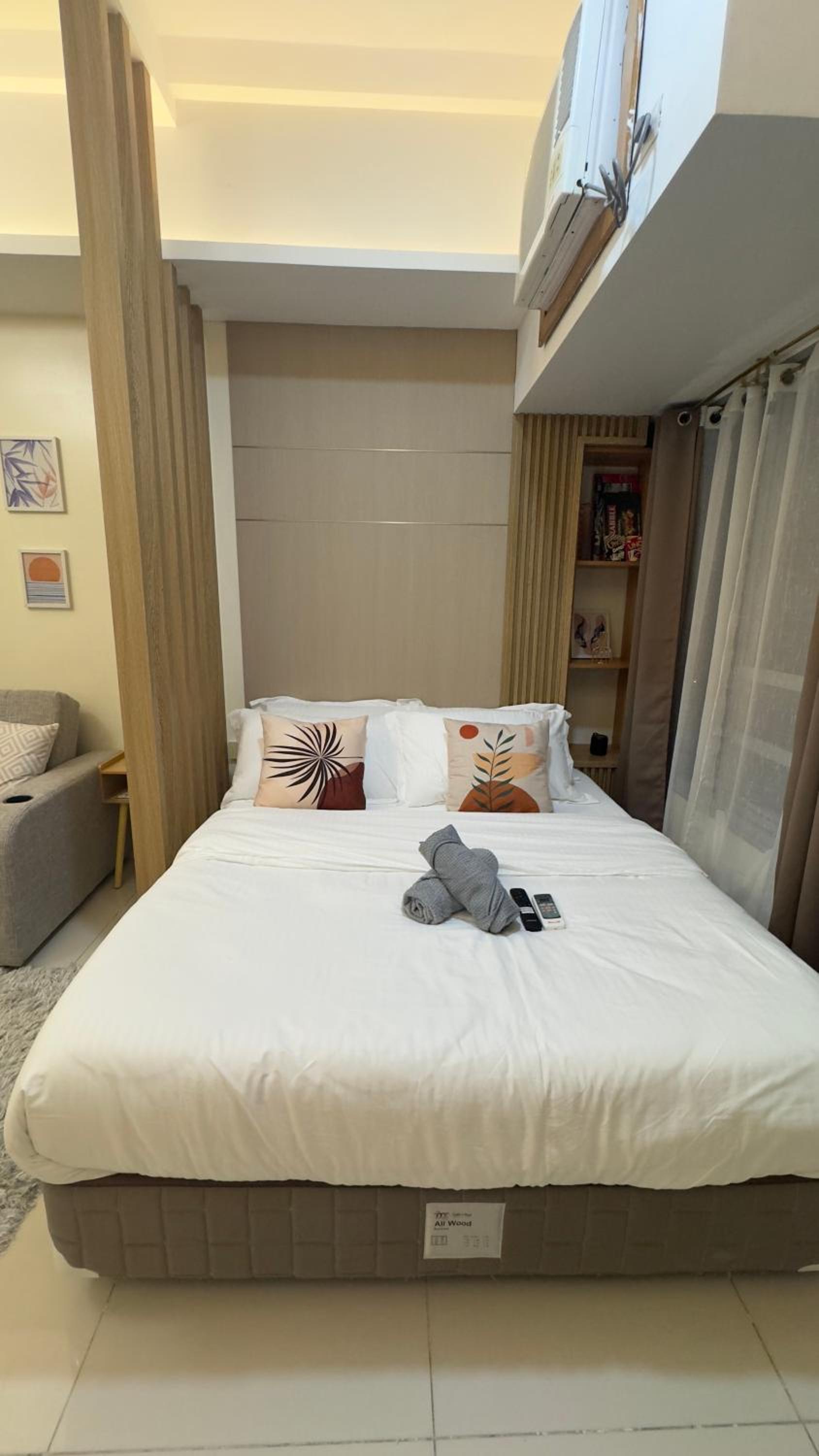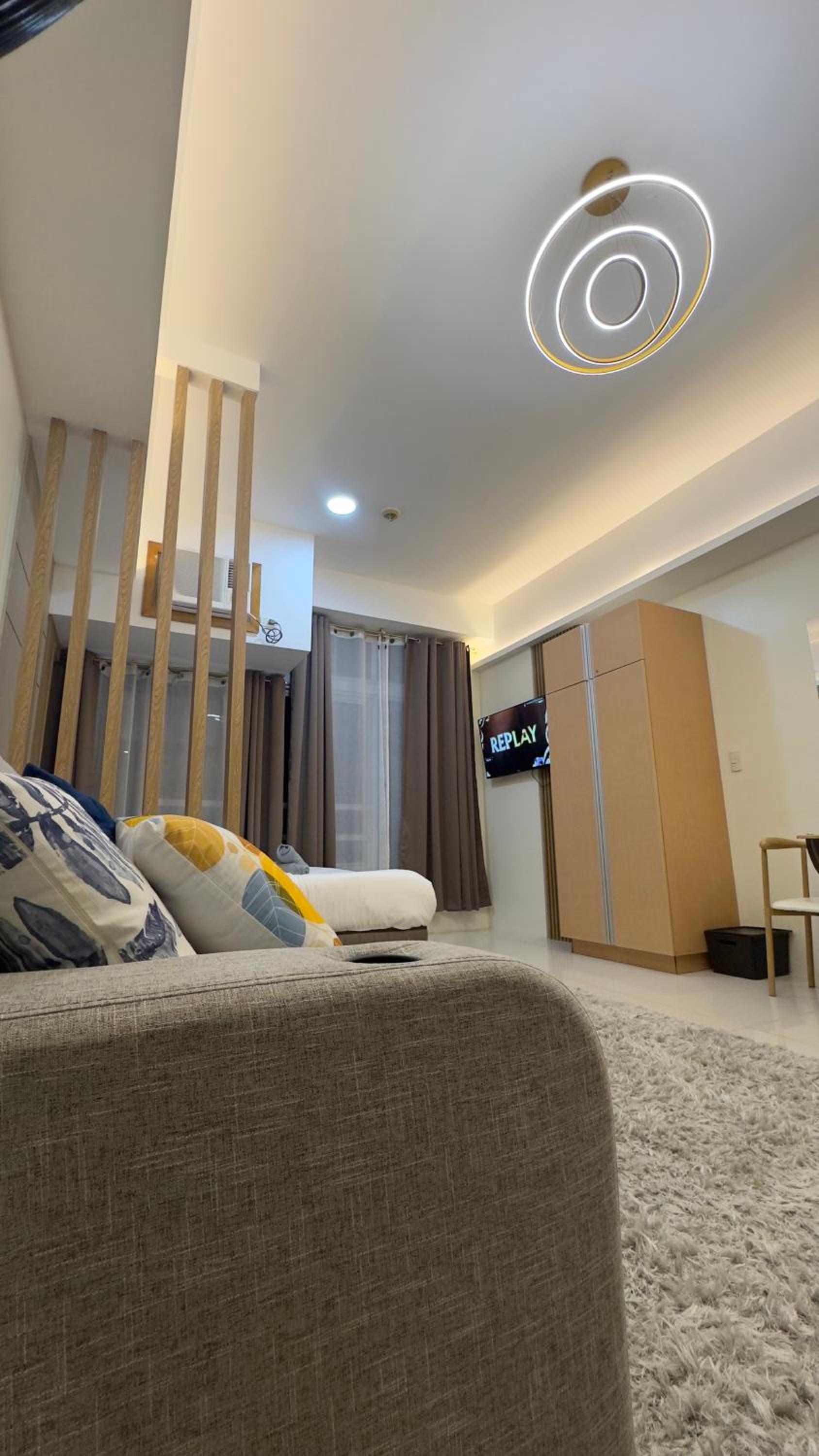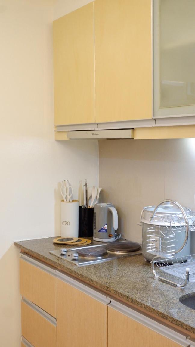 The location a few steps from the Eastwood Mall entrance. A lot of coffee shops close by. The unit was clean and it suited our needs for the moment. Website pictures were accurate. The bed was comfortable and air conditioning worked great. I wish there was a luggage rack though.