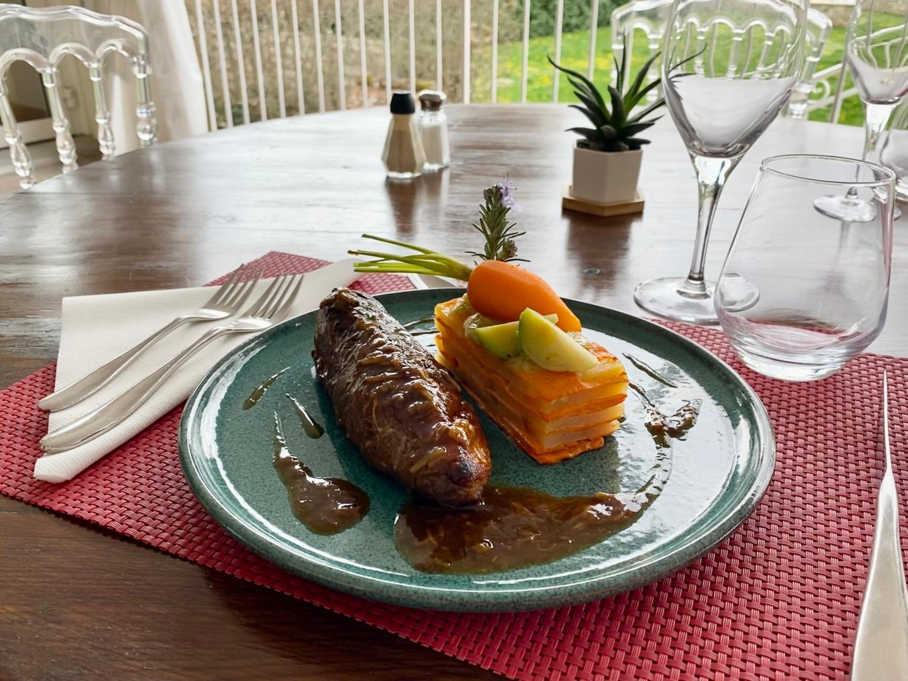 Établissement de caractère, bel emplacement, bon restaurant, grande piscine pour se délasser après une journée de visites, bon petit déjeuner, serviettes pour la piscine, produits d’accueil en chambre.