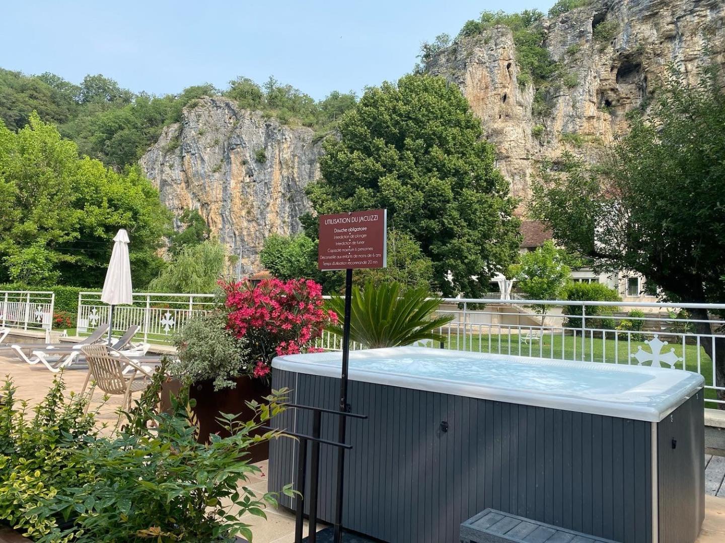 Bel hôtel romantique, jolie terrasse, belle piscine et Jacuzzi en plein air.