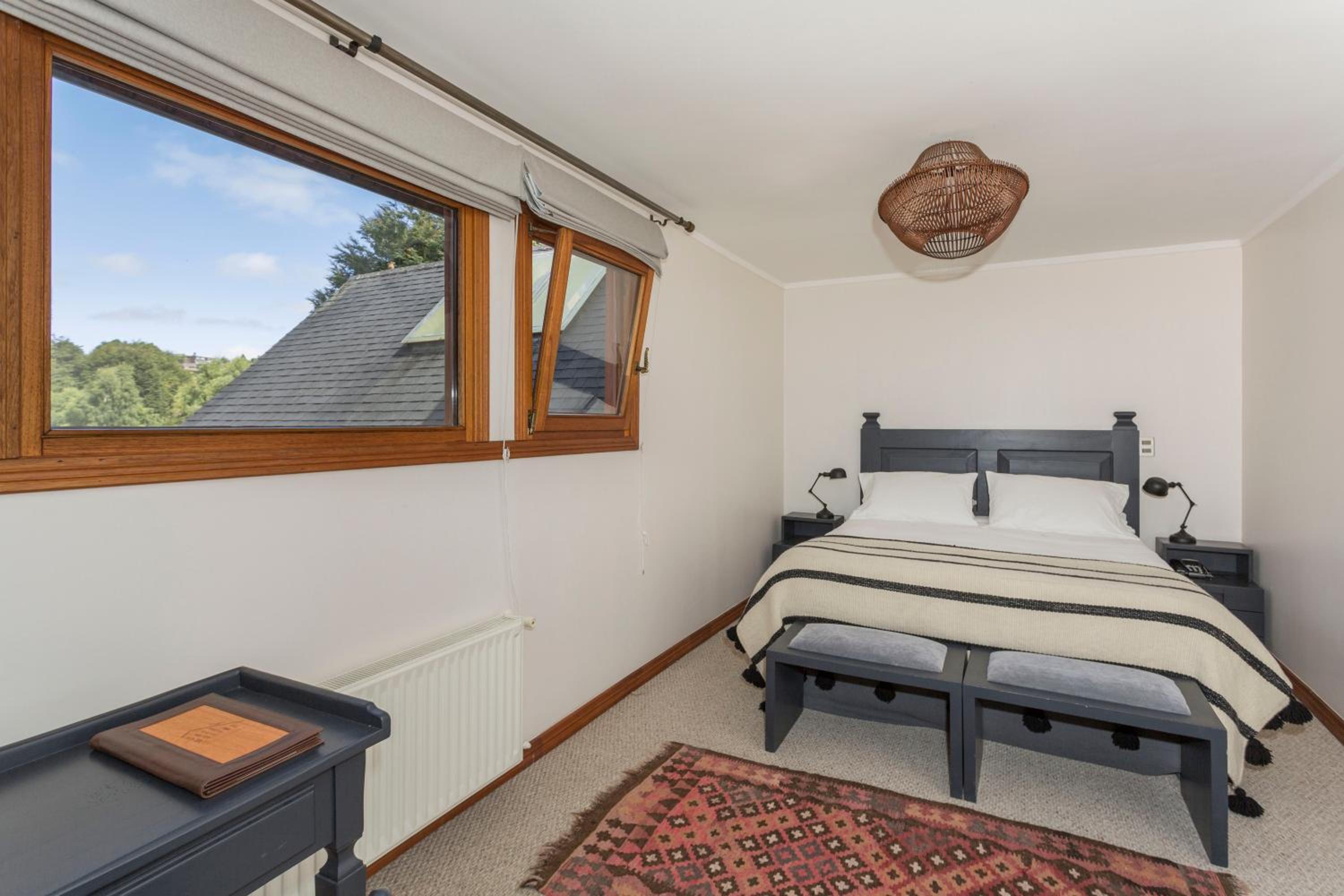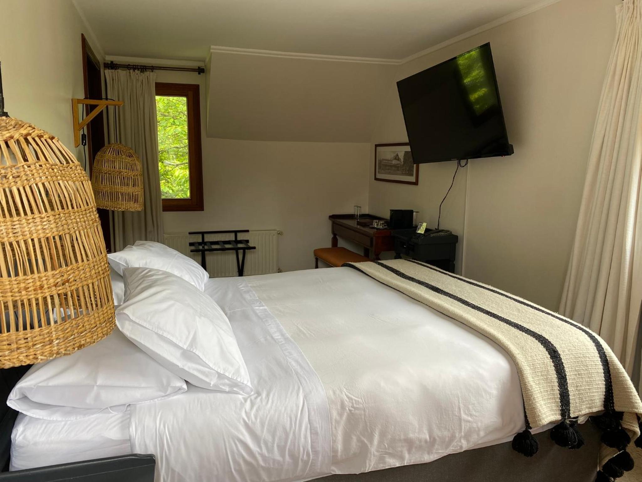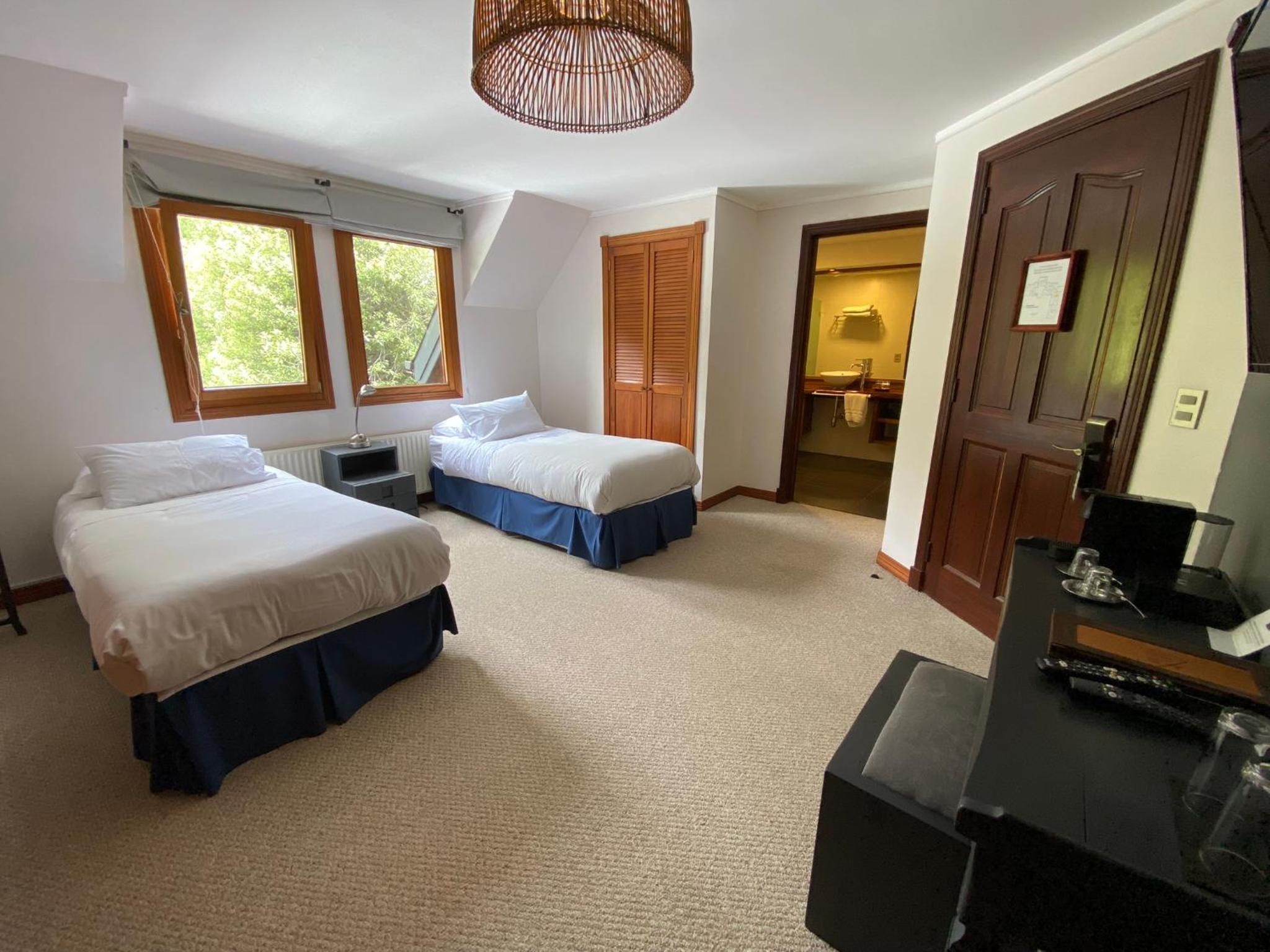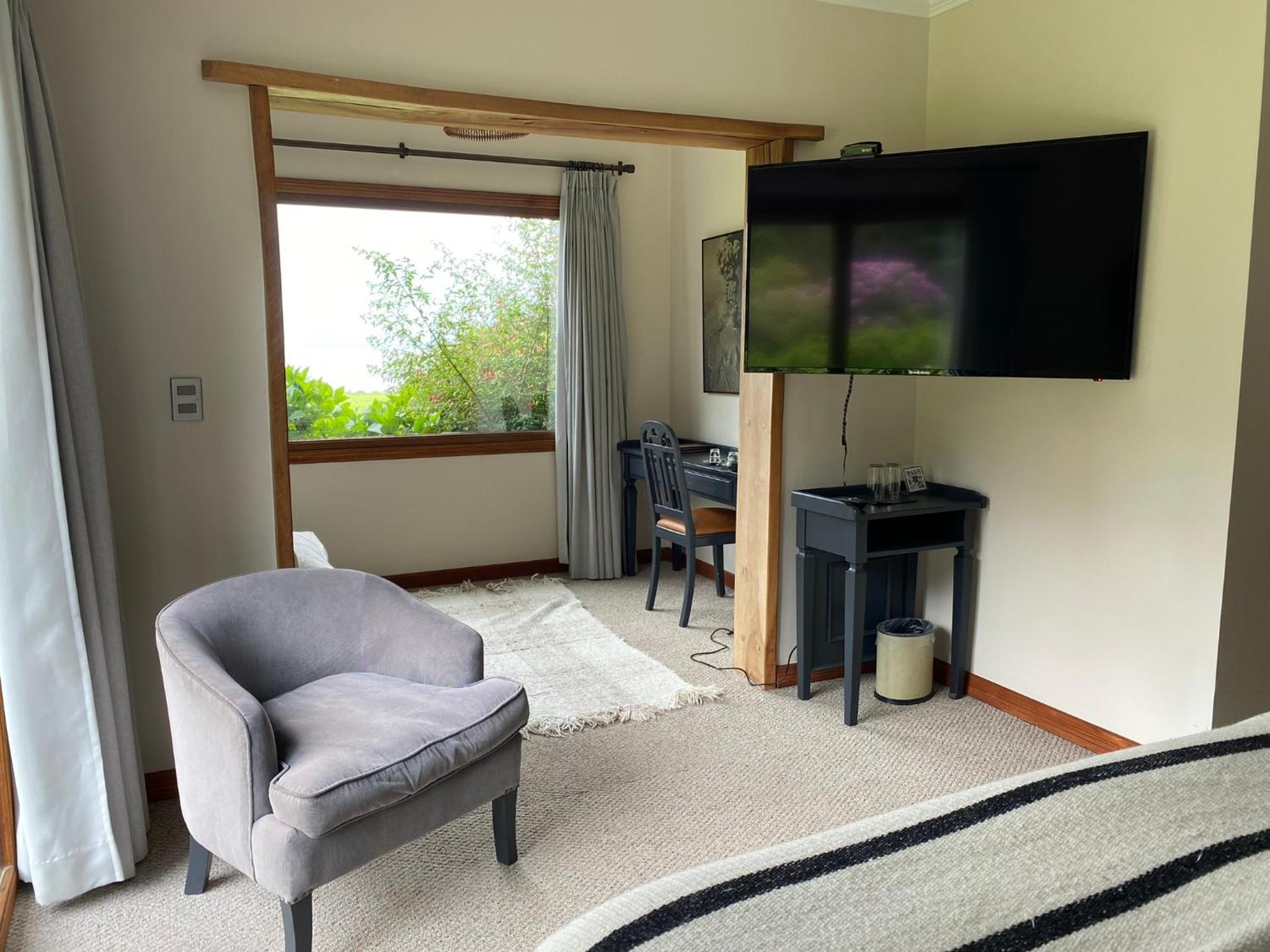 The rooms at Casa Molino Hotel Boutique & Restaurant Puerto Varas are designed for both relaxation and convenience, featuring ample windows to let in natural light and a cozy living area with modern amenities like flat-screen TVs.