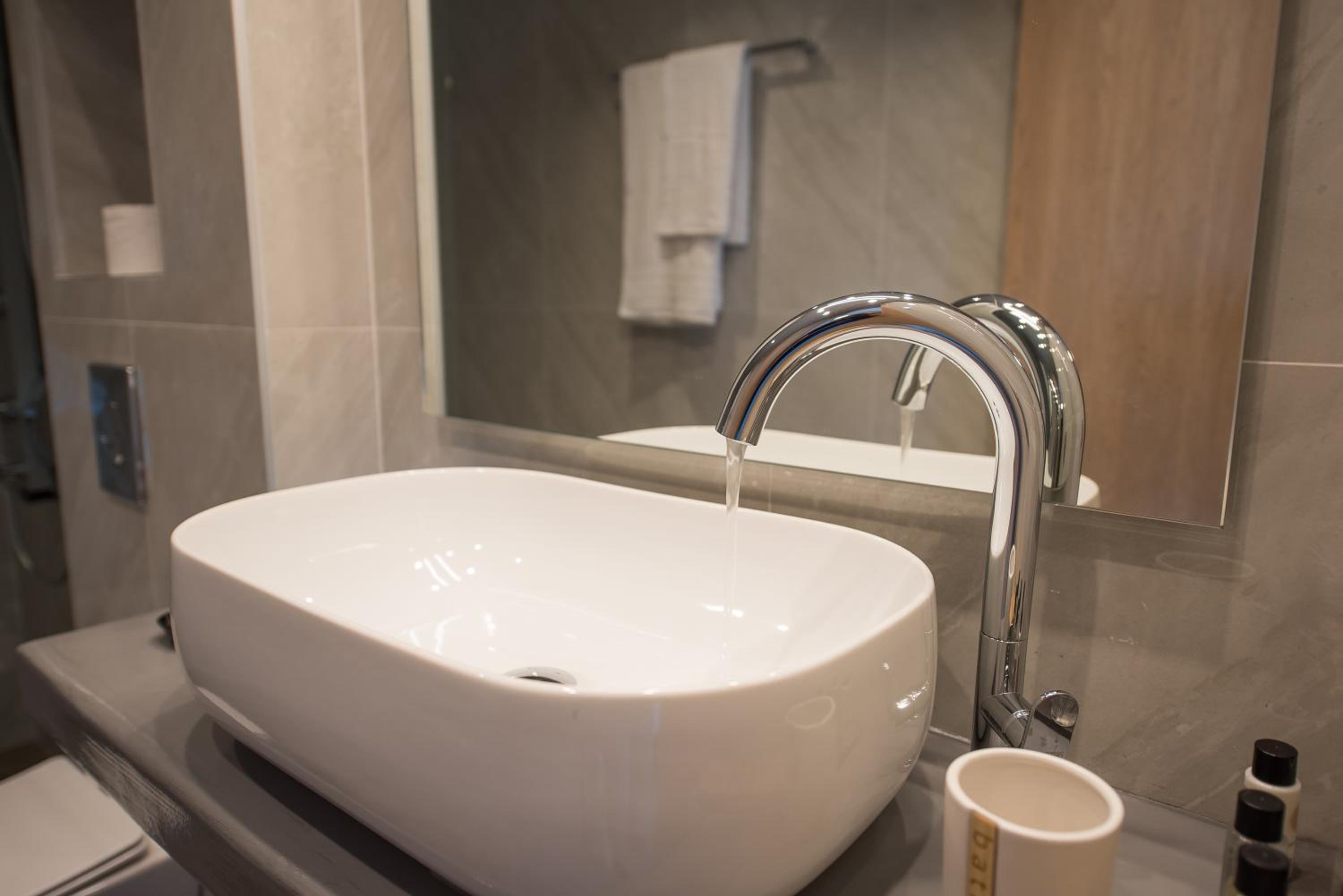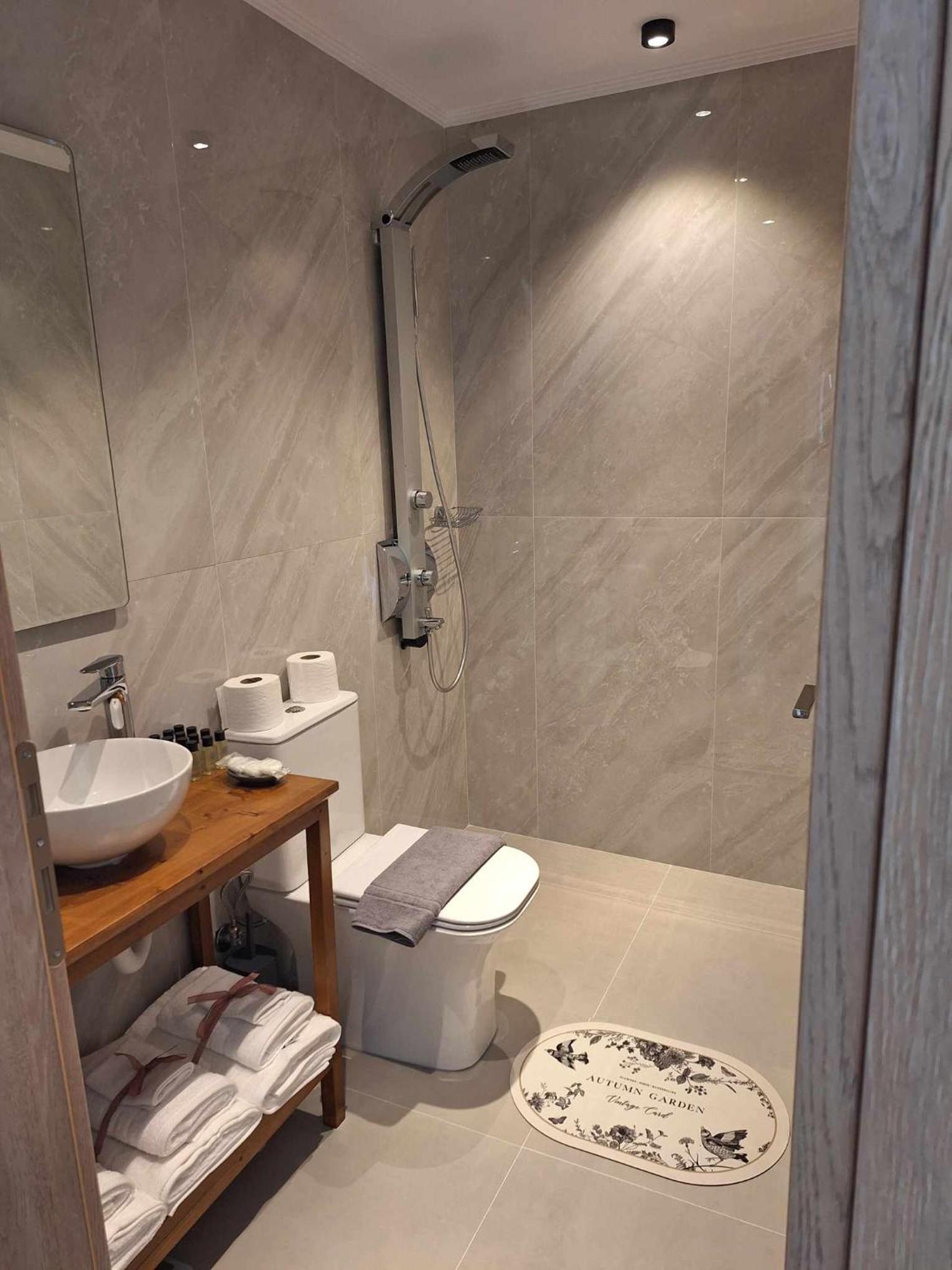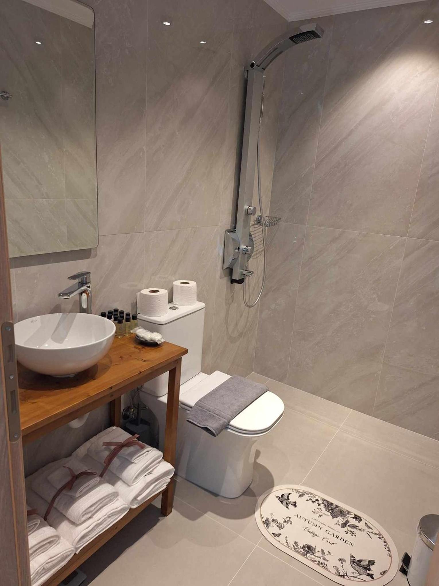 La salle de bain est moderne, grande et très propre, avec plein de produits de toilette. La propriétaire et le personnel sont adorables, toujours prêts à aider avec le sourire.