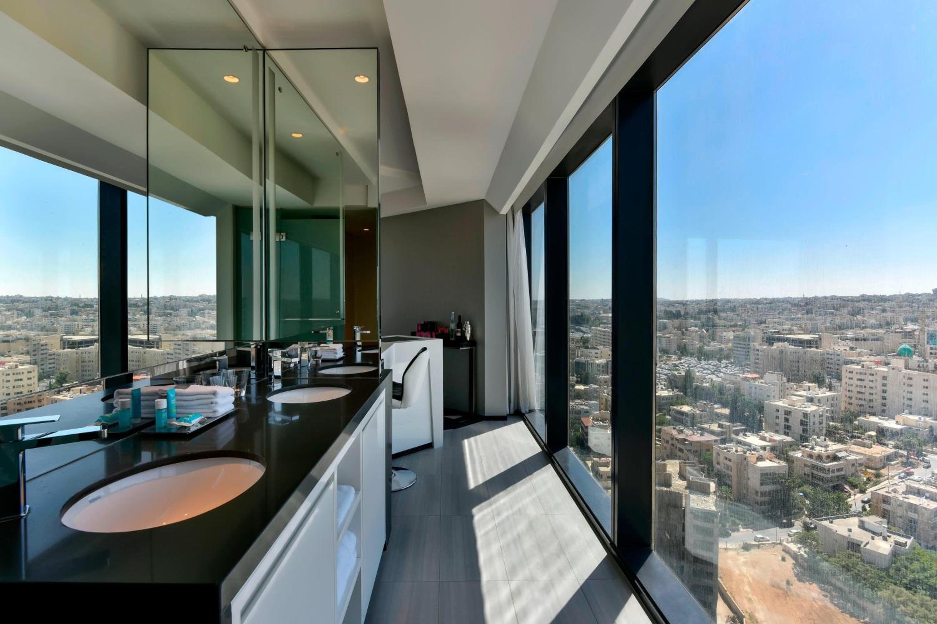 The W Amman Hotel in the heart of Abdali showcases a bold and contemporary architectural design, providing stunning views of the city's seven hills through floor-to-ceiling windows.