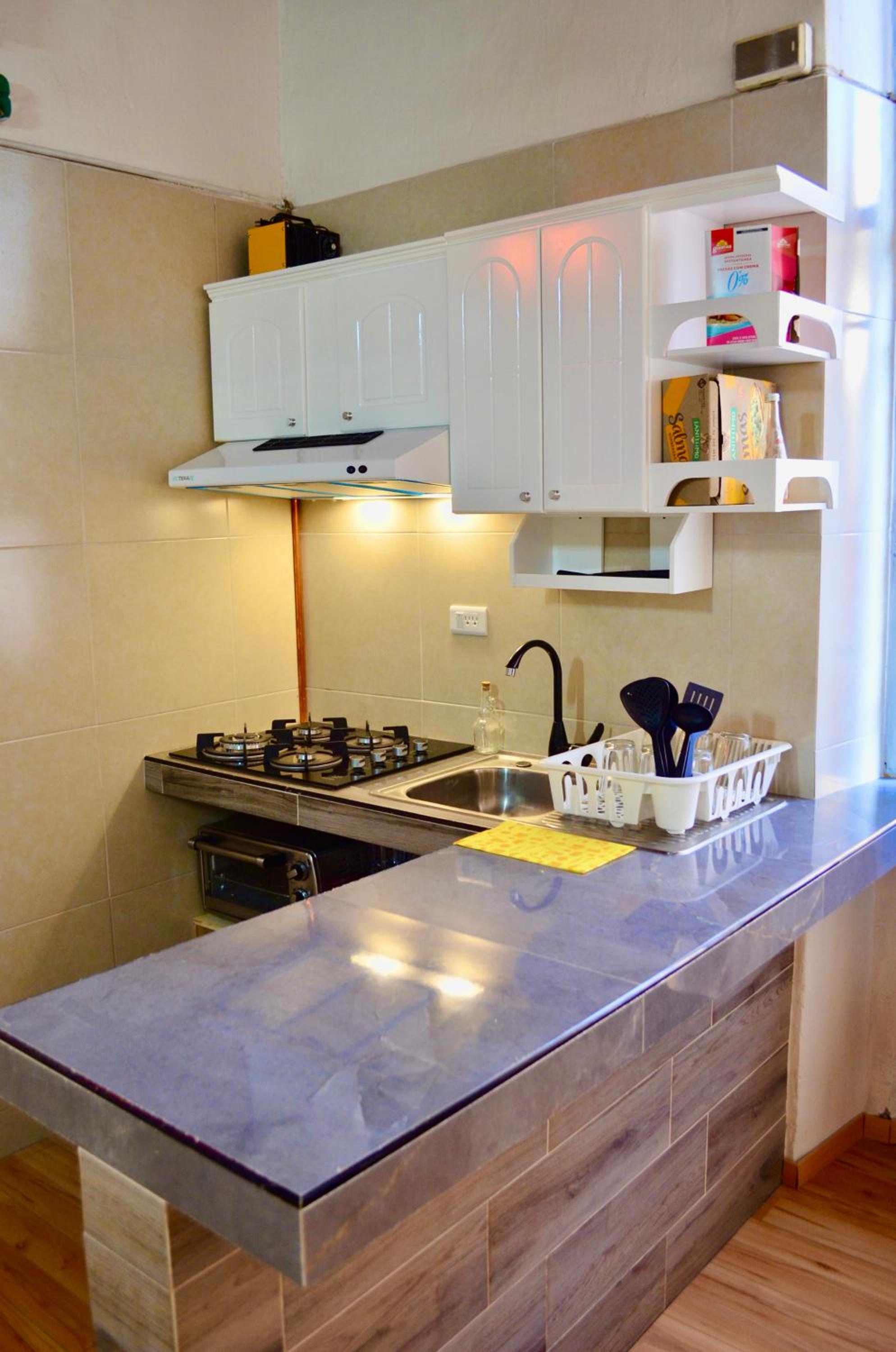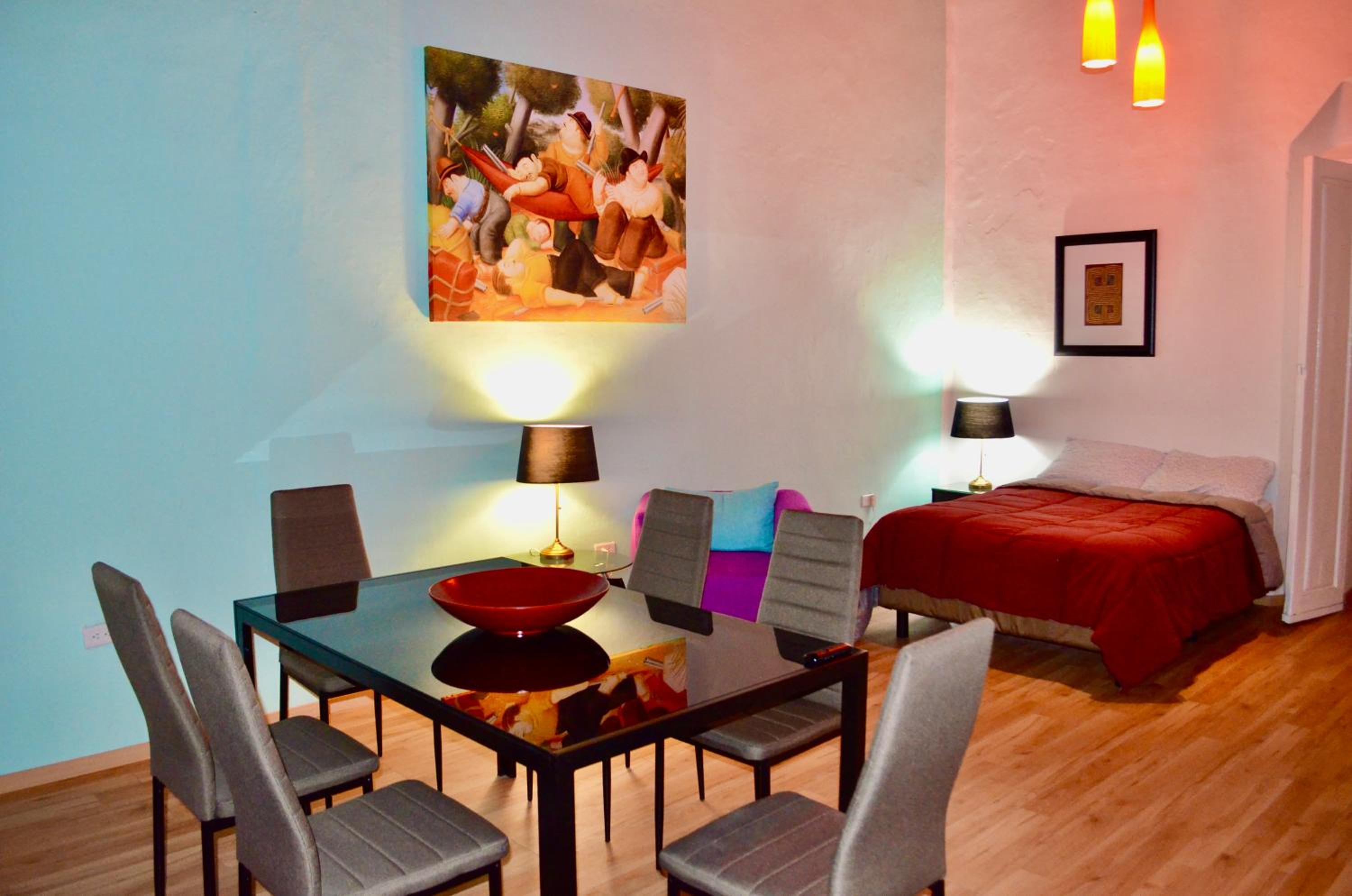 The apartment was spacious and very comfortable for our month's stay. The high ceilings and two balconies overlooking the street added to the open and airy feeling. The kitchen had everything we needed (full-size refrigerator, microwave, full-size cooktop), and the dining room was large.