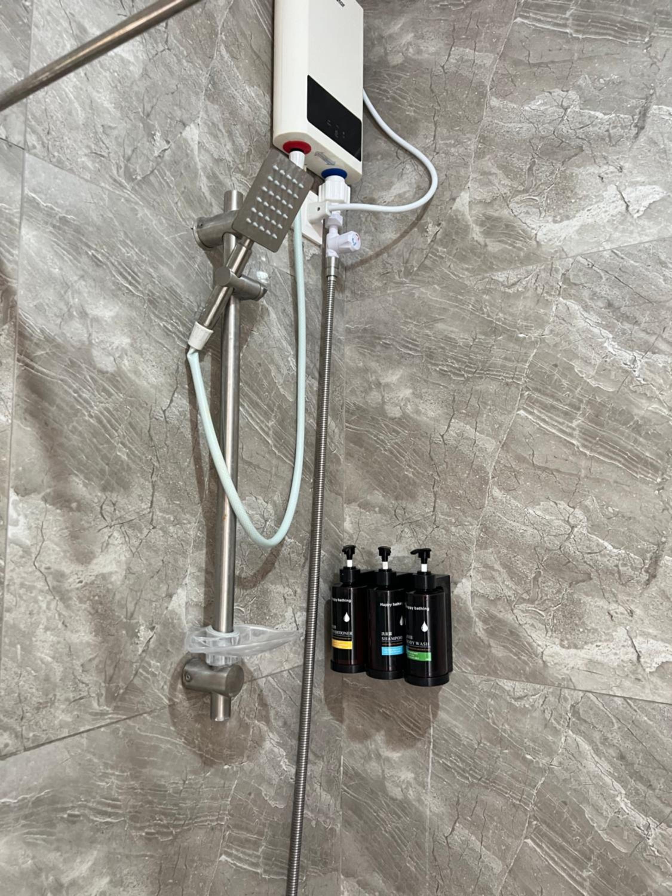 Hot water heater in shower didn't work . No soap was present in room at the sinks or shower. No drinking water available.