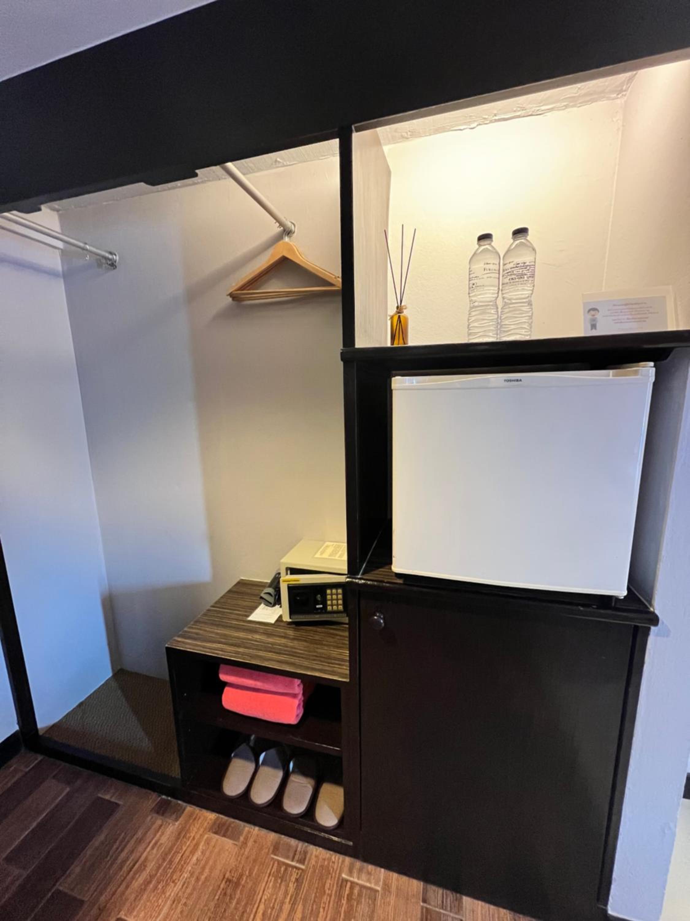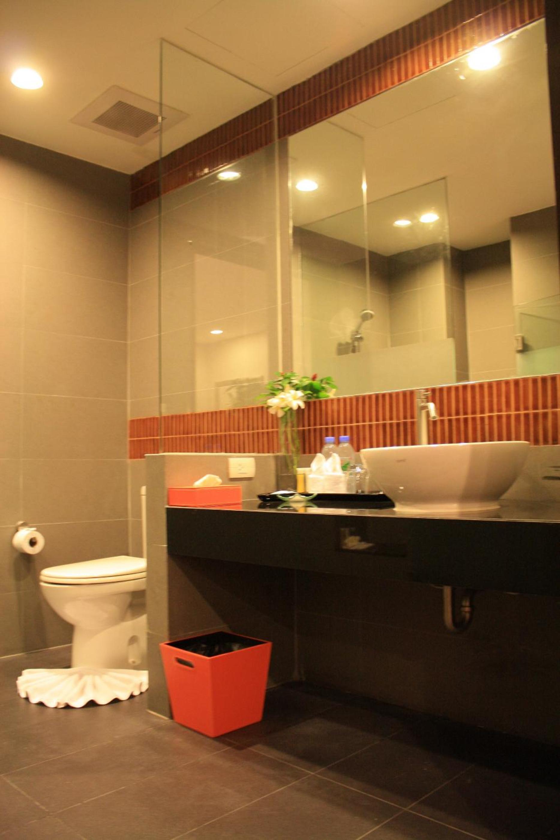 ห้องมีกลิ่นอับนิดหน่อย ไฟหน้ากระจกน่าจะเป็นสีขาว แต่งหน้าลำบาก แต่ชอบกระจกใบใหญ่ดี