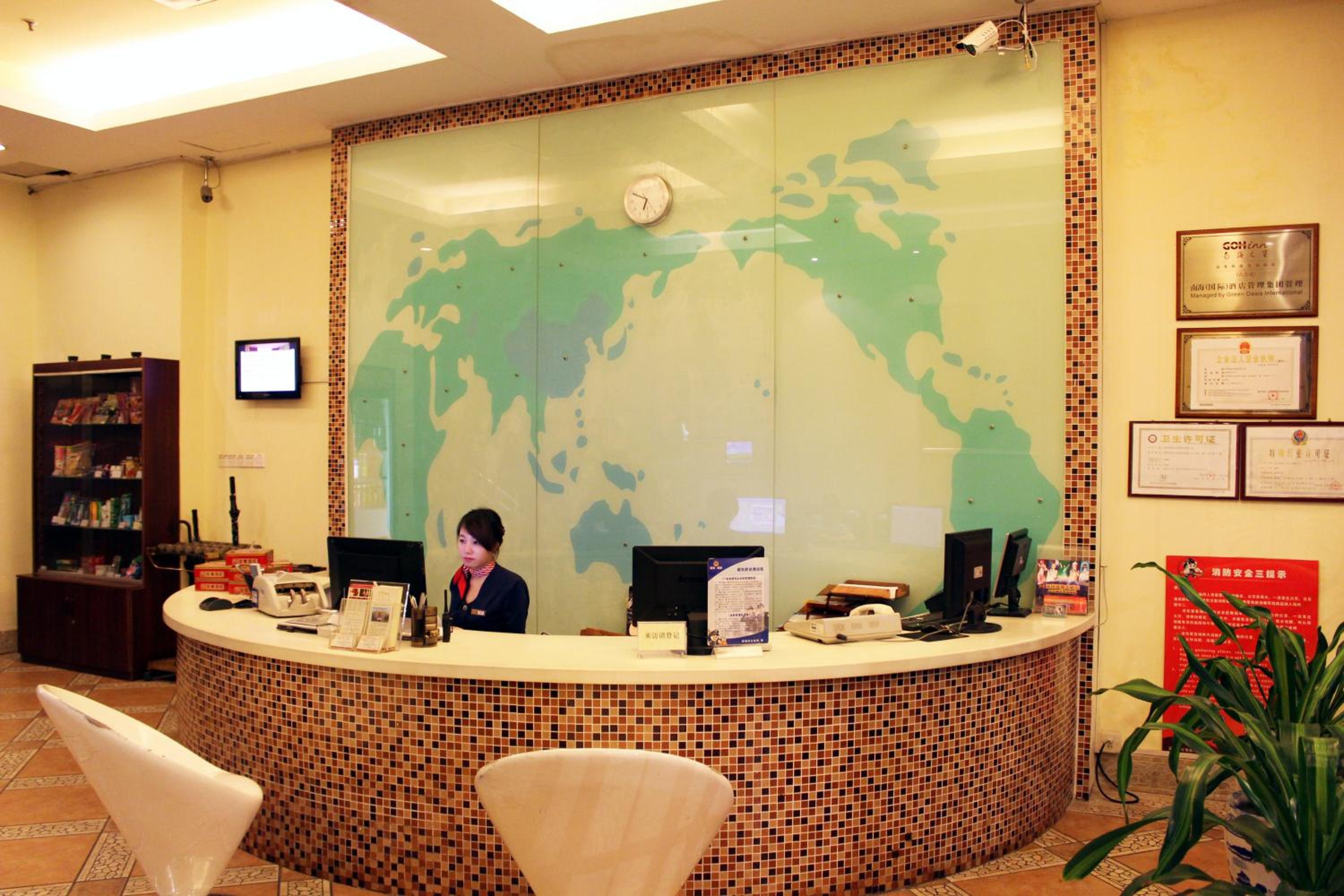 Take bus M371 to the bus station of Bao’an Jiaotong Ju, cross the street by the overline bridge, then walk about 164 feet to the next parallel street. Green Oasis Hotel is just around the corner.
