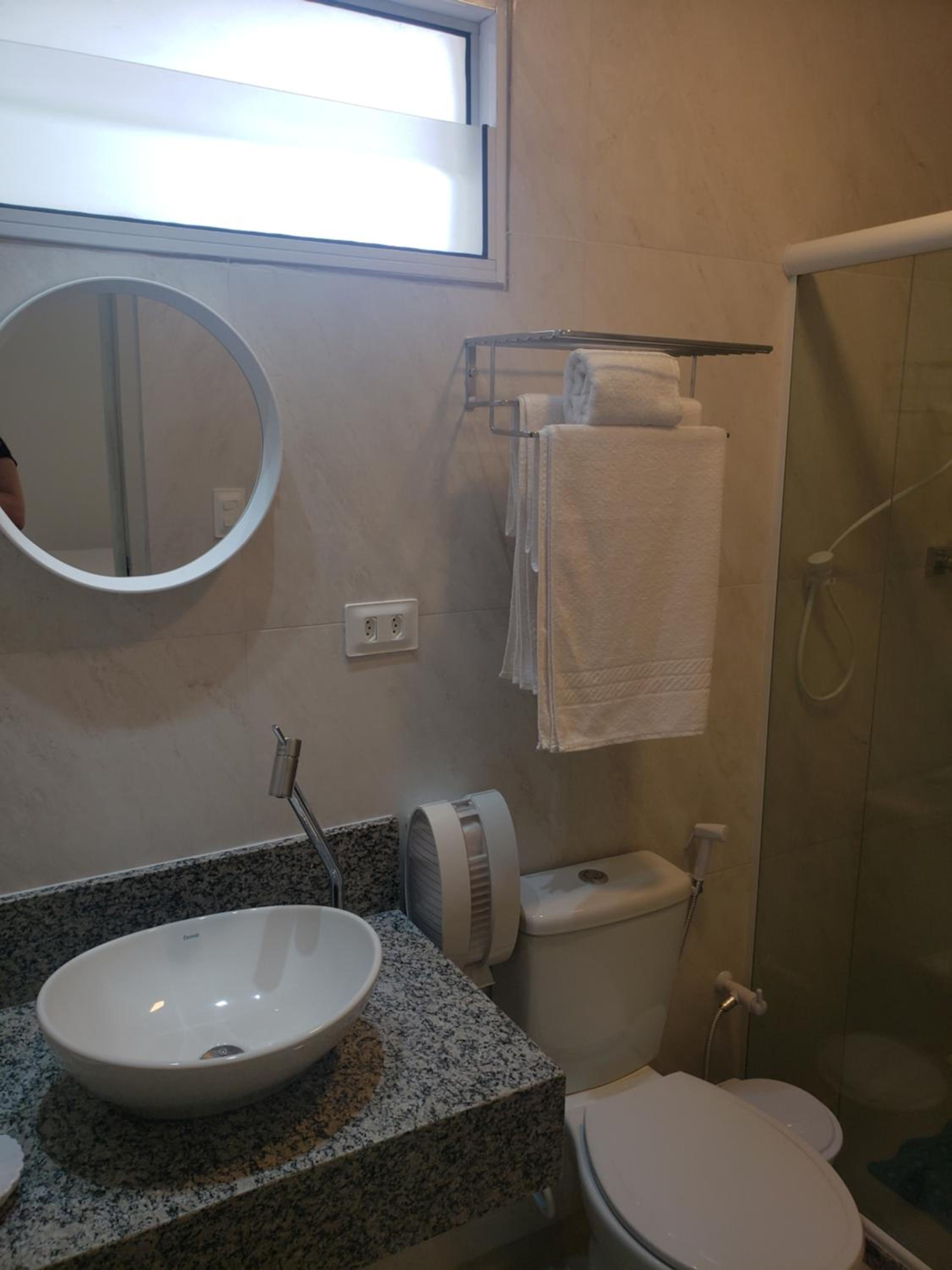 O banheiro grande e bem arrumado, com sabonete líquido para lavar as mãos além do sabonetes e shampoo. Tinha secador de cabelo e ferro e tábua de passar roupa disponível. A cozinha compartilhada maravilhosa com tudo que precisamos para cozinhar , além de fornecer bolos e doces , café, chá, frutas se quisesse lanchar. A dona super educada e receptiva, fez um bolo de milho maravilhoso para os hóspedes. Tinha cadeiras e guarda-sol disponiveis para praia.O flat fica pertinho da praia e do centro da feirinha de porto. Incrível! Voltaremos concerteza. A cama era cama de casal mesmo.