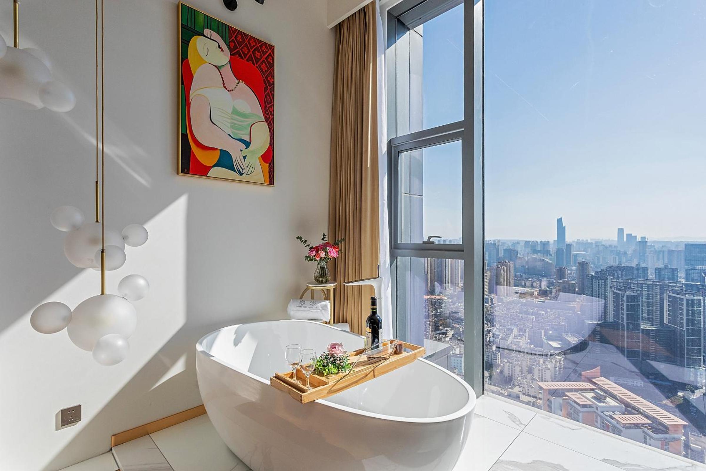 Spacious and luxurious furnishings and fixtures. Fully equipped kitchen, love the bathroom and toilet separated. Bathtub in living area overseeing beautiful skyline of Kunming city from high floor. Big movie like screen with good sound effects. So comfortable and enjoyable living experience.