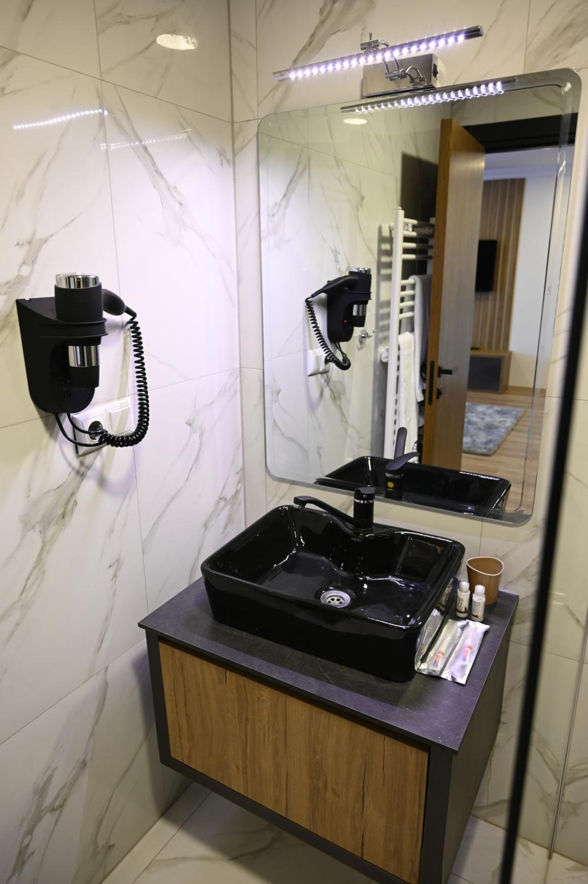 Glass dividing the shower should be marked better, my friend with bad eyesight kept hitting it constantly after washing hands.