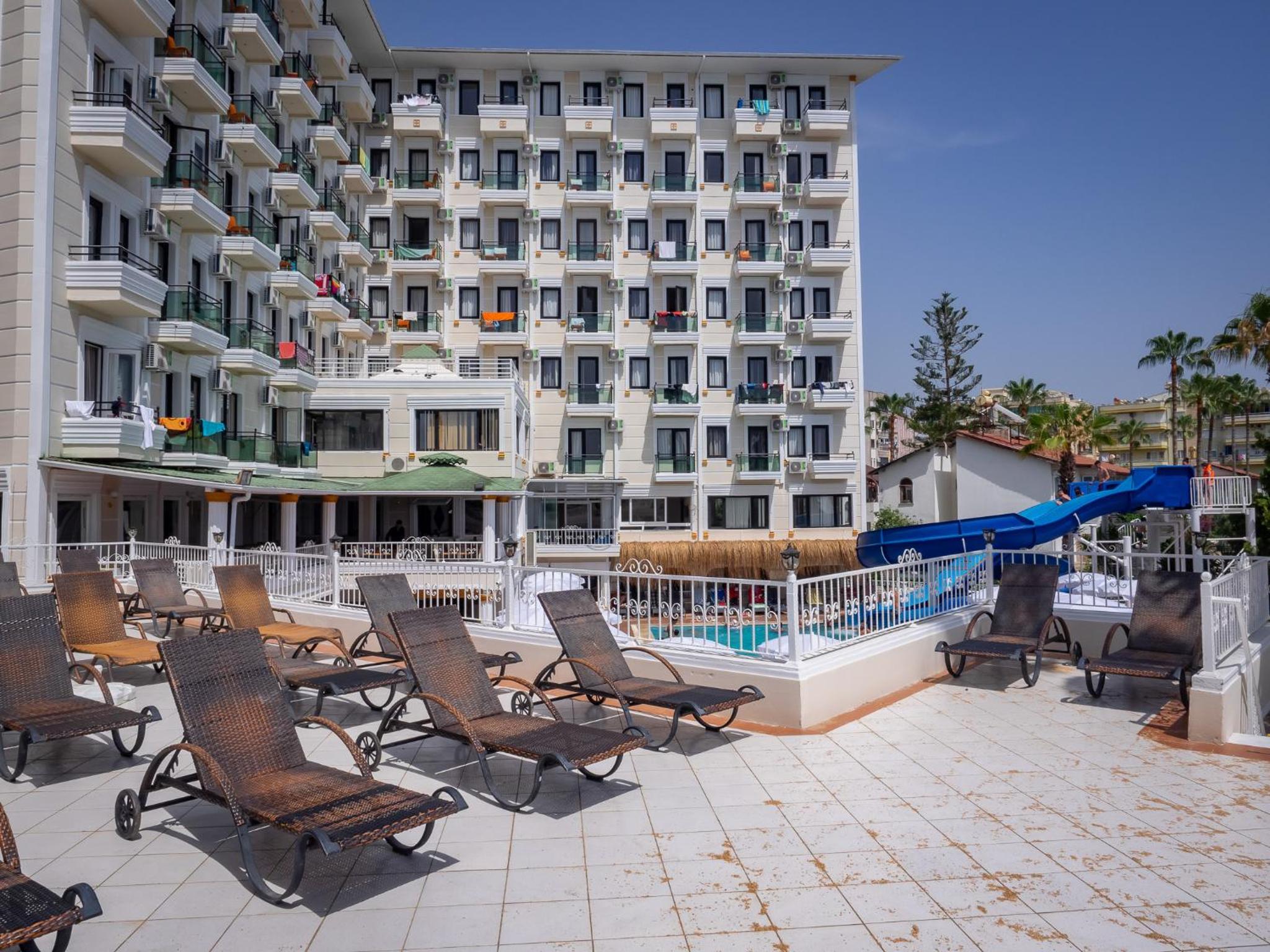 Заходим в лифт - он старый мрачный и на стенах нацарапаны надписи _ "Толик Омск здесь был" Поднимаемся в свой номер по мрачному коридору, открываем дверь на 4 этаже по моему 404 - вид на внутренний двор и какую-то помойку. Хотя обещали вид на море. В номере на стене нацарапано гвоздем - "СУКА" . Постель мега грязная и в катышках. ПРОСТО ЖЕСТЬ! номер маленький прокуренный и вообще зашарпанный и вонючий. Дверь на балкон не закрывается полностью на ручку или на замок. Раскисла или разбухла. Тут же спустились на рецепшен и нам вернули деньги и срезали бирки с рук. Да - у них даже платежный терминал на рецепшене при нас развалился на части. батарейки, весь располовинился и развалился. Короче вот такие впечатления. Мужчина на рецепшен выглядел очень уставшим и сказал что он все знает. Проблем нет - деньги вернет - пишите что хотите. Хорошо мы приехали на своем авто - вышли сели в тачку и уехали в Аланью. Там сняли супер квартиру с видом на море немного дороже. Чистую просторную с огромным балконом и каждый день в ней делали уборку.