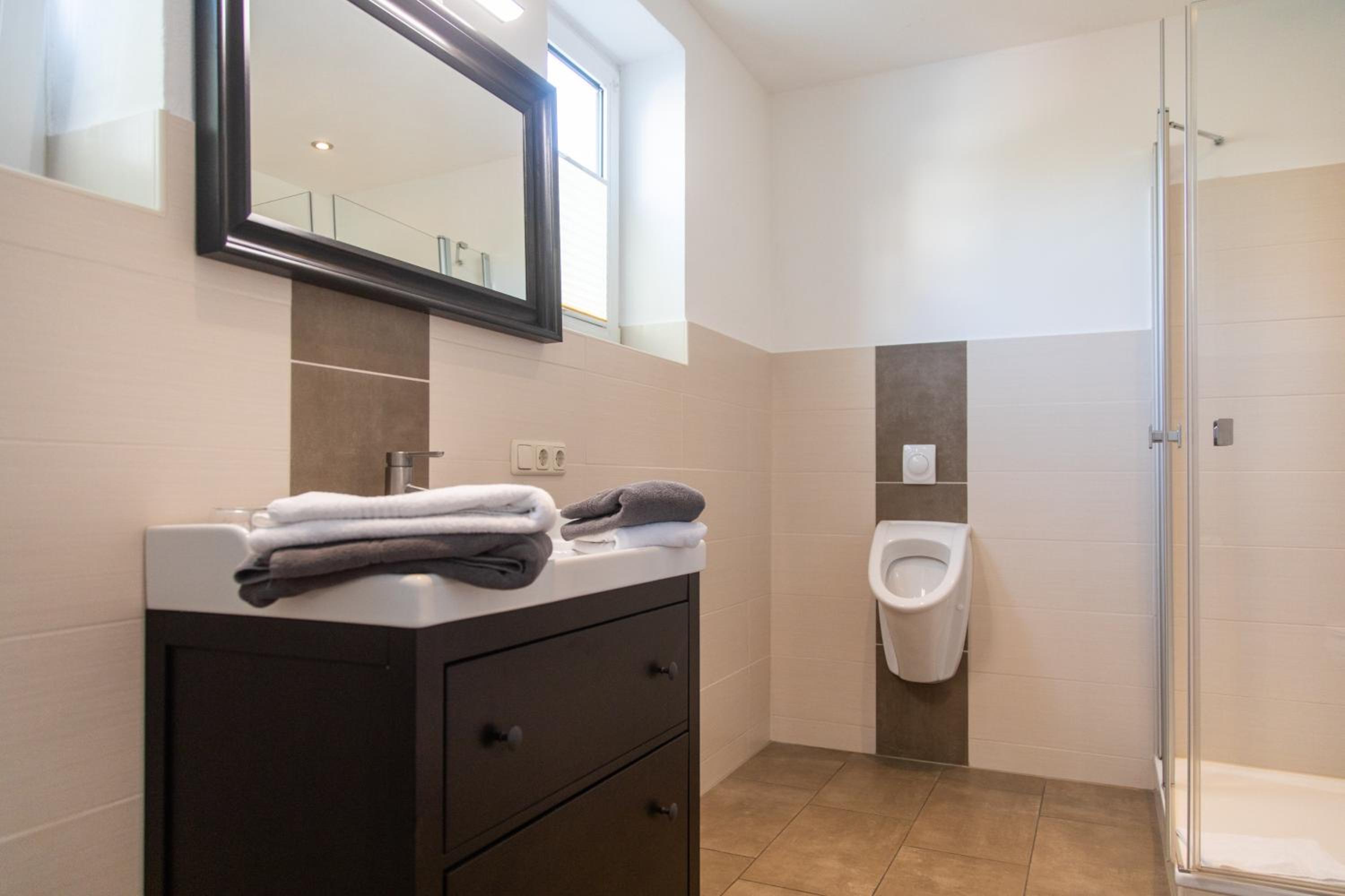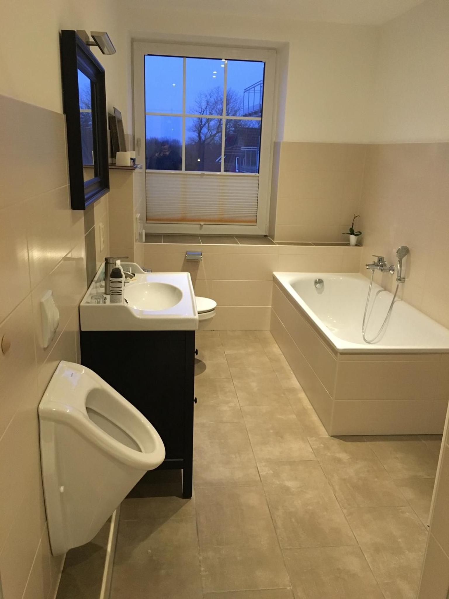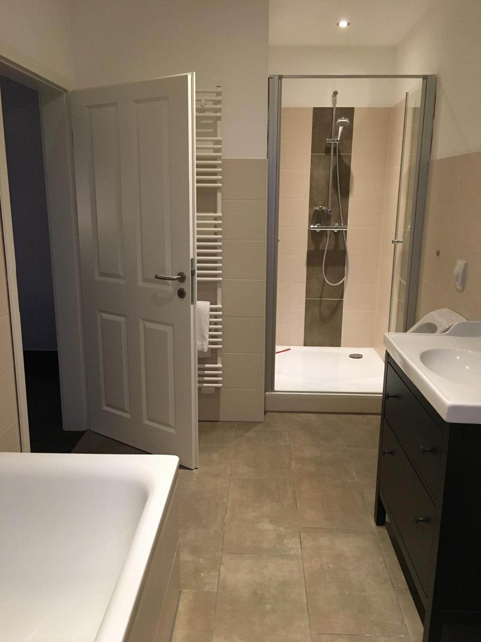 Badezimmer ohne Handtuchstange.