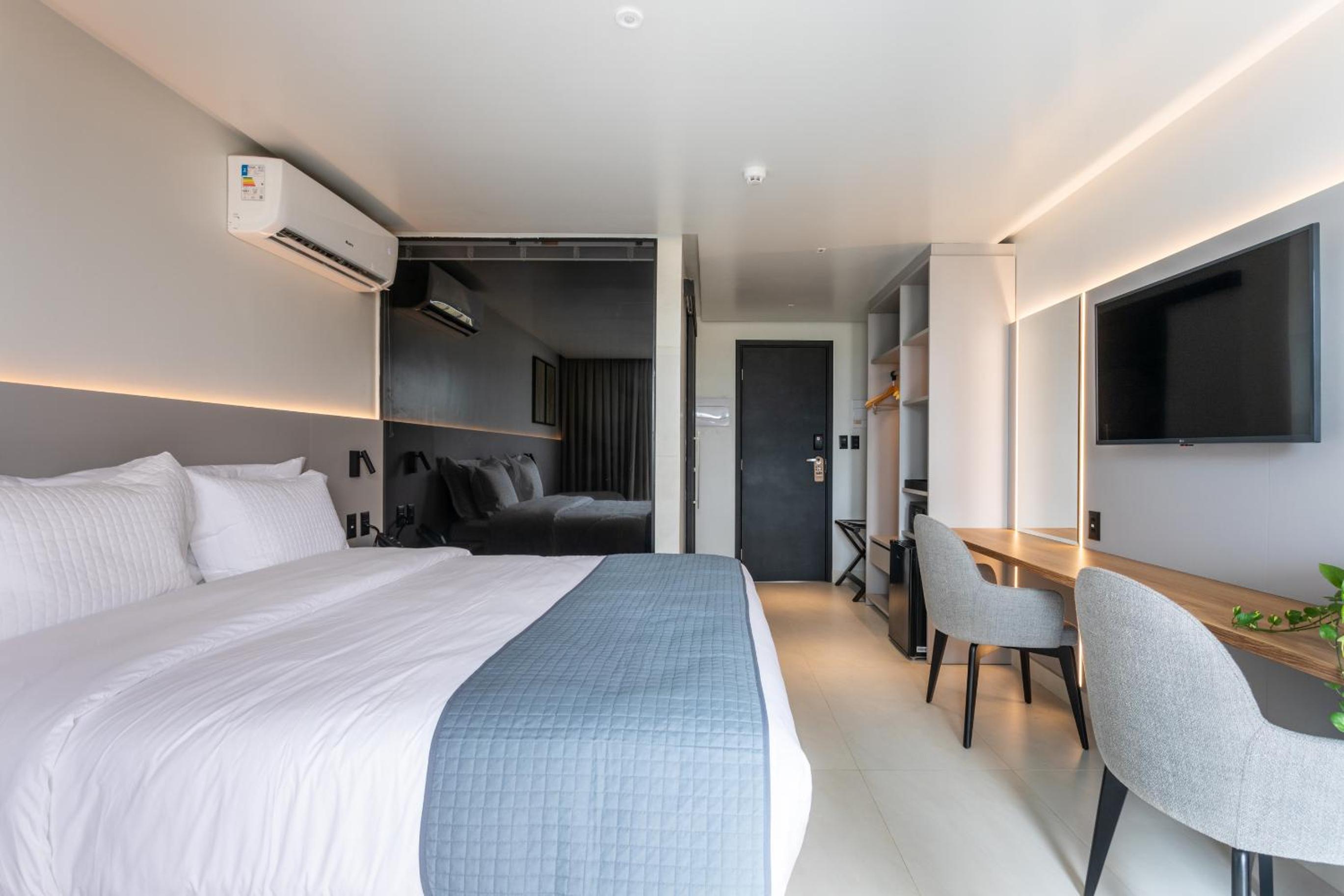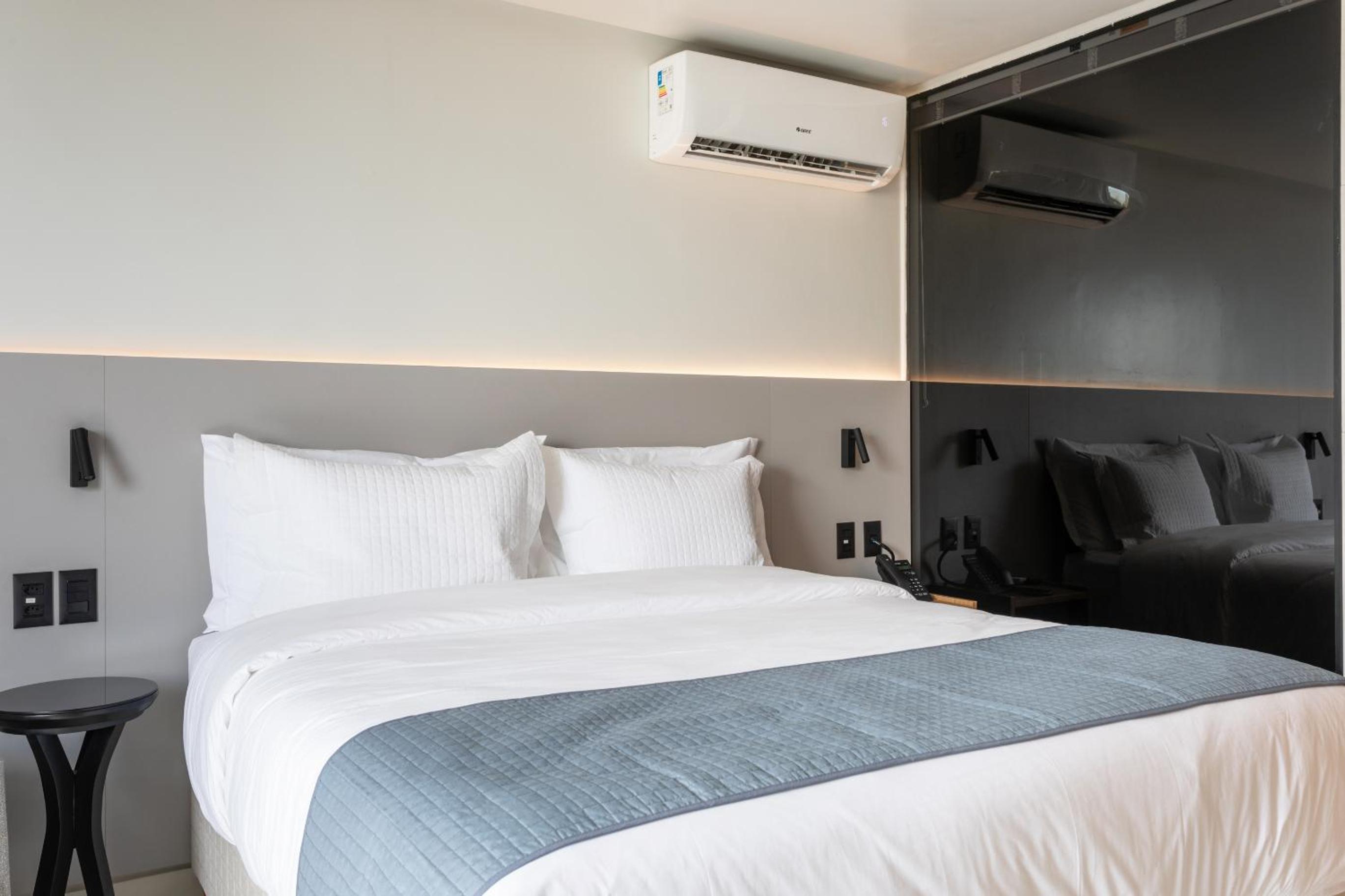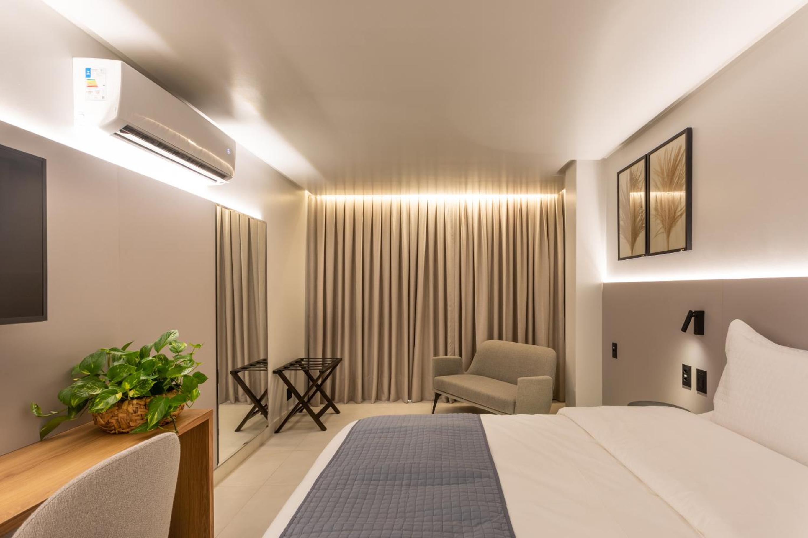 O ar condicionado fica localizado frente a cama o que impossibilita seu uso no momento de deitar já que o ar frio chega diretamente no rosto. Sugiro avaliar essa localização já que compromete muito s experiência e vira um problema.