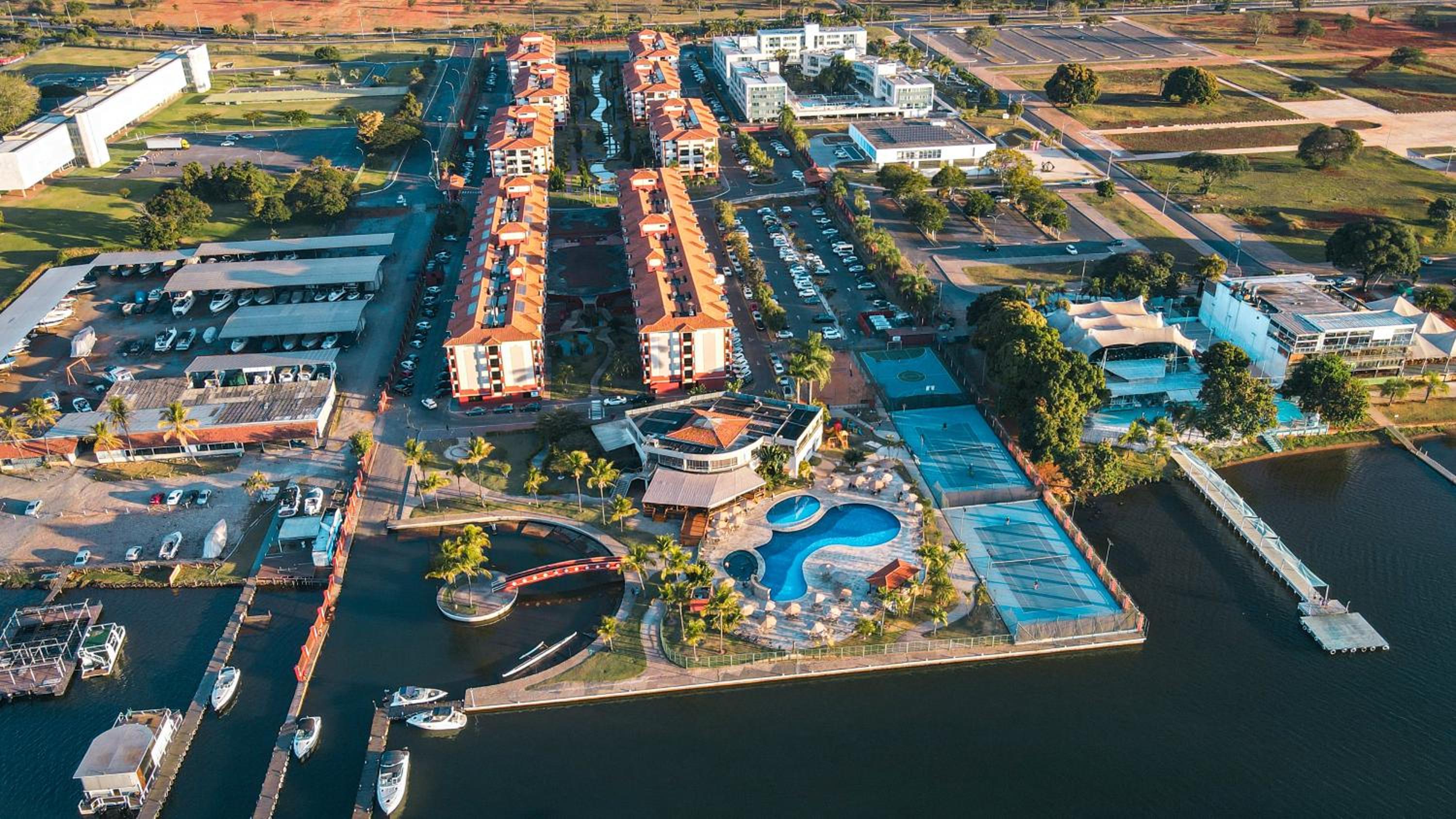 Acomodação, área de lazer, restaurantes e comércios dentro do condomínio.