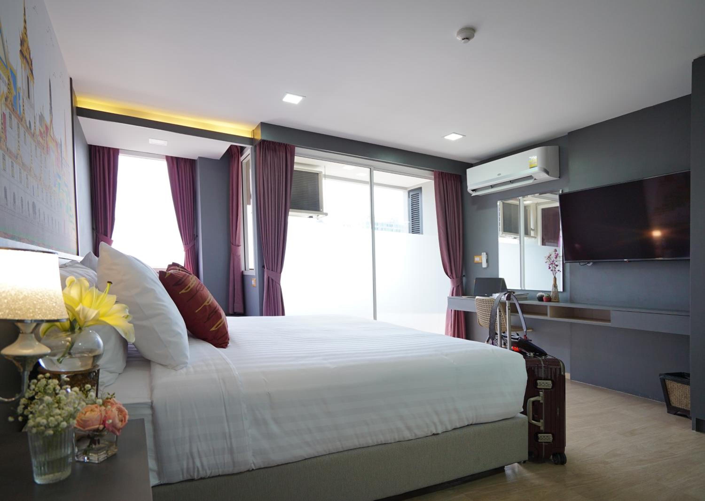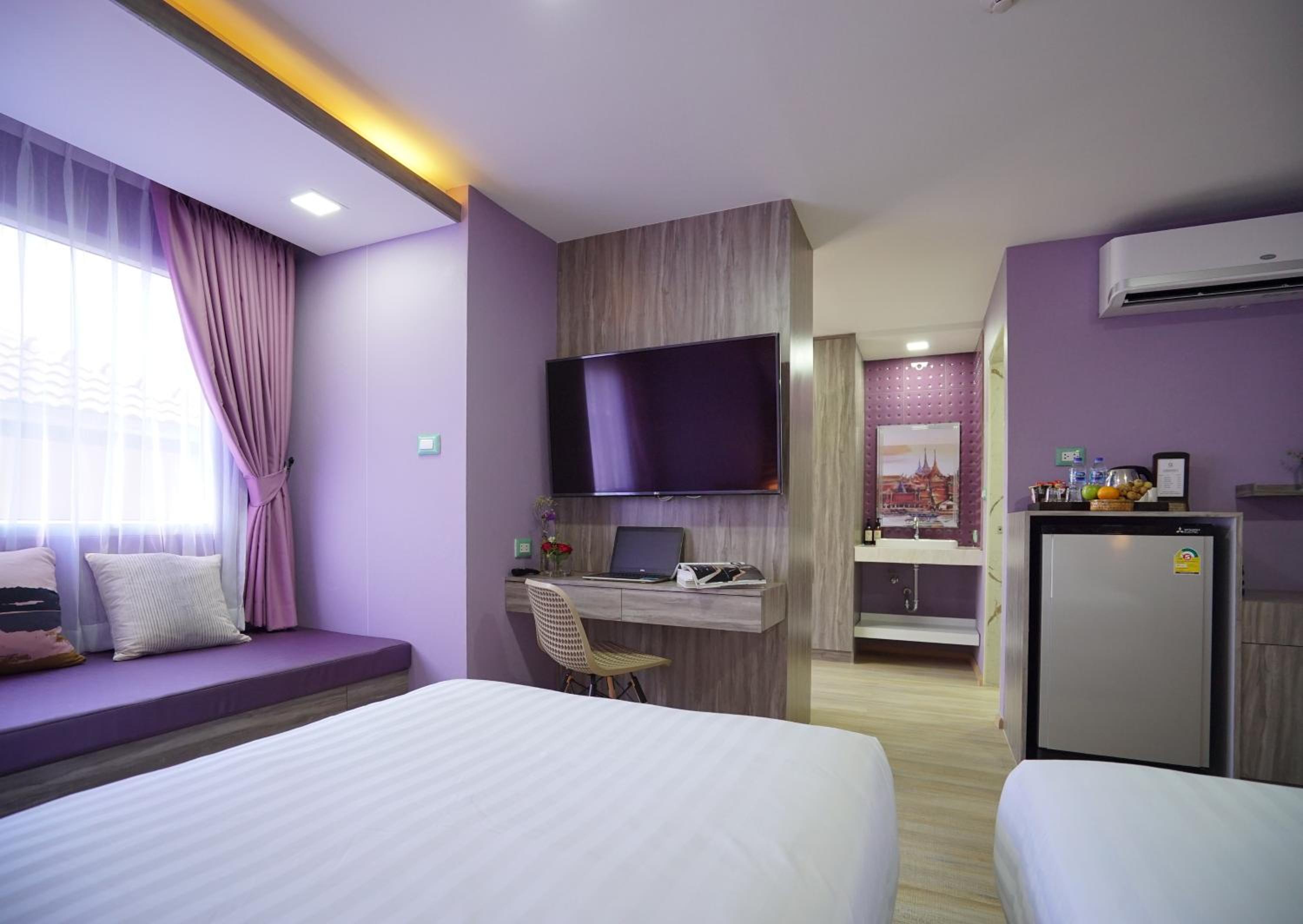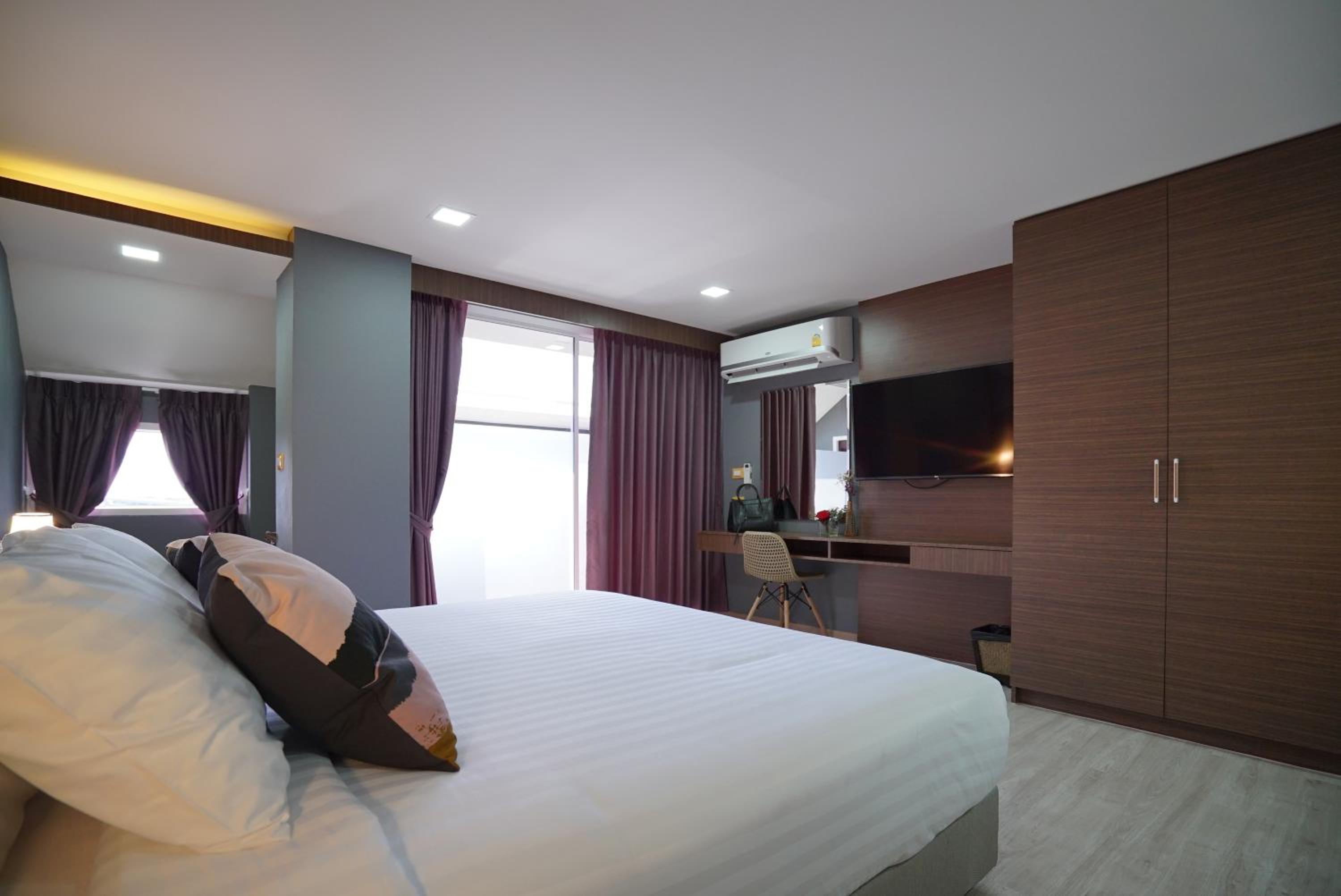 The Qube fifty Hotel, located in Bangkok, offers a tranquil garden, perfect for relaxation, and certain units feature balconies with stunning city views.