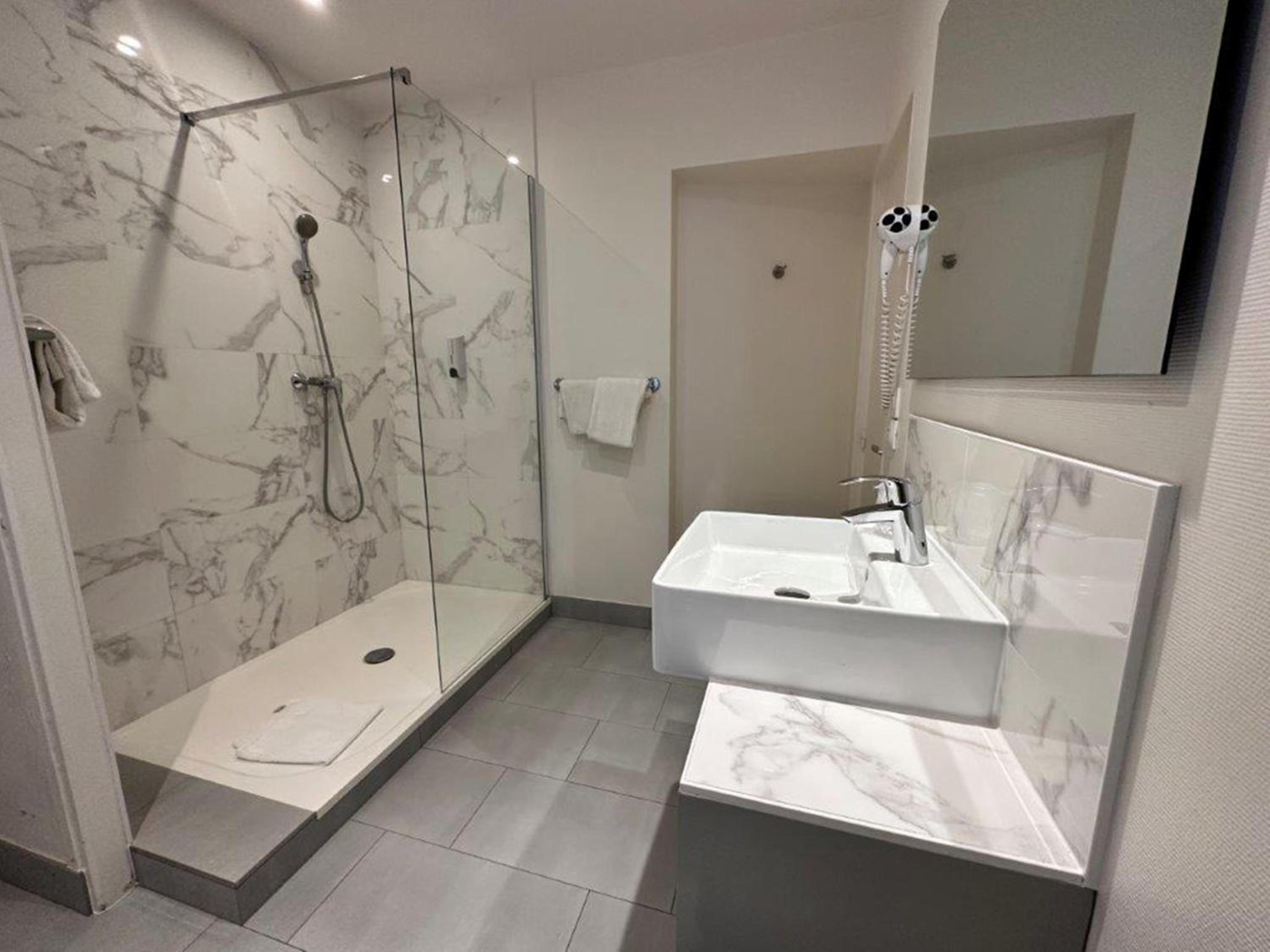Lit confortable et salle de bain spacieuse avec sèche cheveux.