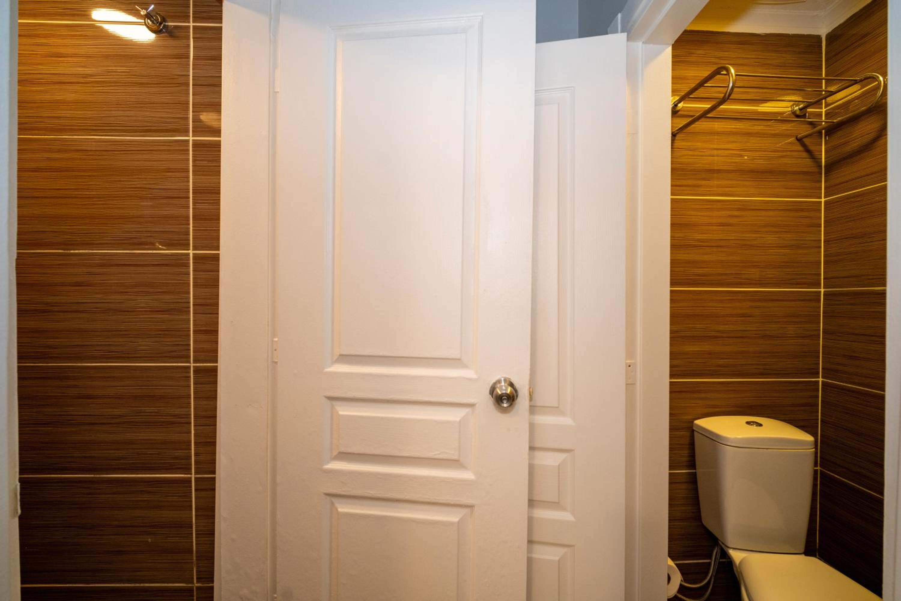 Le bruit des climatiseurs extérieurs : ils se déclenchaient par intermittence, donc très bruyants en pleine nuit. L'état du mur dans les toilettes - un grand trou, qui pour l'instant n'a pas été comblé.