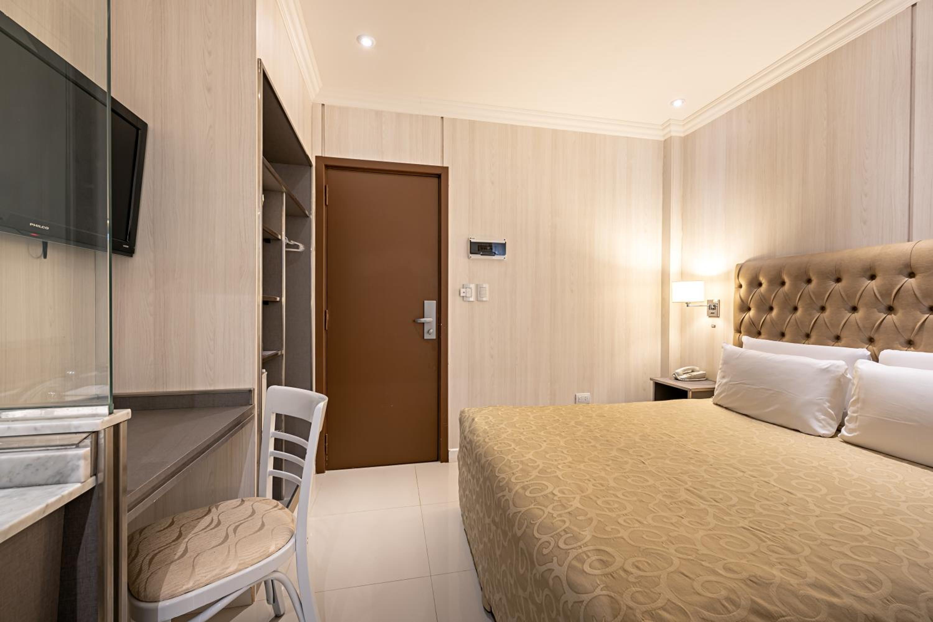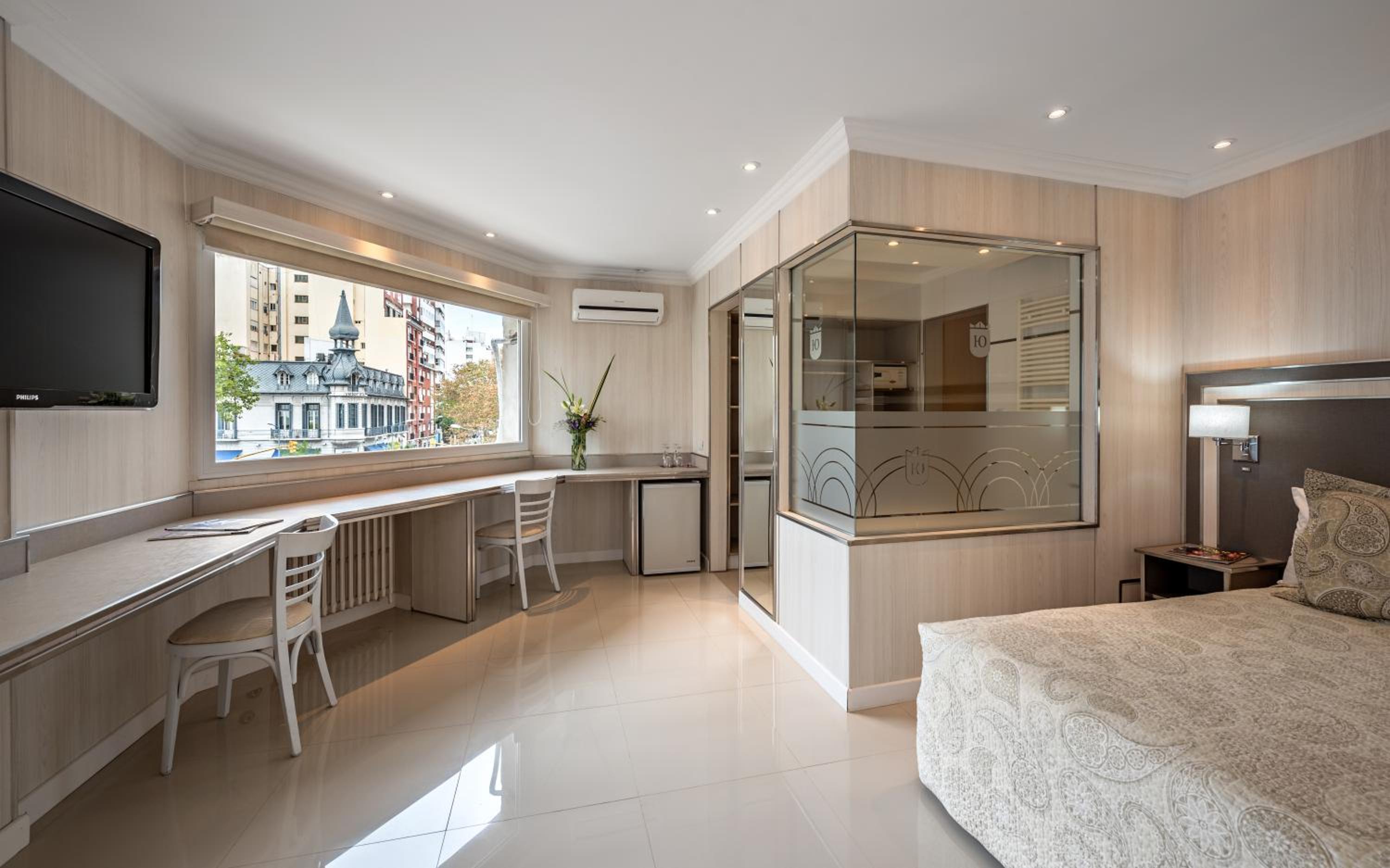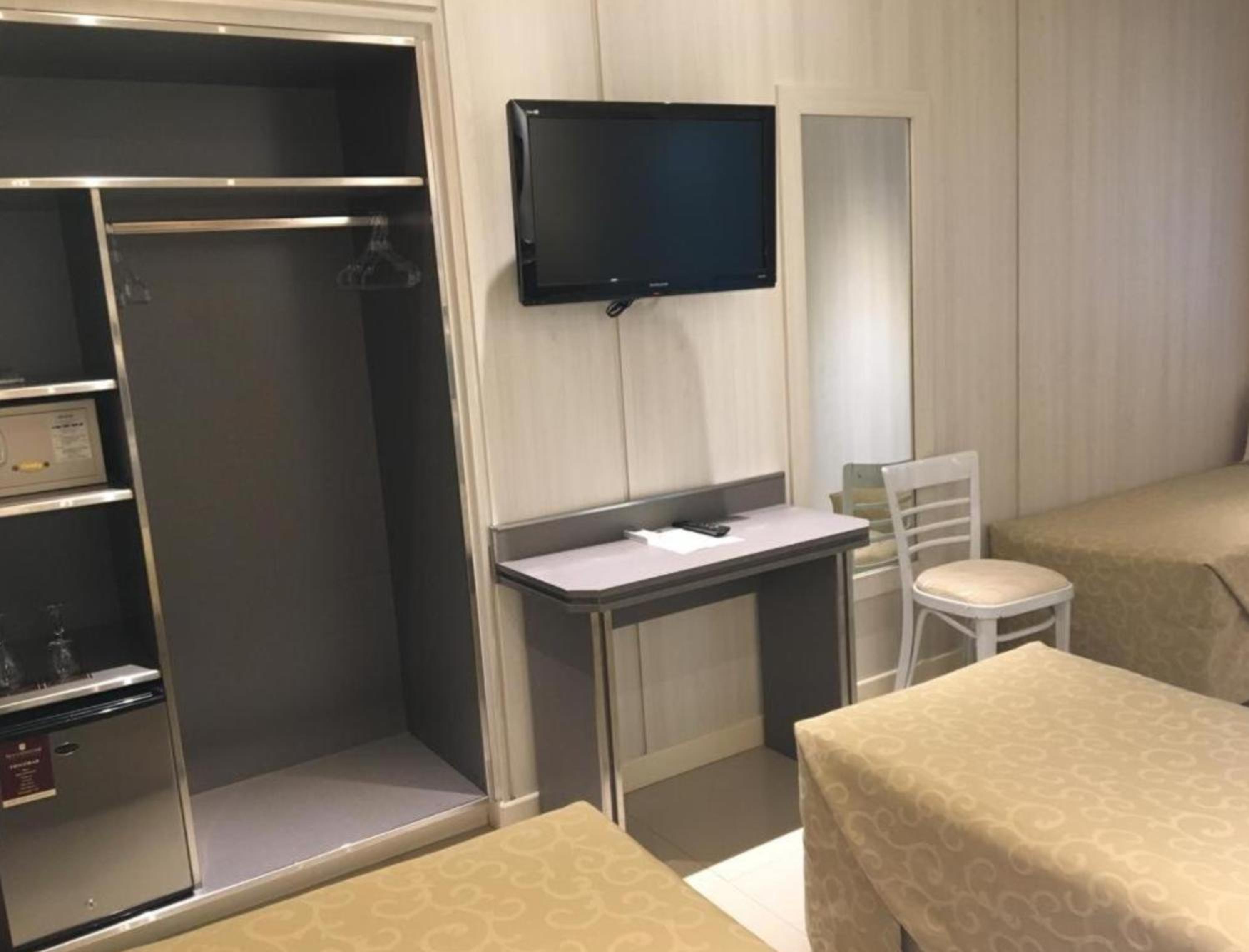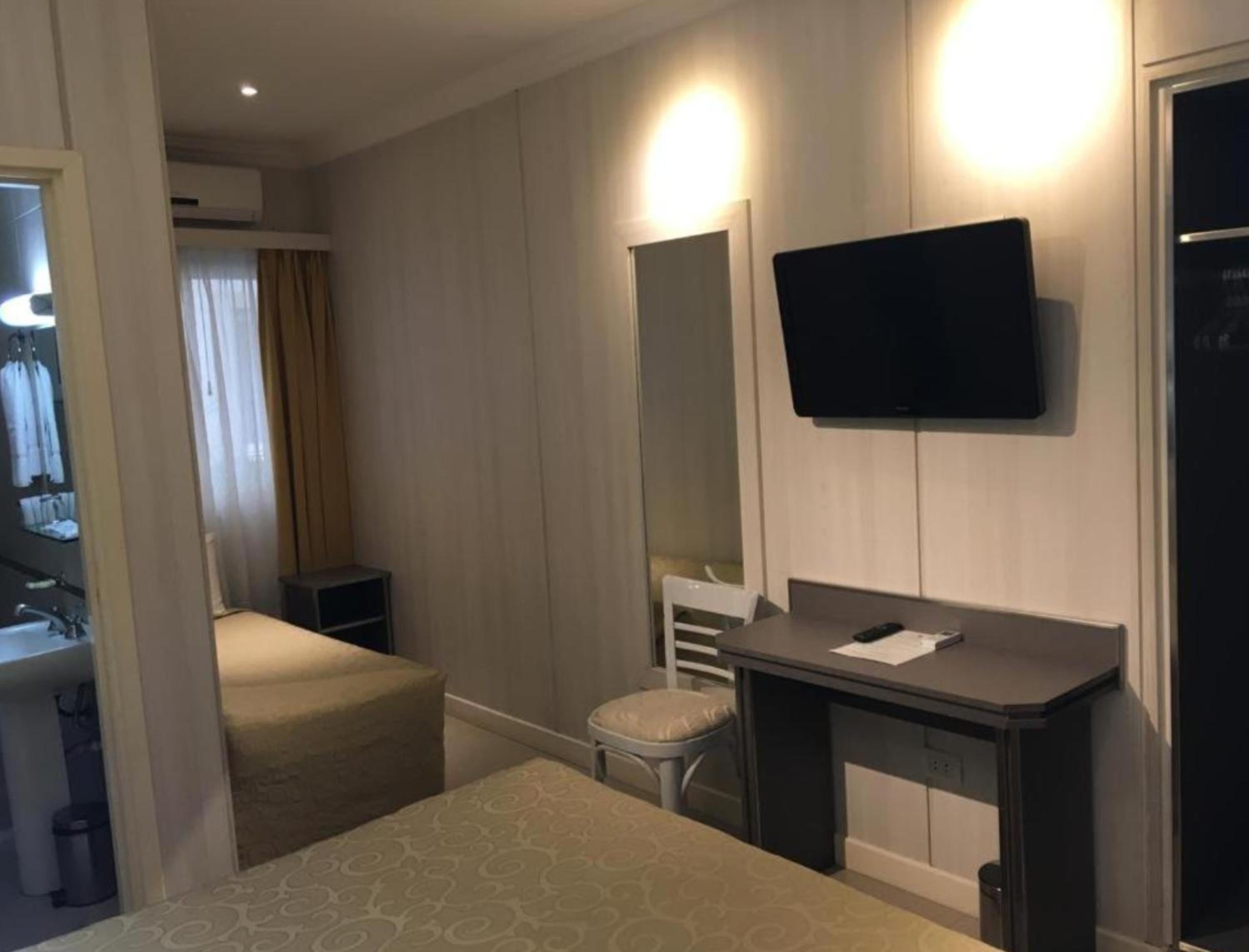 No volvería a este hotel. La habitación doble de dos camas daba a un pozo de aire en un primer piso lleno de palomas, lo que me impidió abrir la ventana. Le pedí a la recepción un cambio de habitación, aunque fuera con un cargo, y me dijeron que solo las habitaciones matrimoniales daban a la plaza. Que no tenía nada para ofrecerme. No era el cuarto lindo, ningún detalle tenía, el baño no tiene ventilación, no funcionaba el televisor con el mando a distancia y el llegar a la habitación demandaba un recorrido encajonado por pasillos estrechos. El baño tiene puerta de cristal, lo que le quita toda privacidad al sanitario y es incómodo en caso de compartir el cuarto, ya que el ante baño está integrado a la habitación con una abertura sin cerramiento. Las camas eran buenas, no así las almohadas. En fin un cuarto de hotel modesto.