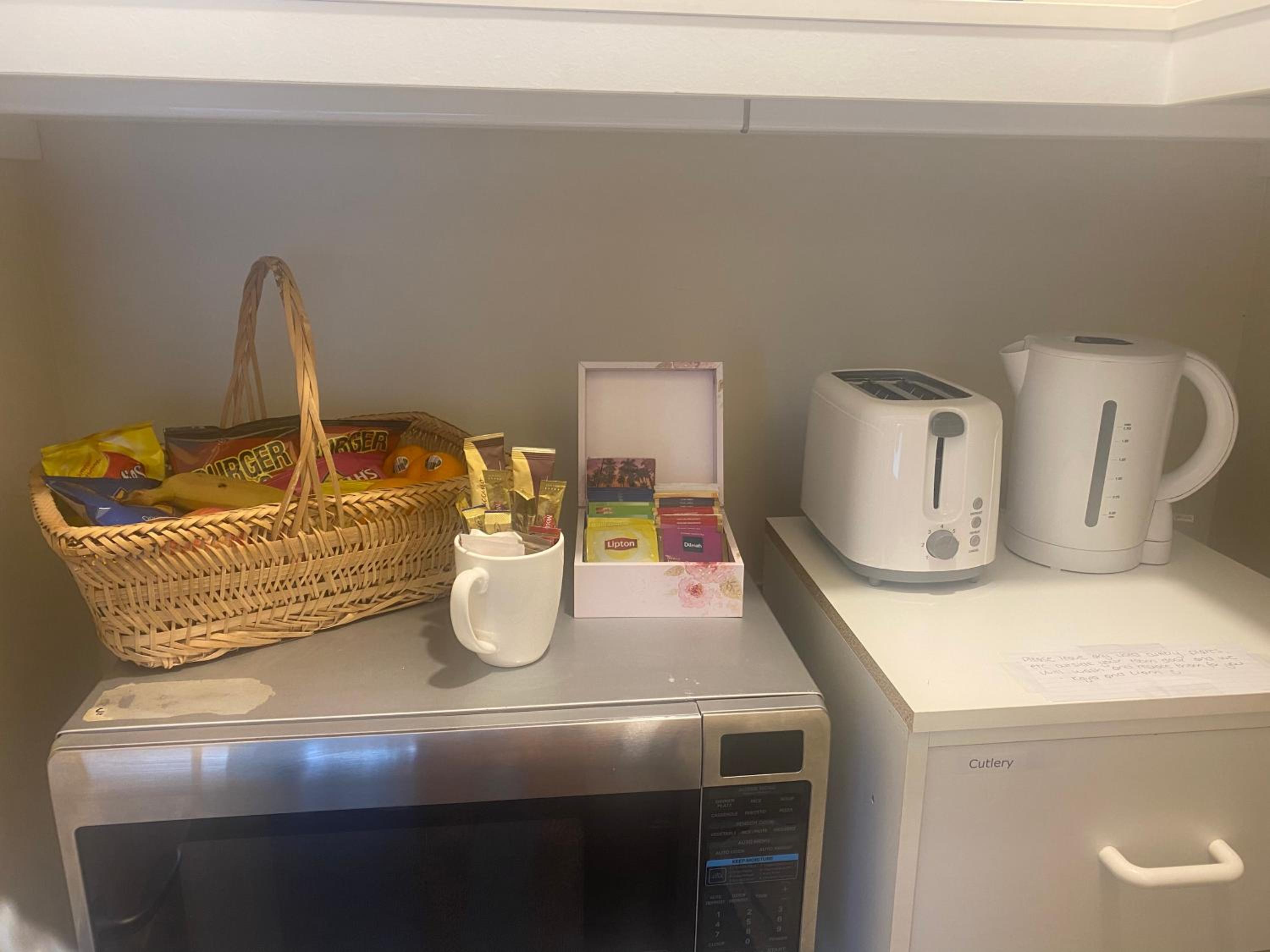 Little touches of fresh fruit in a basket and the fridge,lots of different teas and coffees.,plus snacks.