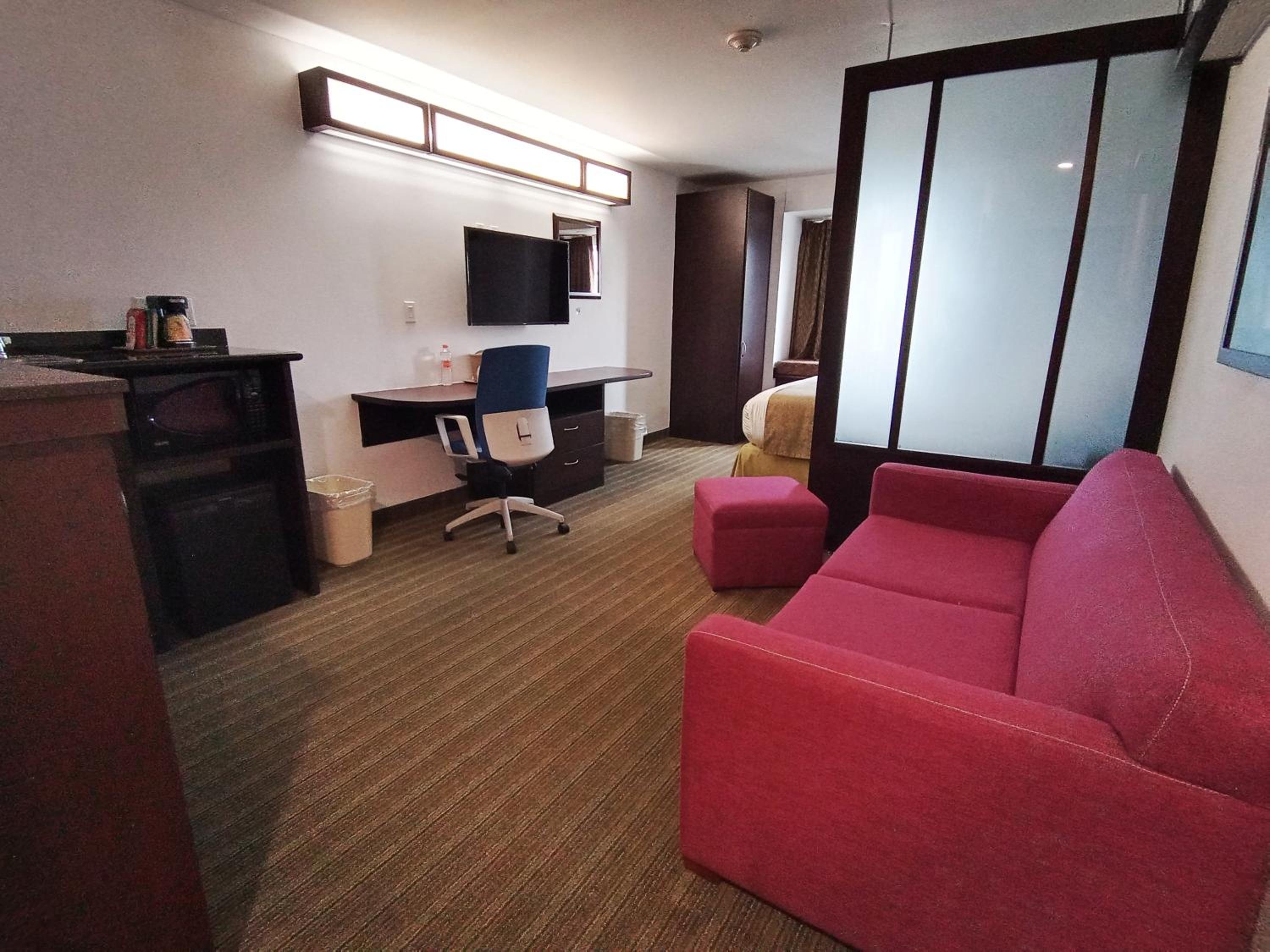 Excelente Ubicación muy cerca del aeropuerto Toluca. El servicio es bueno son muy amables, el desayuno es sencillo pero esta bien por que esta incluido en el precio de la habitación que es de costo accesible. El precio es mejor reservando en Booking que directamente. Reservamos una suite con una cama grande, la habitación es más amplia e incluye microondas, desayunador, un sofá, tina, etc.