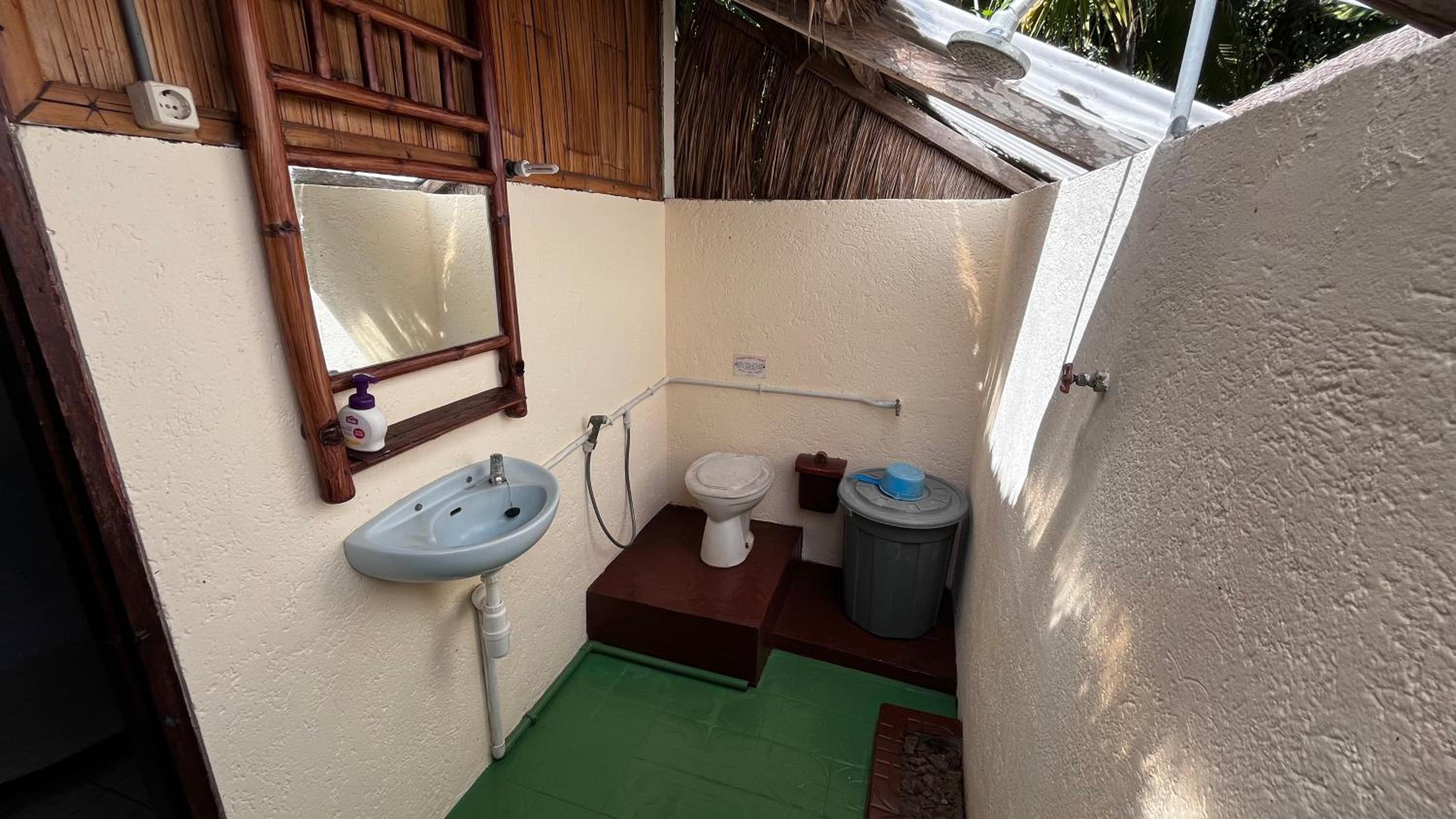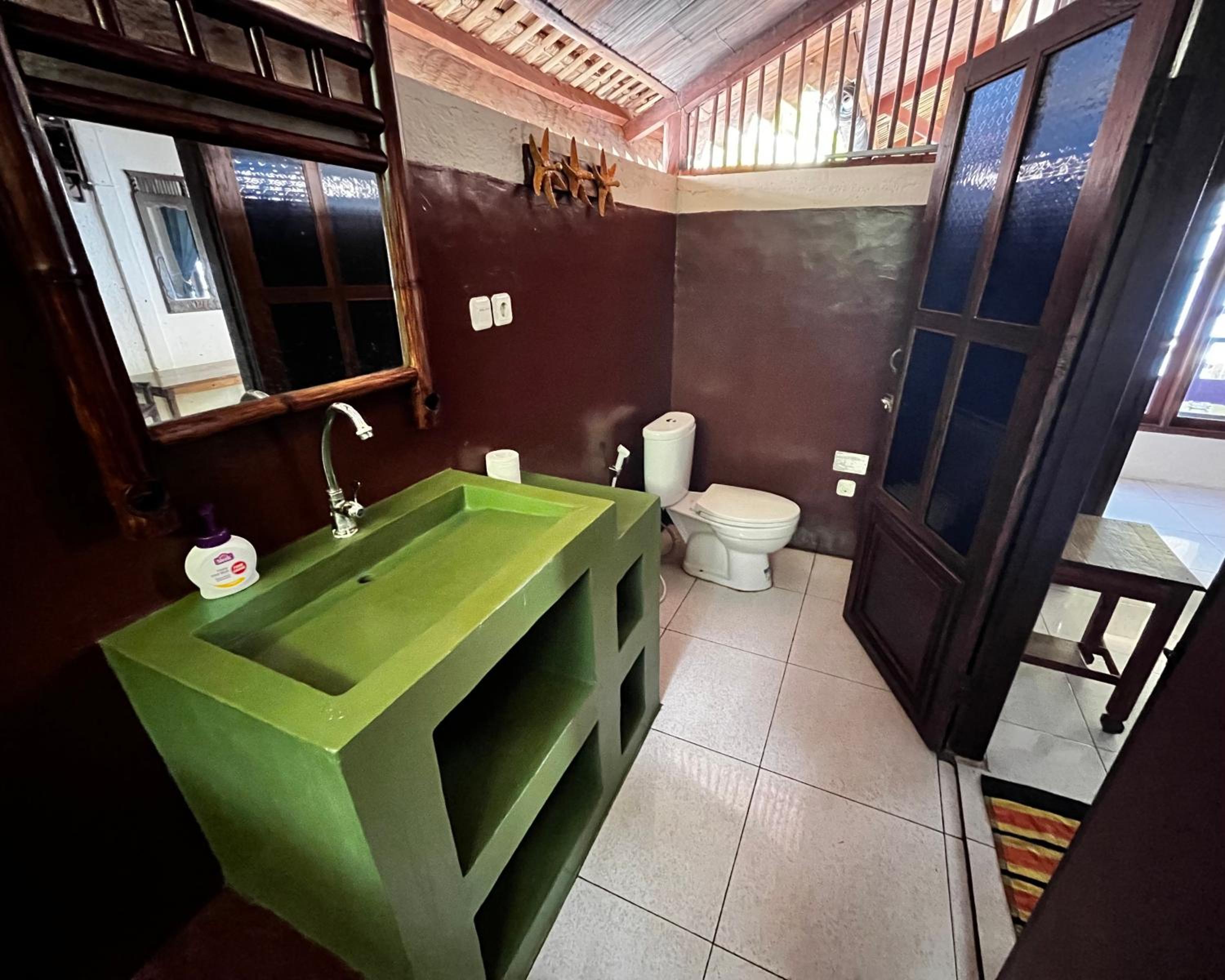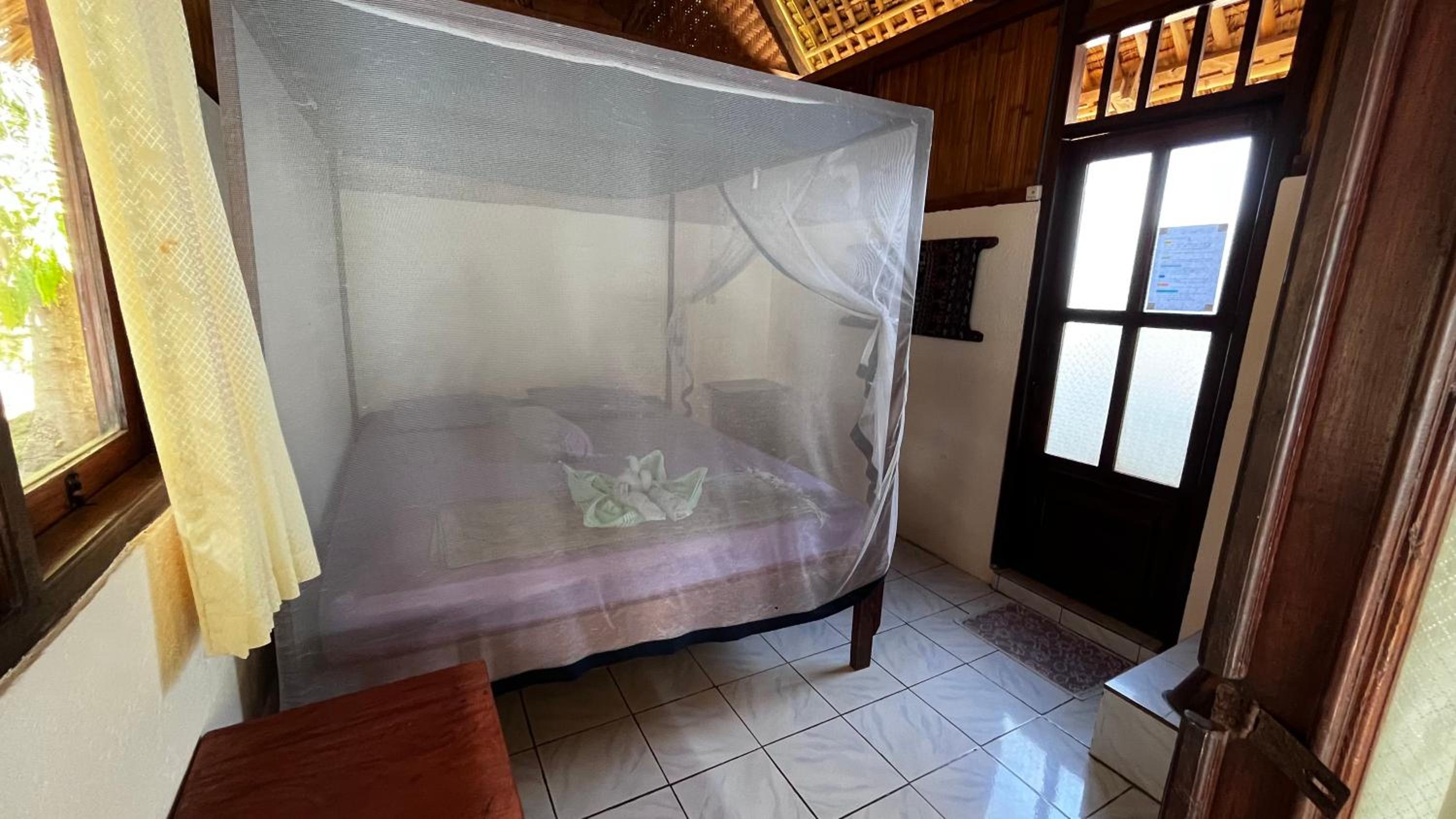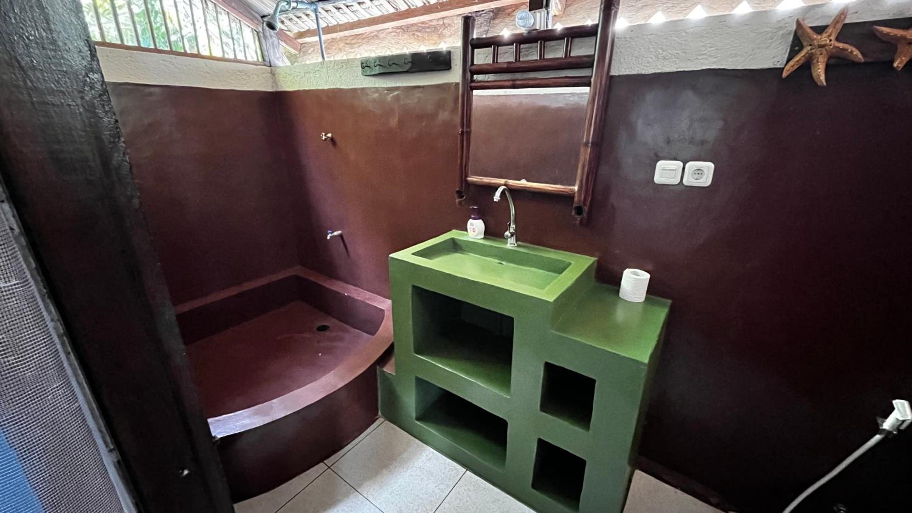 Trop cher pour la qualité des équipements ( pas de chasse d'eau, pas d'eau chaude, pas de climatisation, pas de WiFi) la chambre est très petite, le lit est très haut il faut escalader et pas de rangements. Vous êtes loin de tout pas de warung restaurant, il y a rien obligé de rester dans la guest pour manger. La piscine à plus la taille d'un jaccuzi très dessus
