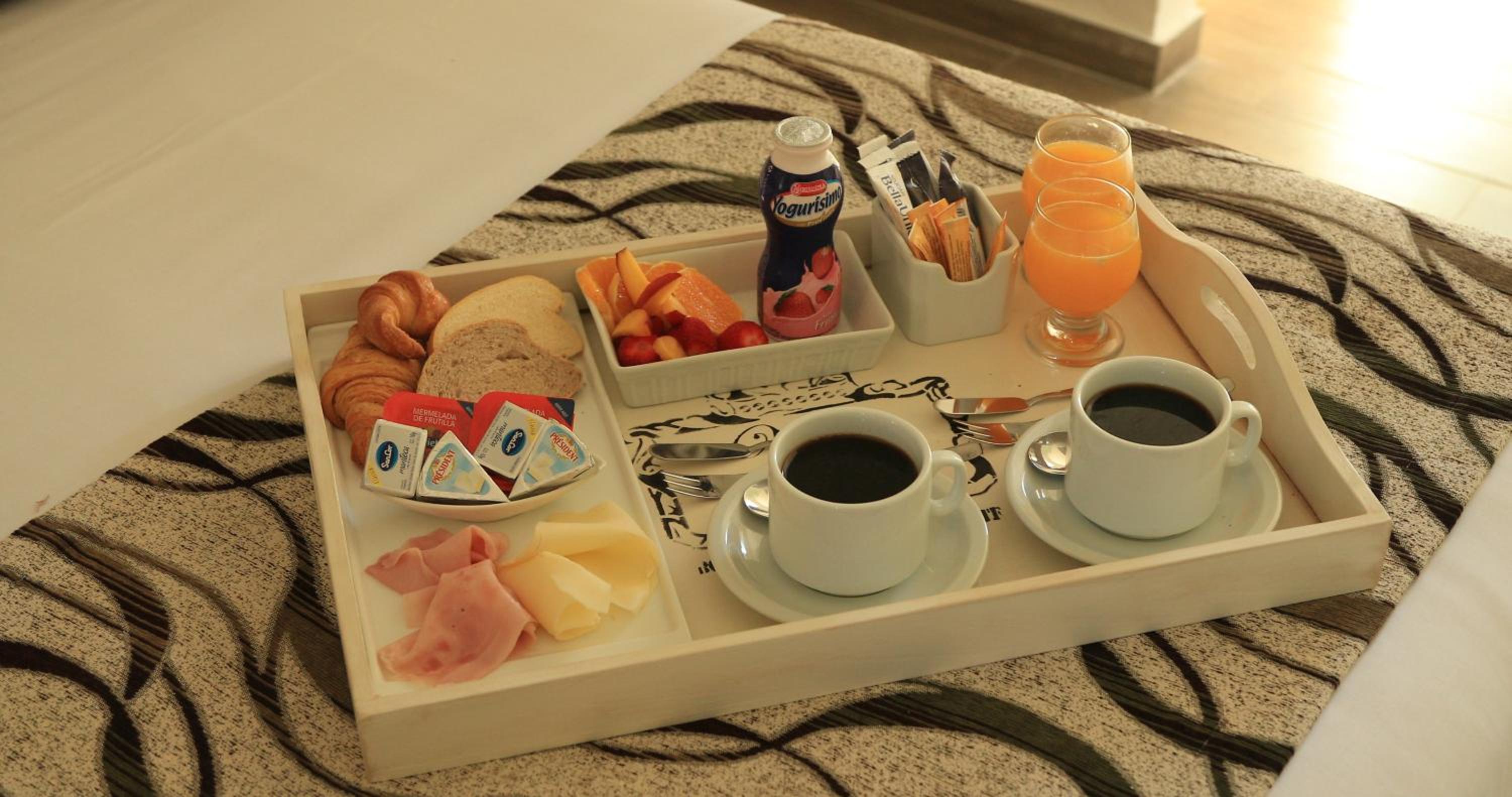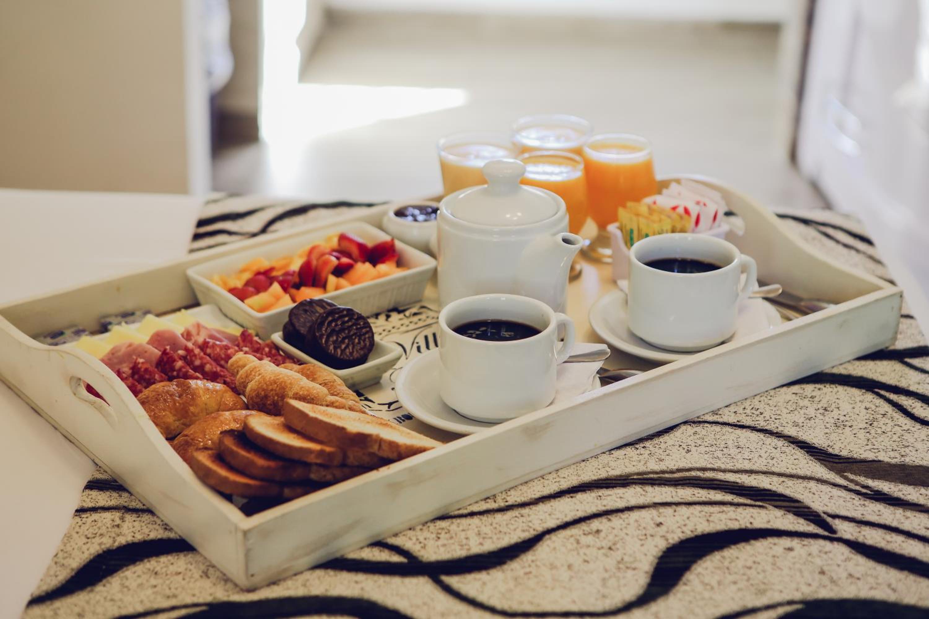 A La bandeja de Desayuno le faltan los platillos o platitos, para apoyar el pan y untar...no hay donde apoyar las media lunas o el pan mientras que uno esta comiendo. La mantequilla debe ser proporcional a los panes.