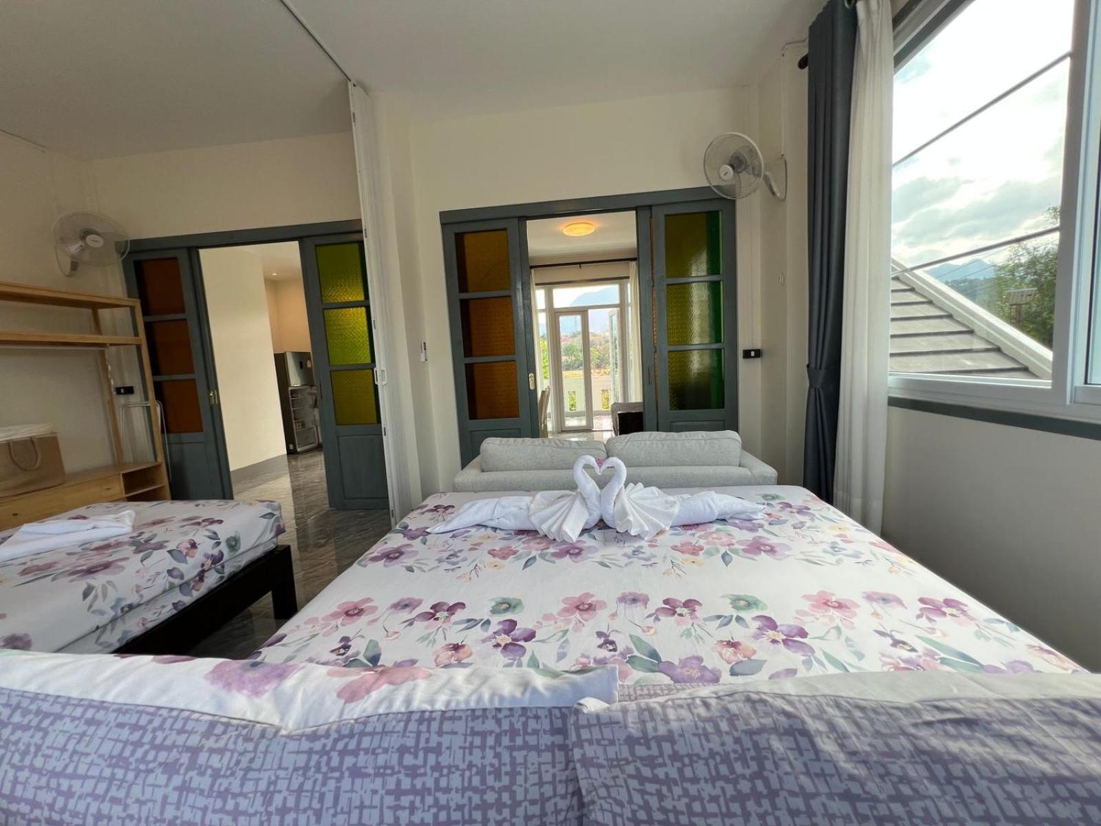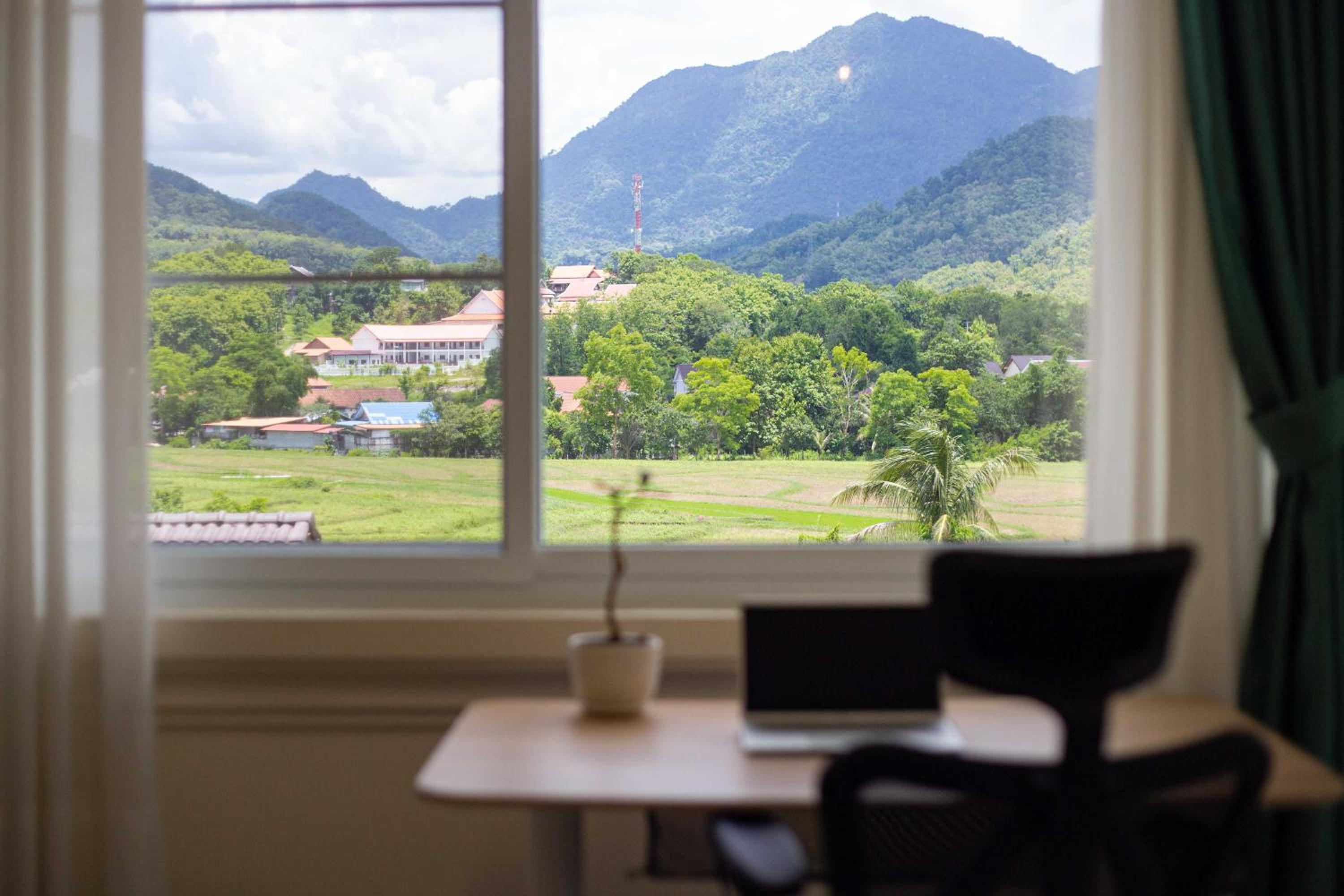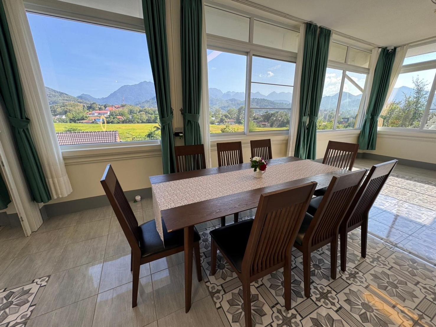 The location is a bit out of town, from the breakfast room a fabulous view over ricefields and mountains. The room is more an apartment with plenty space. We had one double bed and 2 singles for the children. There are harmonica dividers between sections so you can make separate rooms/compartments if you want to. The place is new and spotlessly clean. Khamsone and his wife go out of their way to make people's stay memorable! Nice outside terrace with cooking facilities (biogas!), where you can prepare your lunches and dinners if you don't want to eat out. Conference facility on-site. Breakfast typical Lao but with great flexibility to accomodate your wishes.