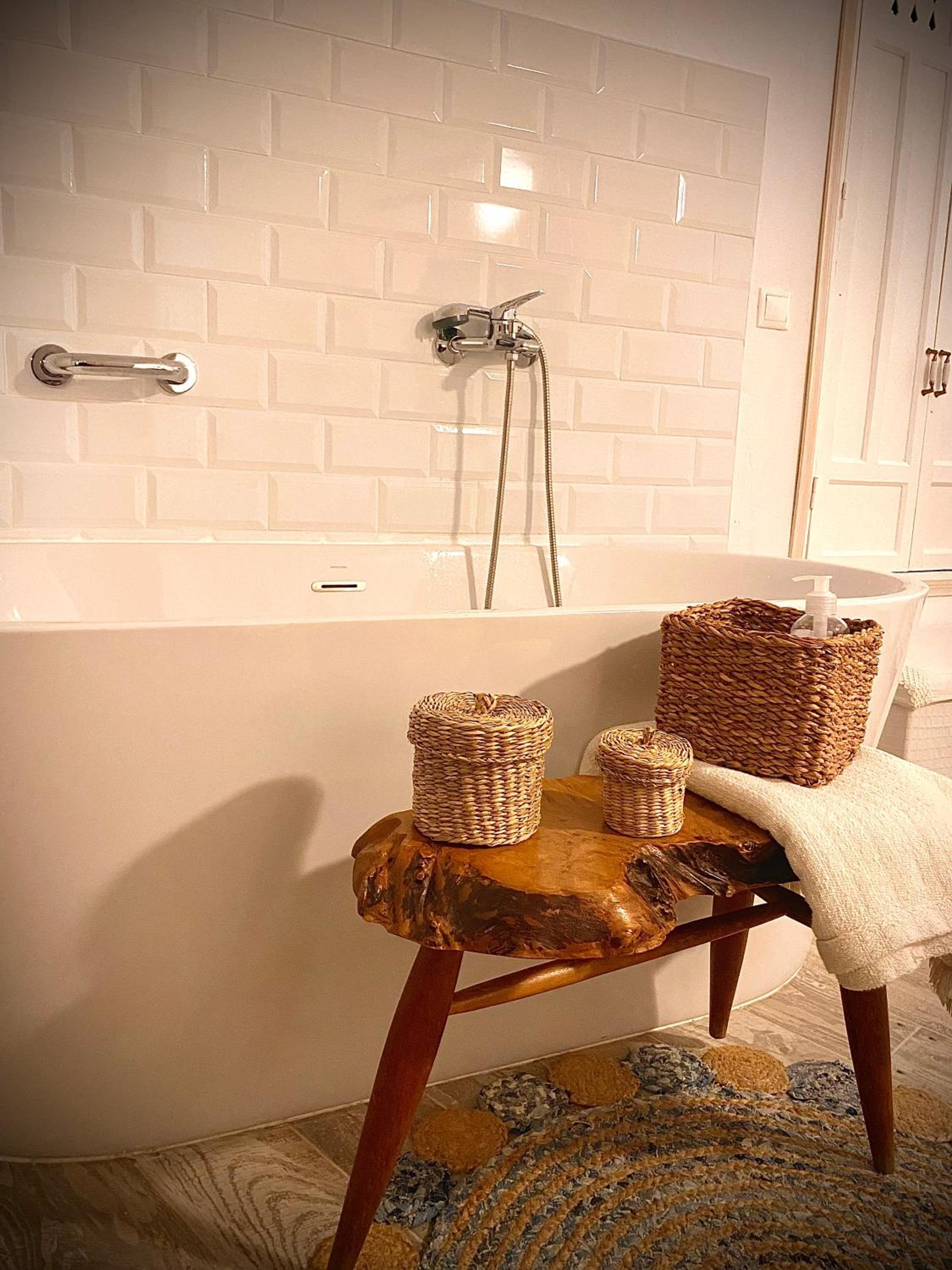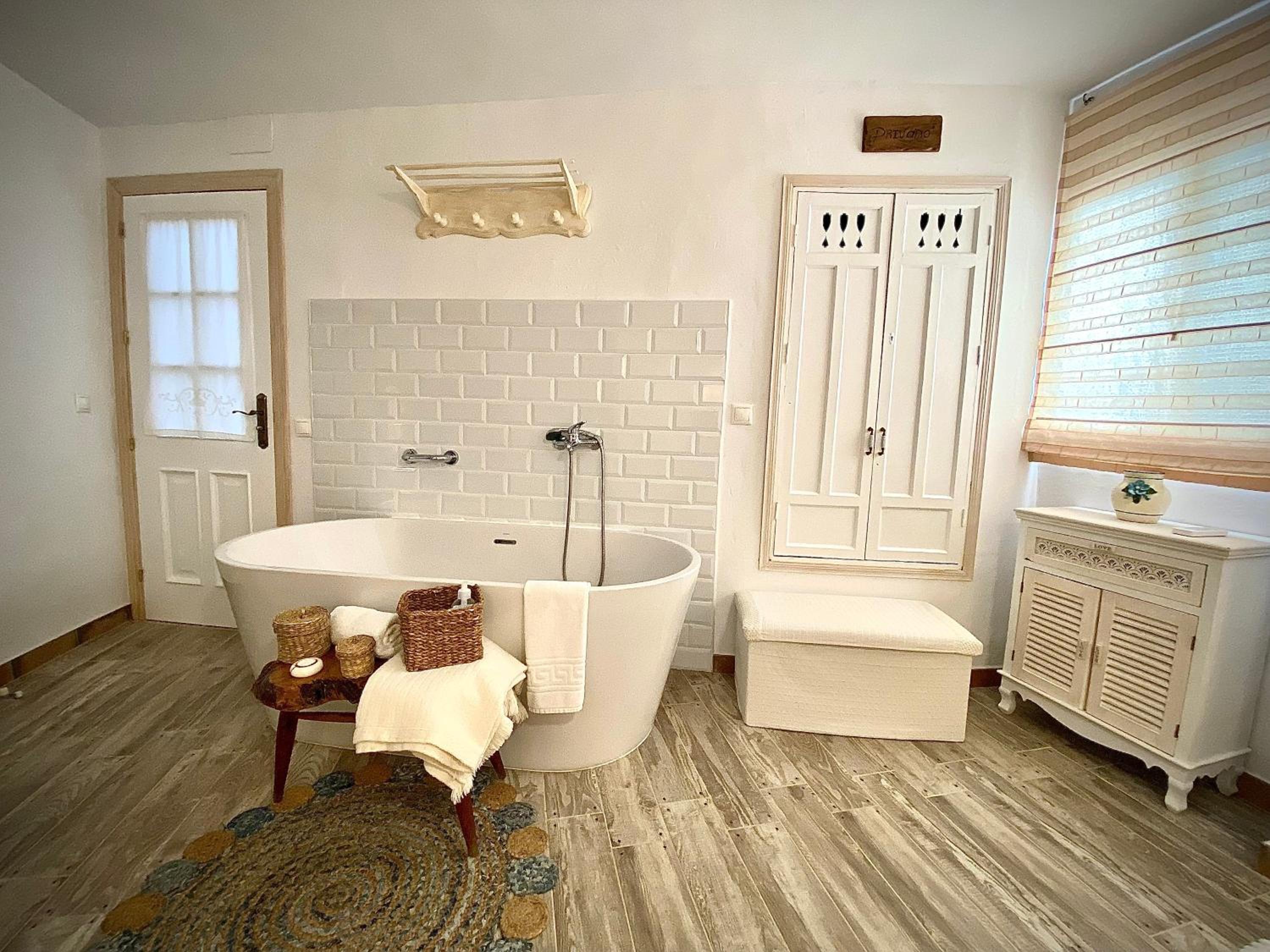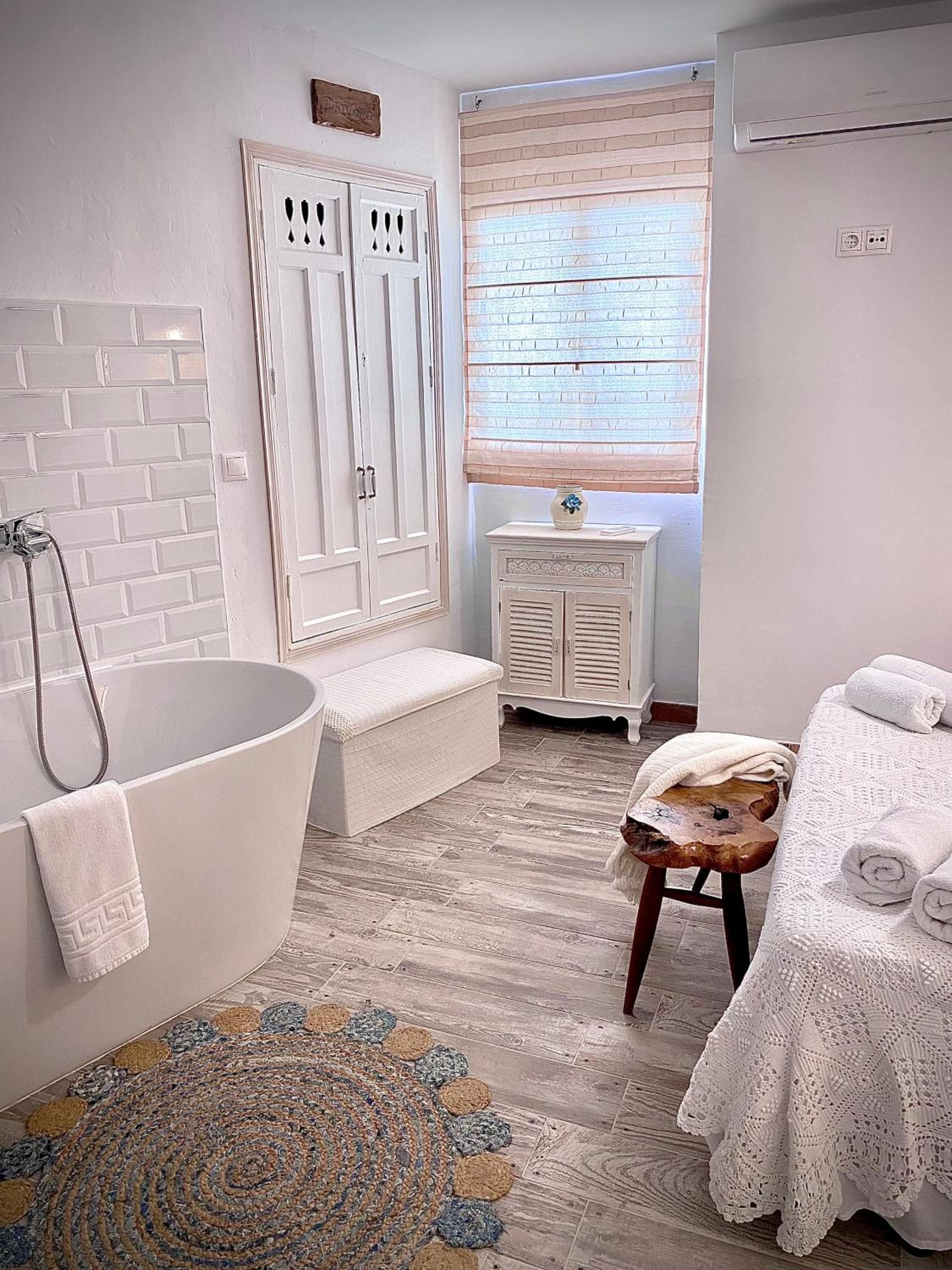 La bañera en la habitación y la cama muy cómoda