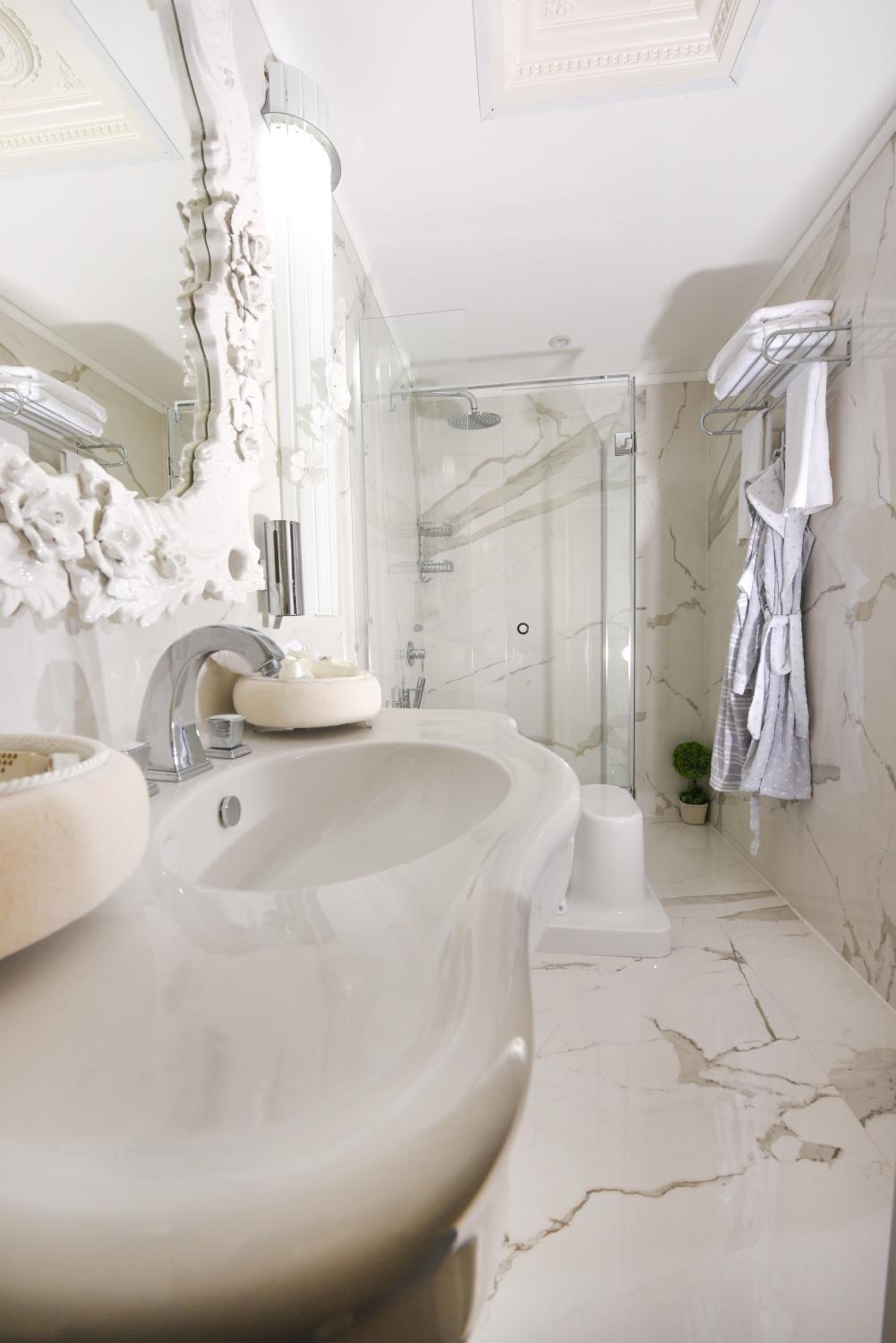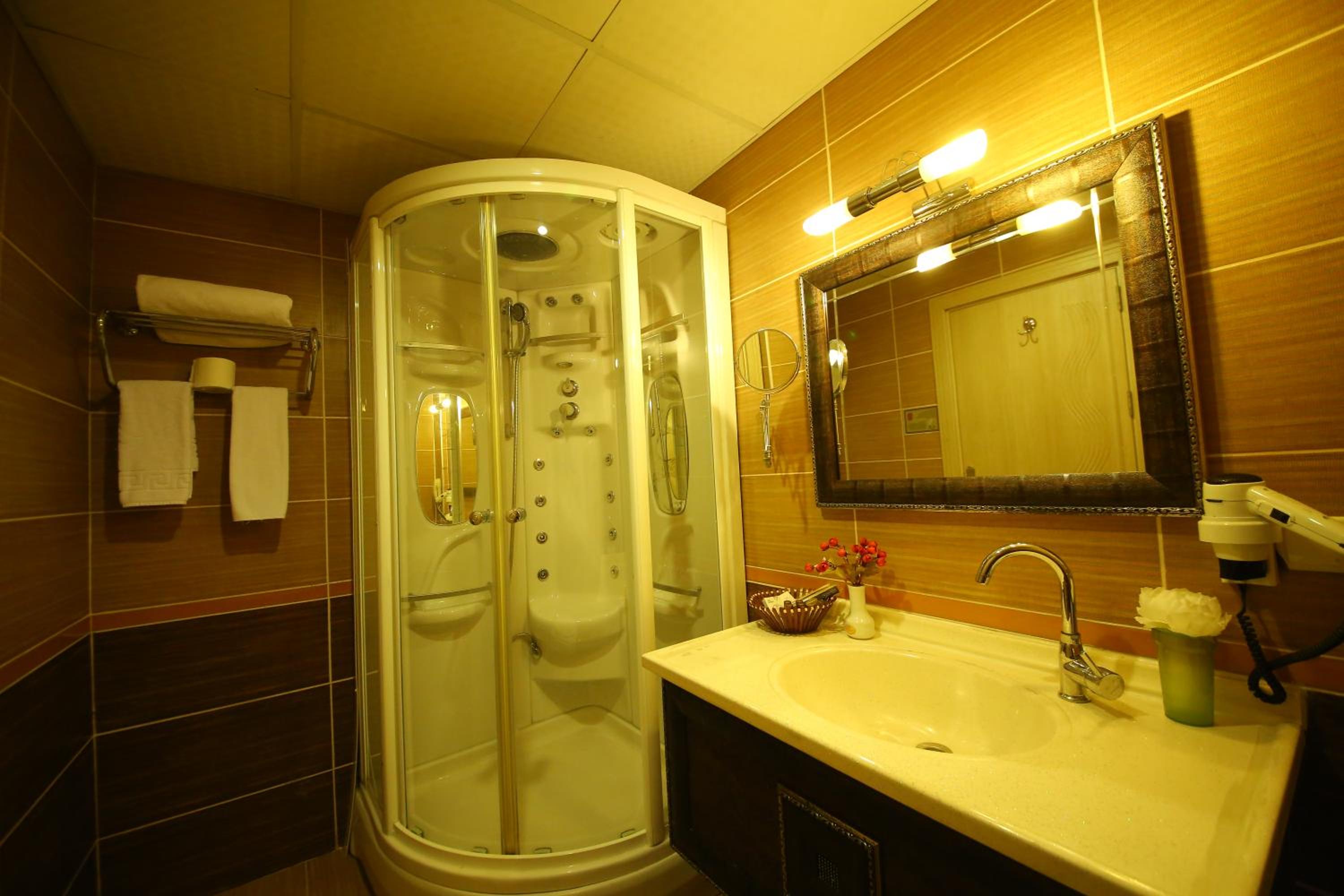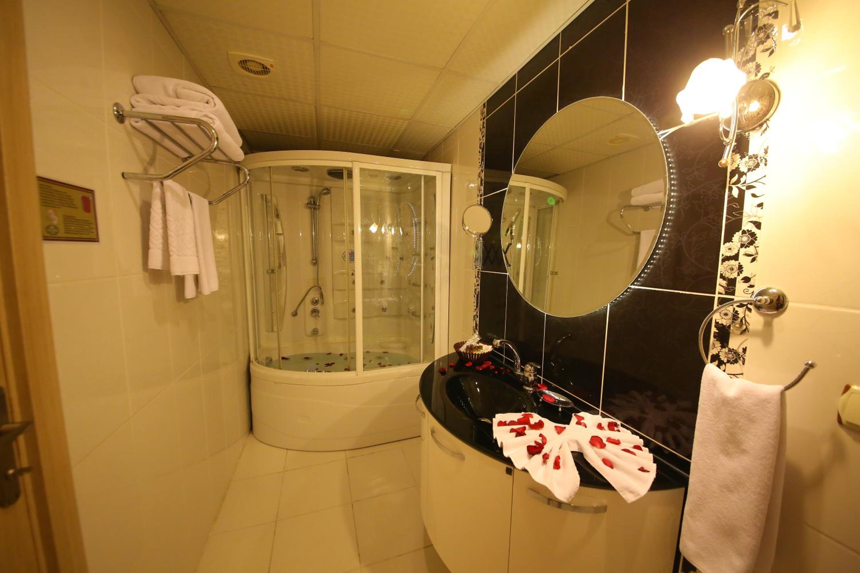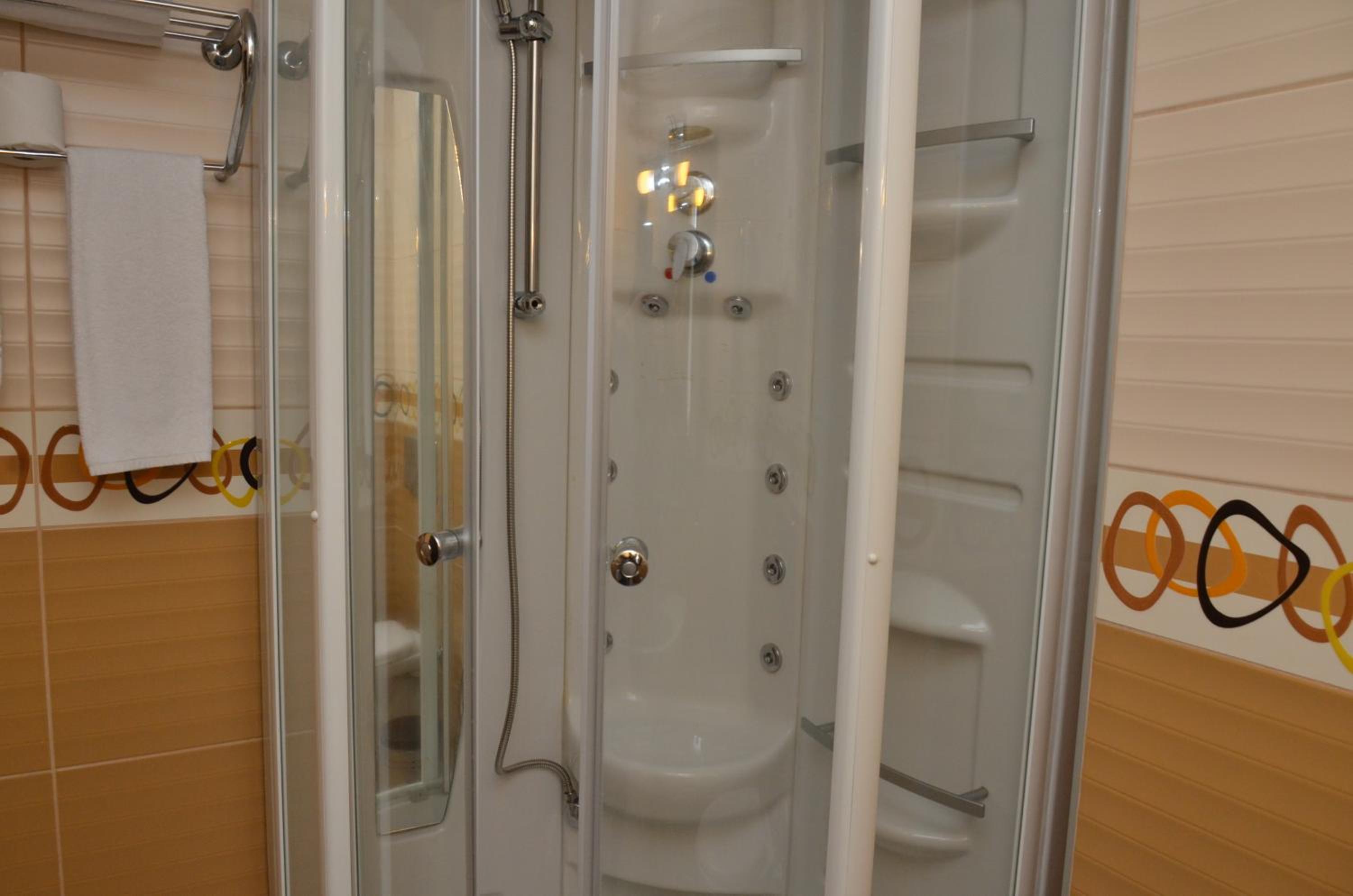 В ванной нет палочек для ушей, зубной щетки и пасты. Полотенца расчитаны на 1 раз и на одного посетителя. Комната не светлая, мало света.