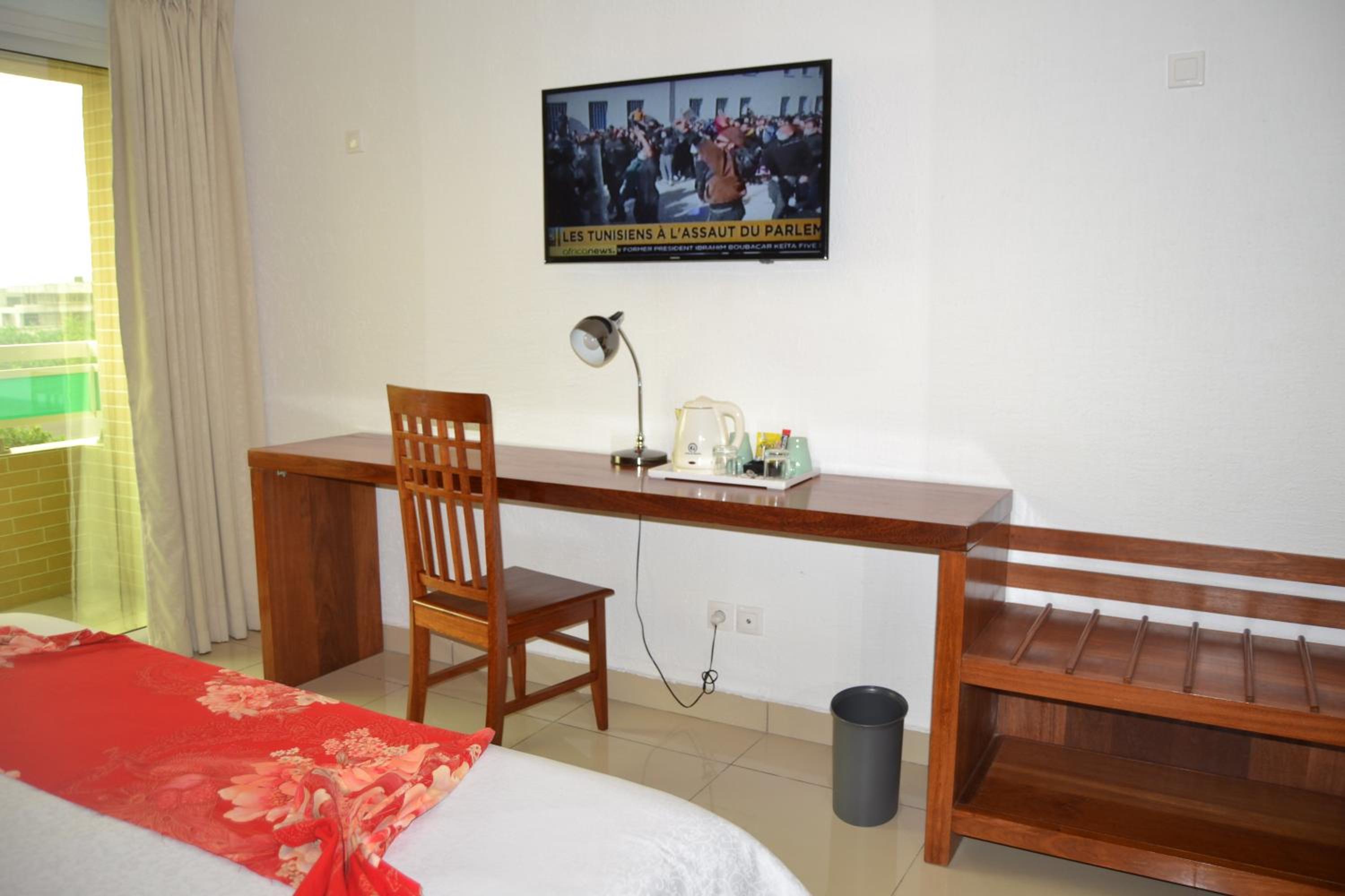Good hotel near the airport with the guards when you enter the road. Clean rooms with AC. Good food in the Hôtel restaurant. Possibility to pay for room with the card.