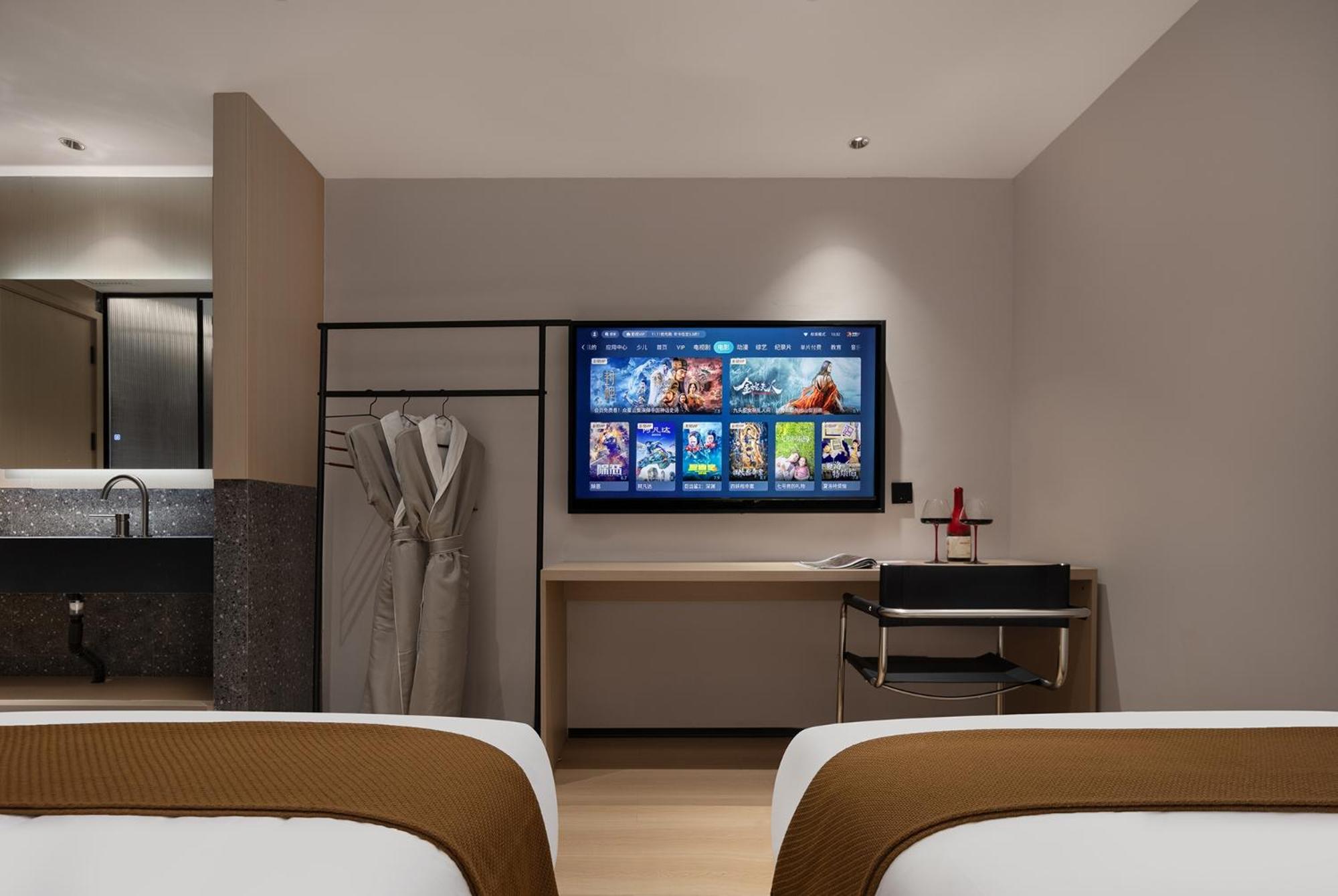 The room is incredibly spacious and modern, this was my favourite accommodation on my China trip. There are separate rooms for the toilet and shower, with towels, slippers and bathrobes provided. The toilet is automatic and the shower is extremely powerful. The mirror above the island sink has a back light and the curtains have a switch to close them and they block out the light very well. The bed and TV are very large.