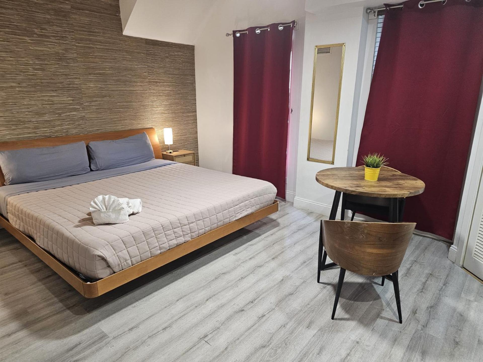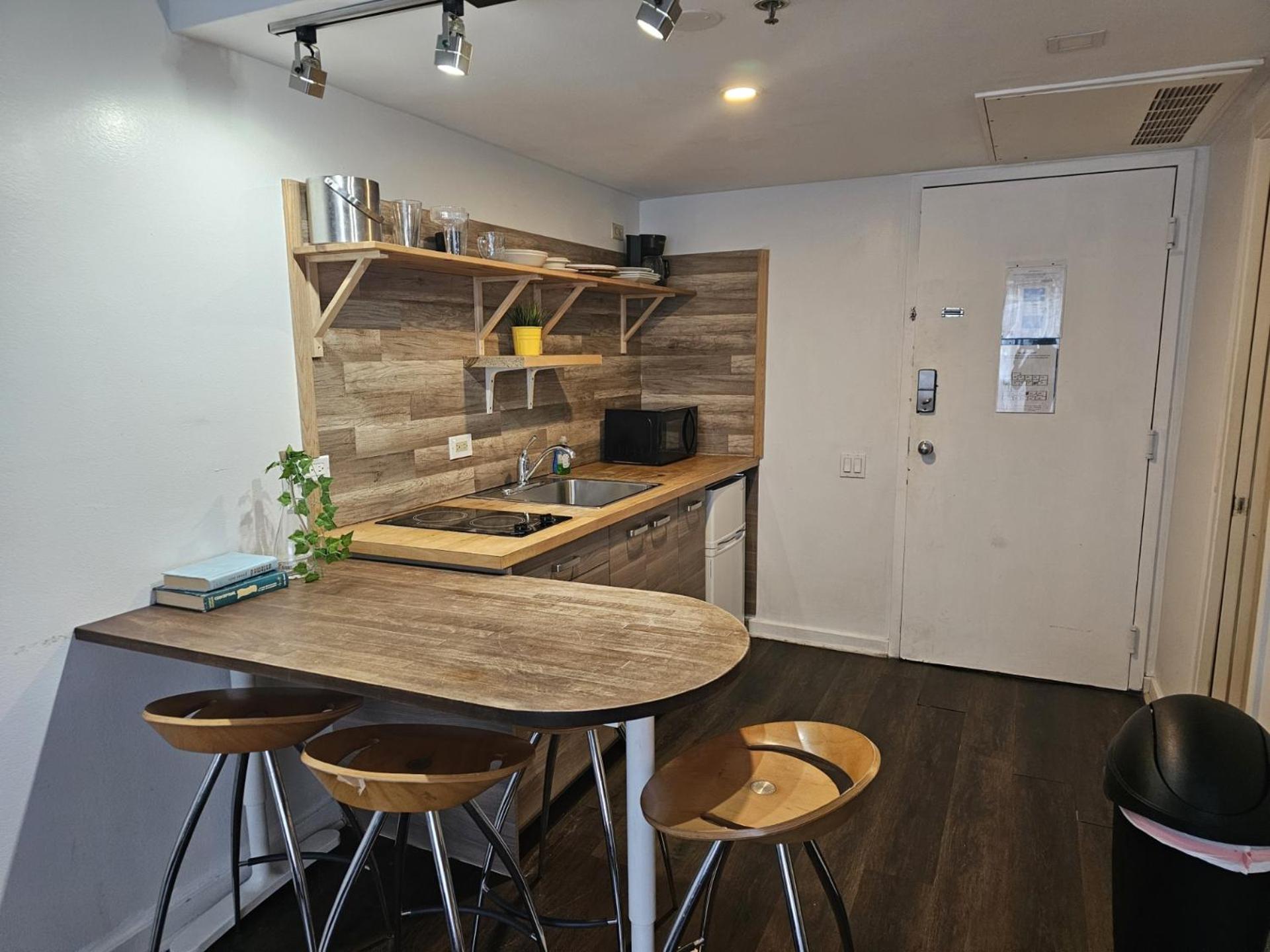 The suite had a kettle, pots, pans, plates, bowls, utensils, and glasses/mugs, etc. It was enough to cook in the suite and maybe go out for dinner once in a while. The room had beach chairs and an umbrella, ensuring a comfortable beach experience. The property is really close to Target, CVS, Walgreens, and other stores. It is on a quiet side of Miami Beach, so we had a good night's sleep.