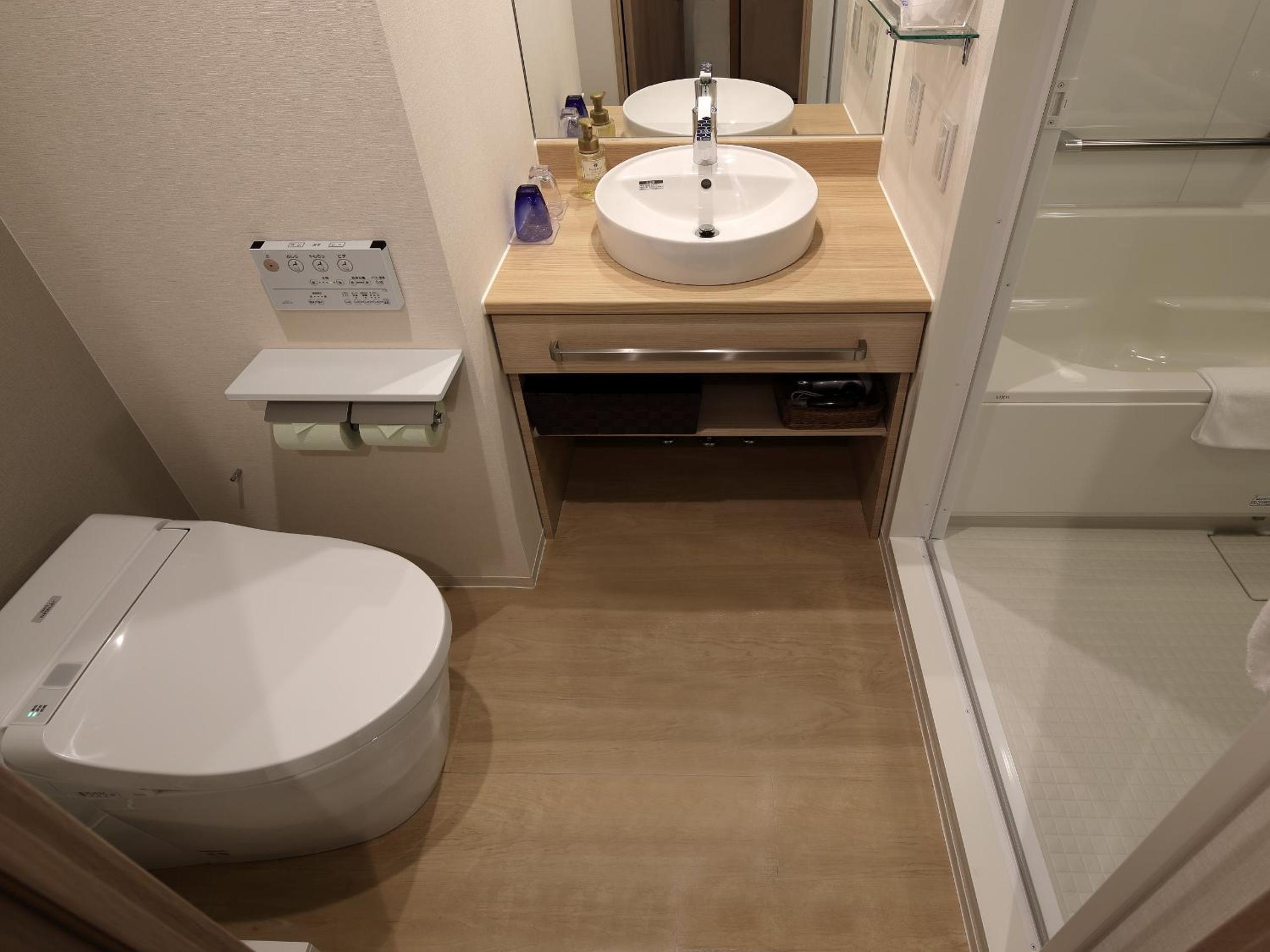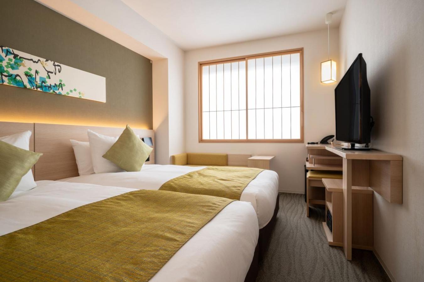 Hotel Vista Premio Kyoto Nagomi tei offers air-conditioned rooms with modern amenities including flat-screen TVs, safety deposit boxes, and elegant bathrooms. Relax in comfort with plush bed linens and complimentary toiletries provided in each room.