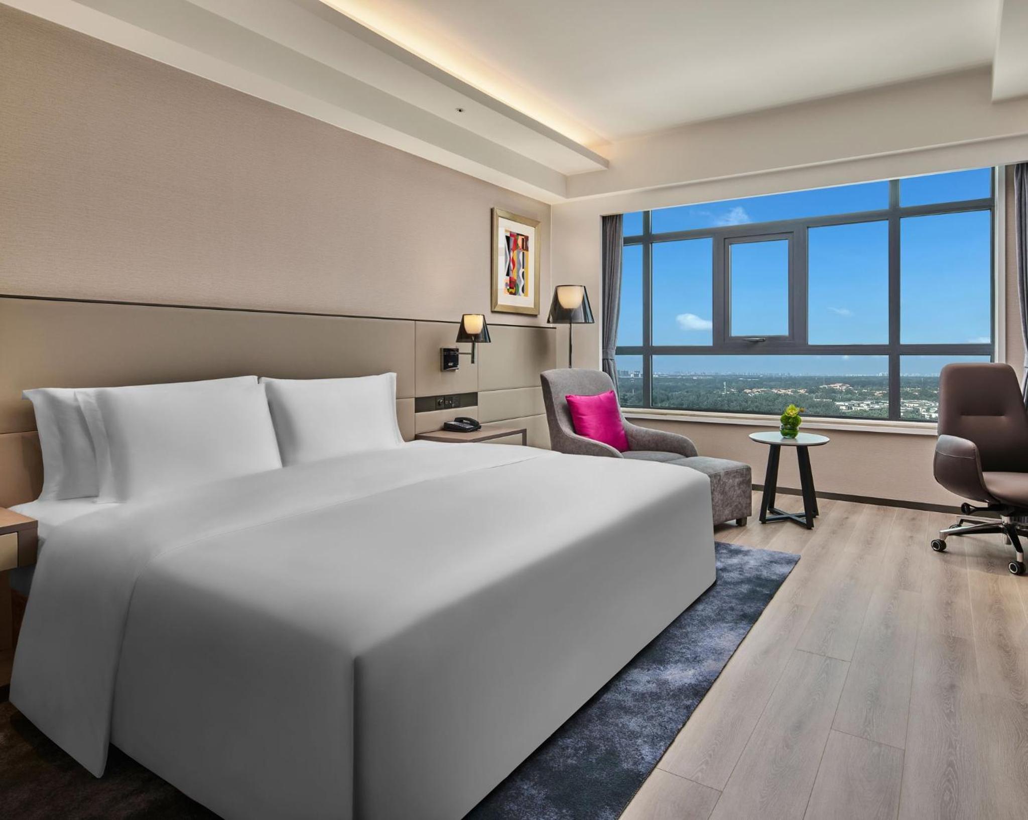 Crowne Plaza Beijing International Airport offers elegantly designed rooms with modern amenities, including flat-screen TVs and premium furnishings. The floor-to-ceiling windows provide stunning views and the ample work space ensures a comfortable stay.