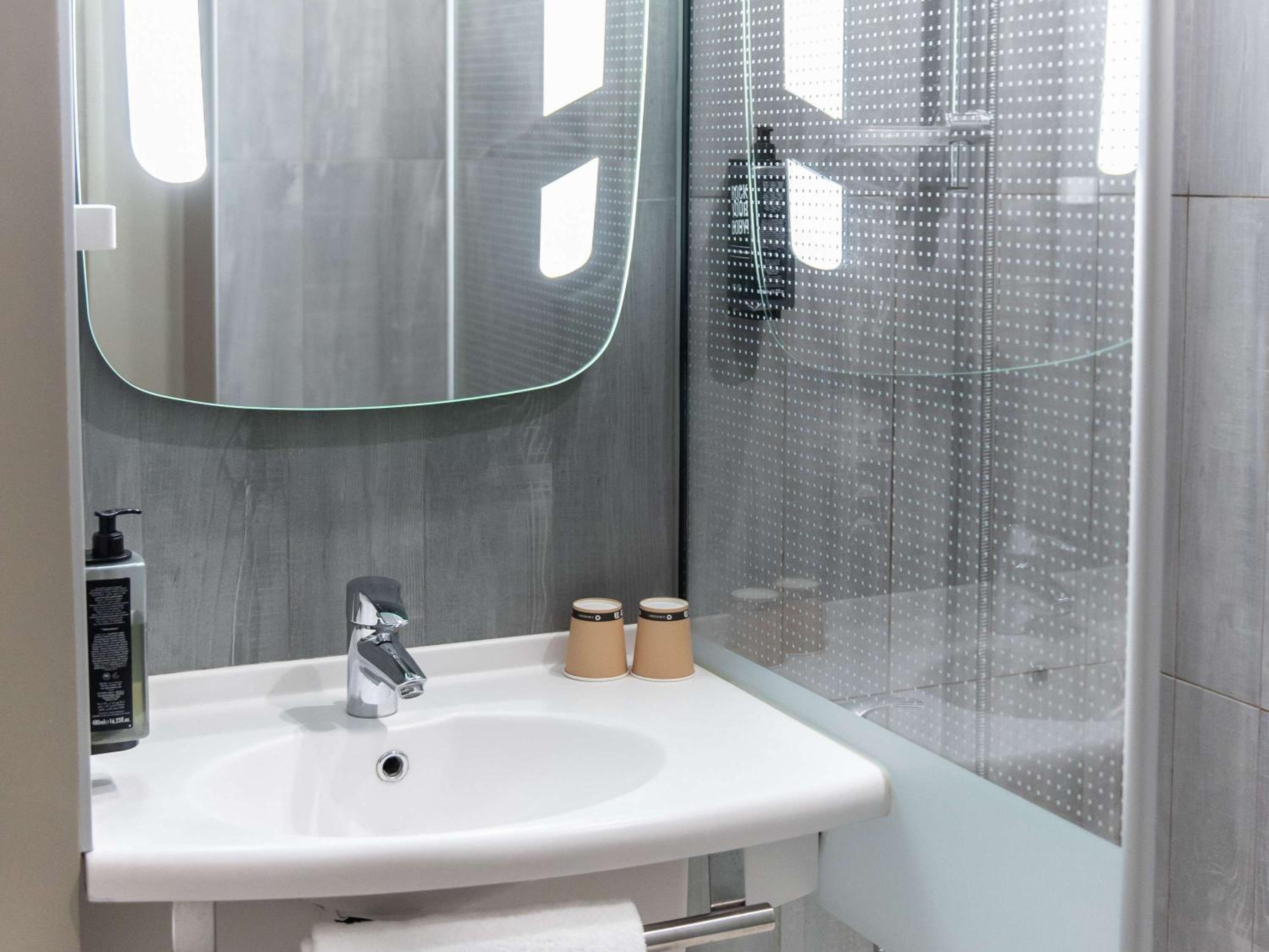 Super chambre, douche très jolie et pratique. Et que dire du petit déjeuner très copieux, bcp de choix ! Salle spacieuse.. merci de nous avoir laissé jouer au baby-foot ..