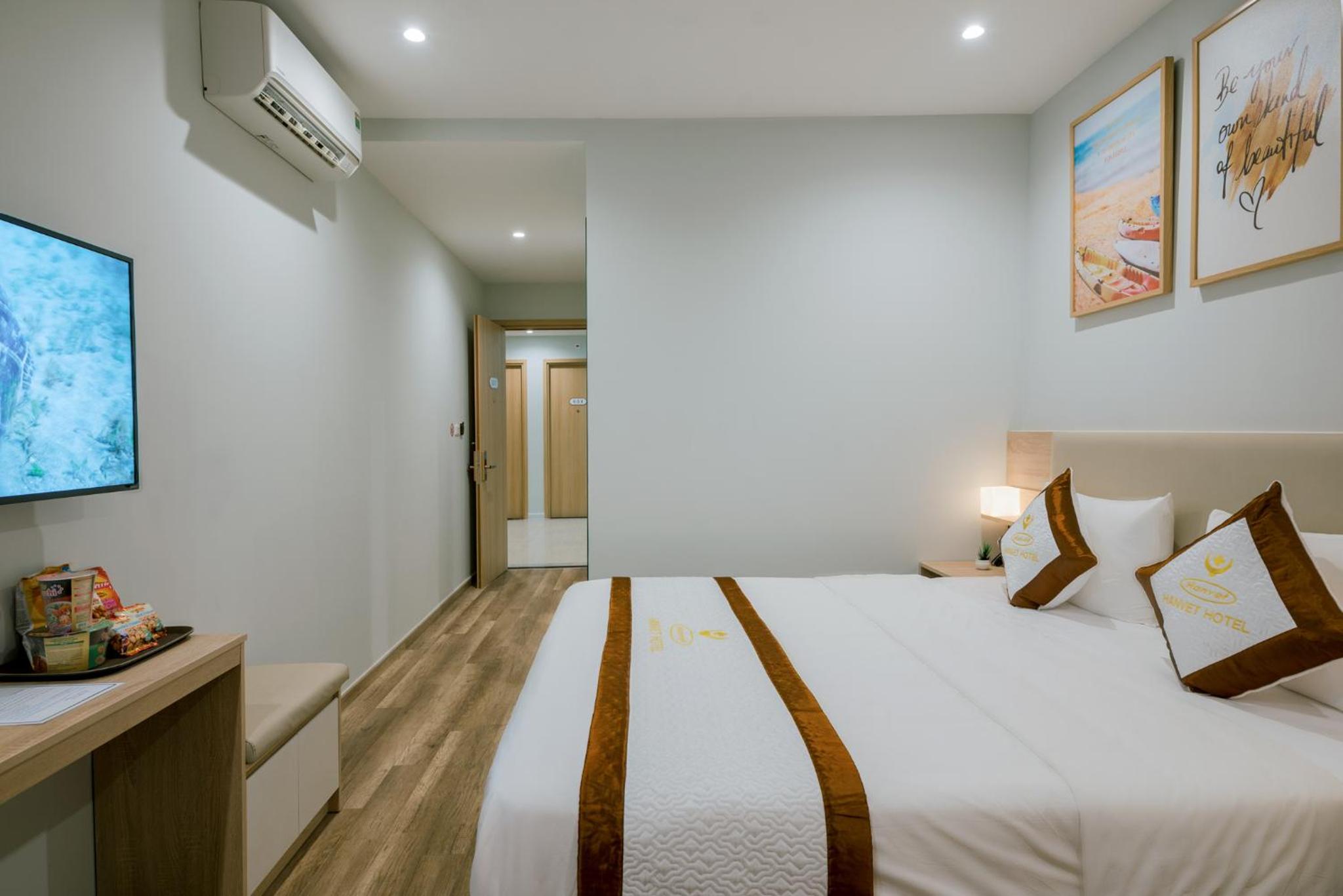 Hanvet Hotel Phu Quoc offers a luxurious stay with well-equipped guest rooms featuring modern amenities like flat-screen TVs, air conditioning, and private bathrooms. Some rooms even boast balconies for a breathtaking view.