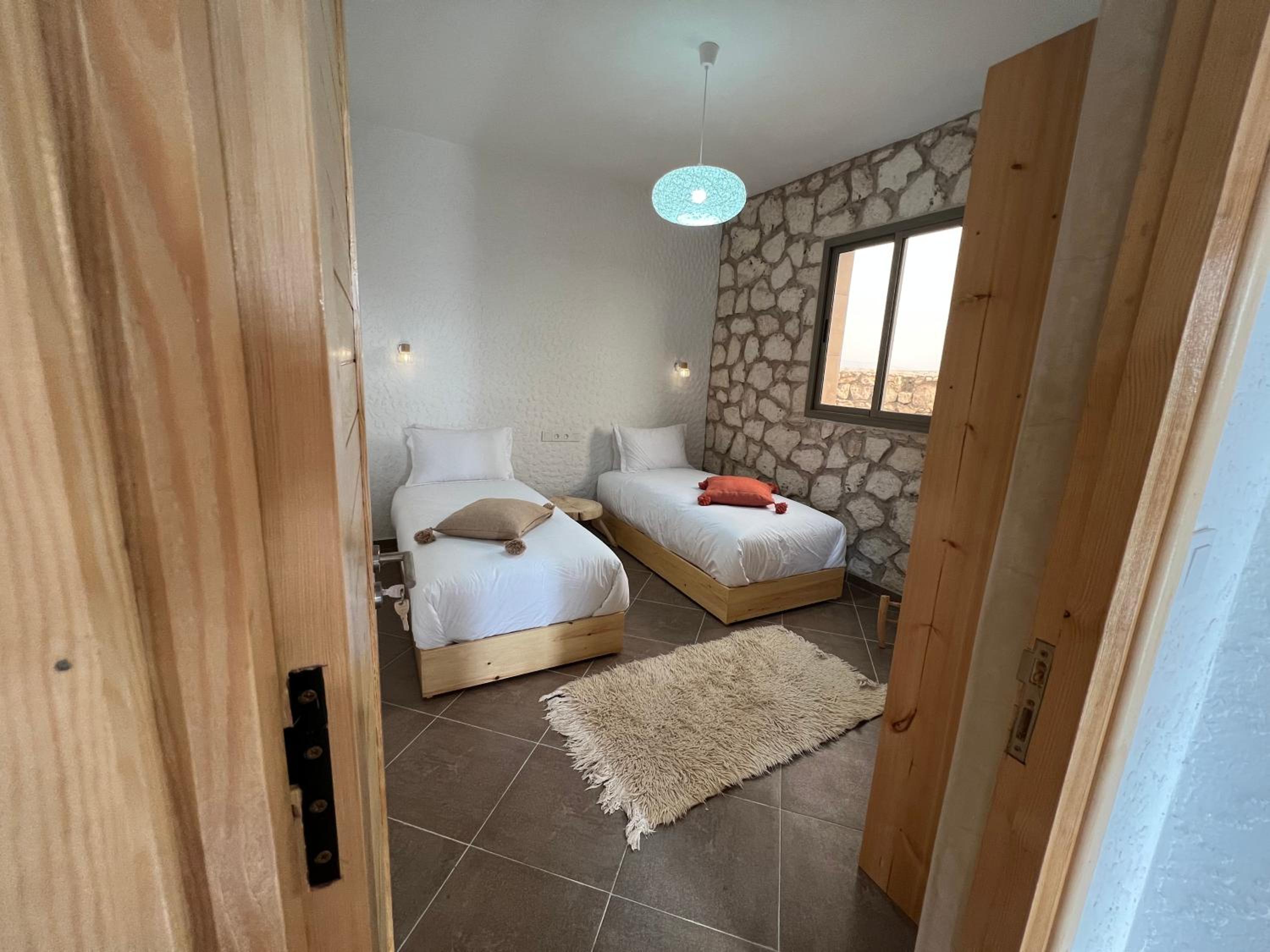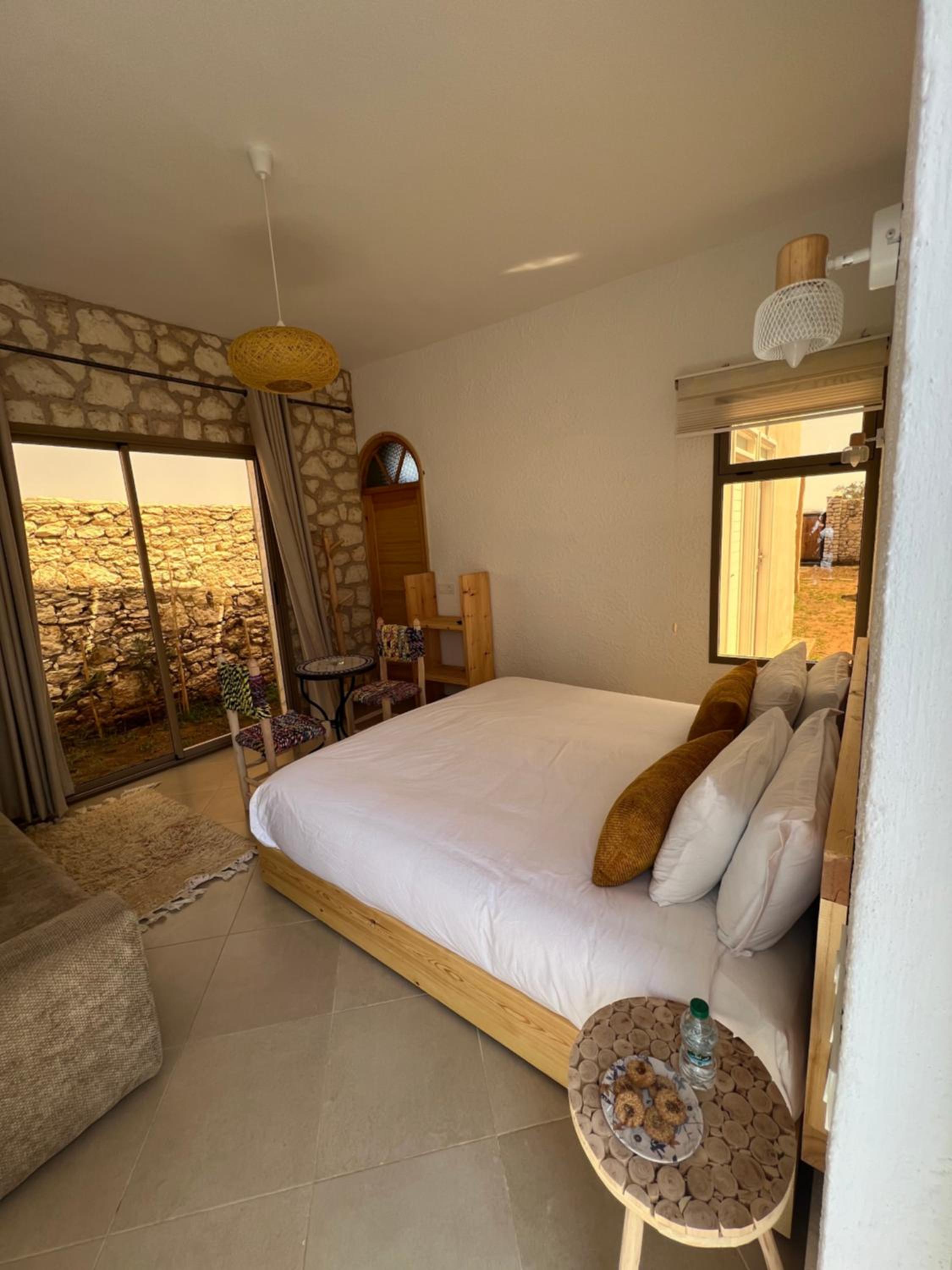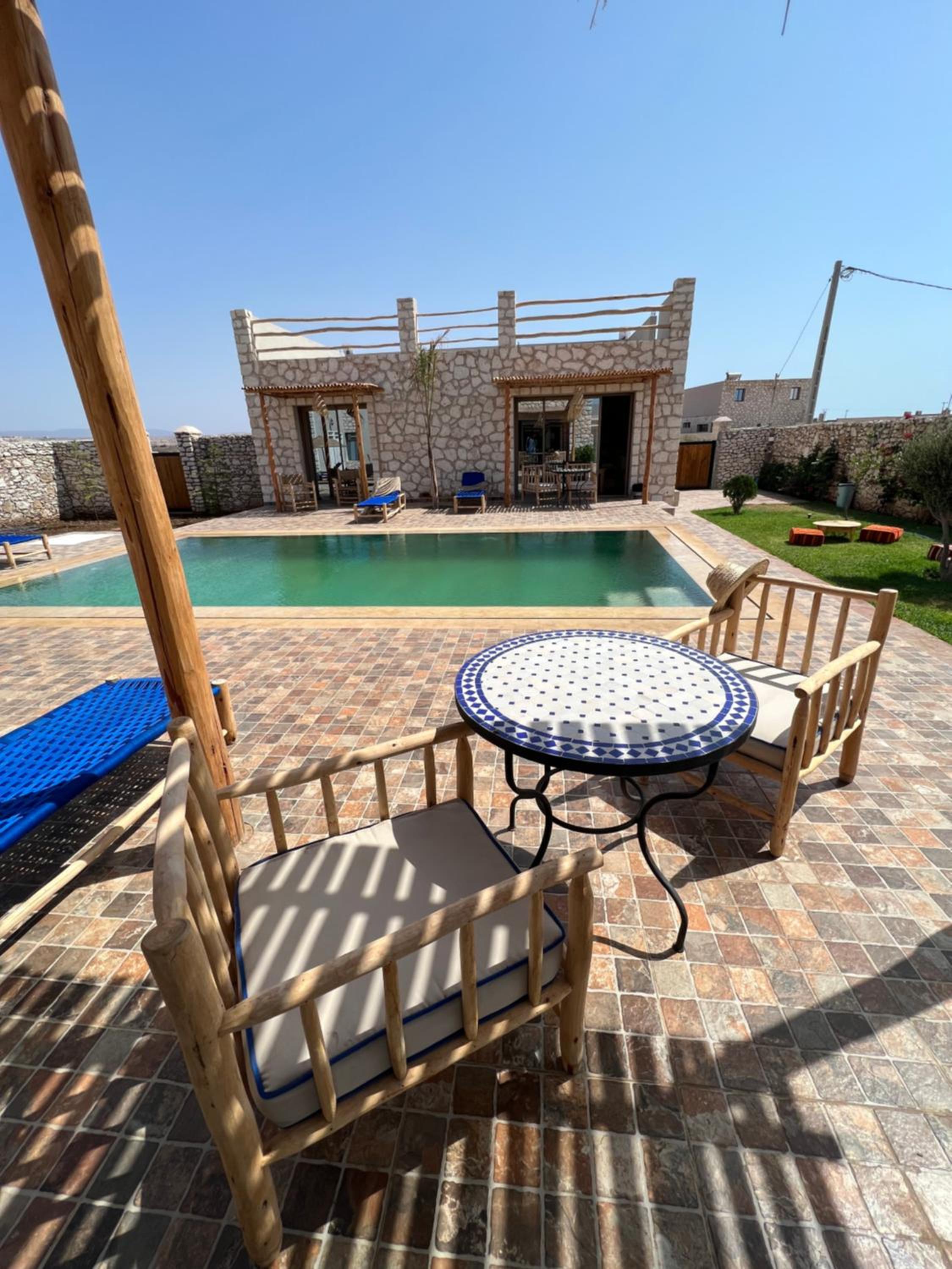 Spacious 2 bed property with sunloungers and pool. Just a 10 min walk to the beach, restaurants, surf schools and shops. We caught the bus to Essaouira. We paid extra for breakfast which was delicious and plentiful. The managers were super helpful booking taxis and answering queries. There's no air con or fans but these are not necessary- there's a lovely cool breeze at night. We had a great stay!